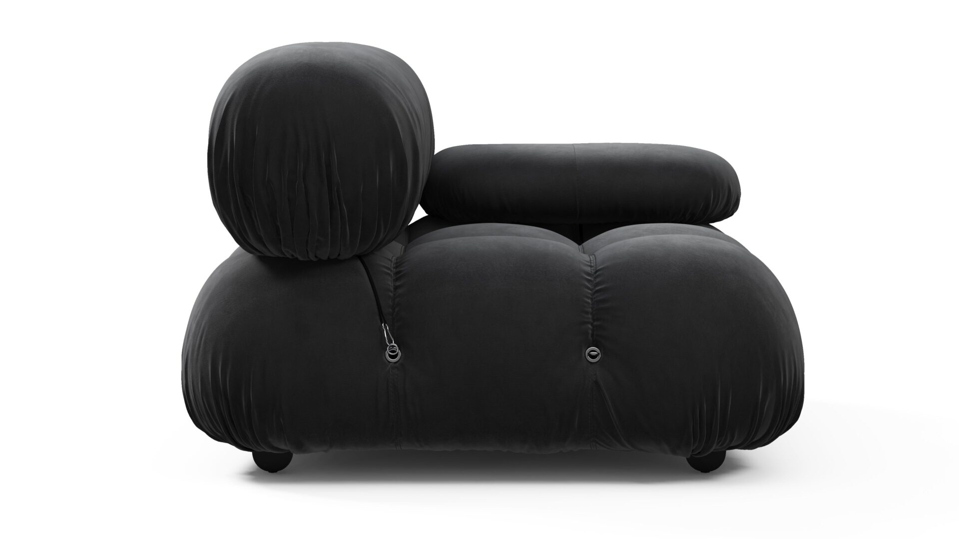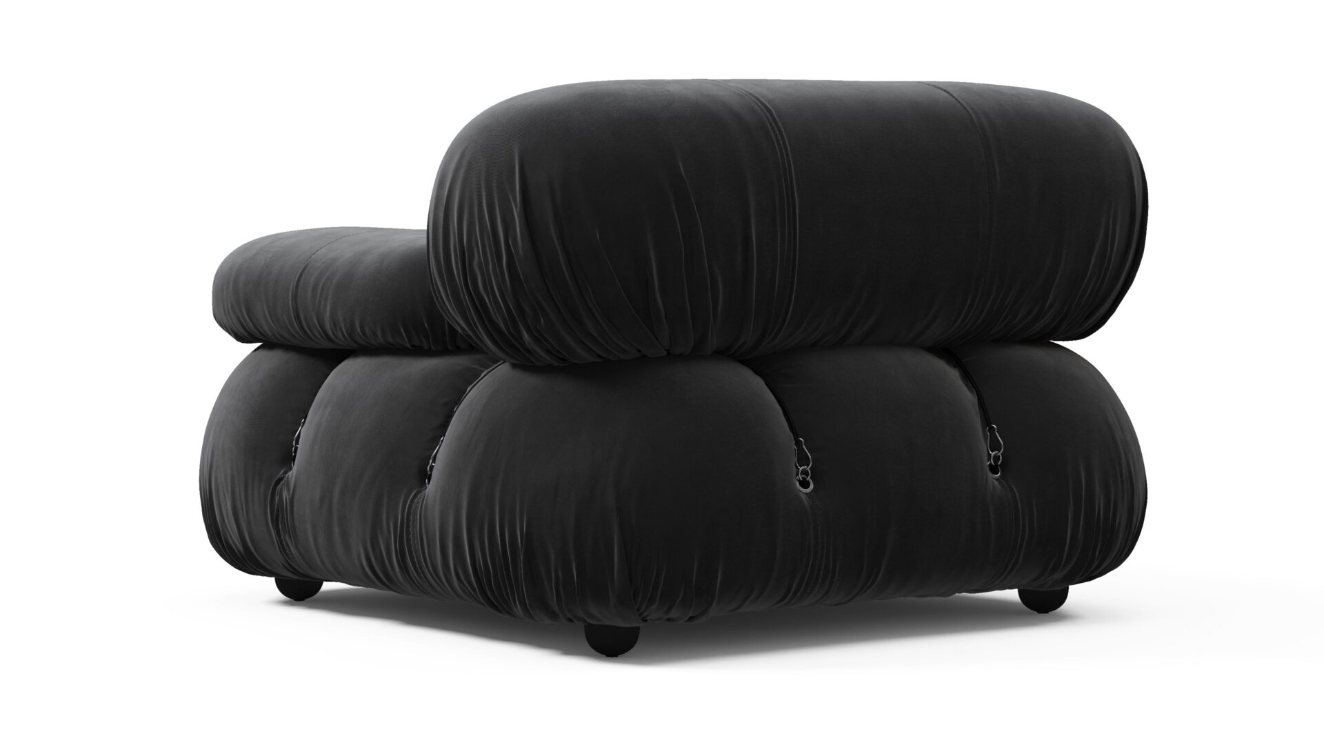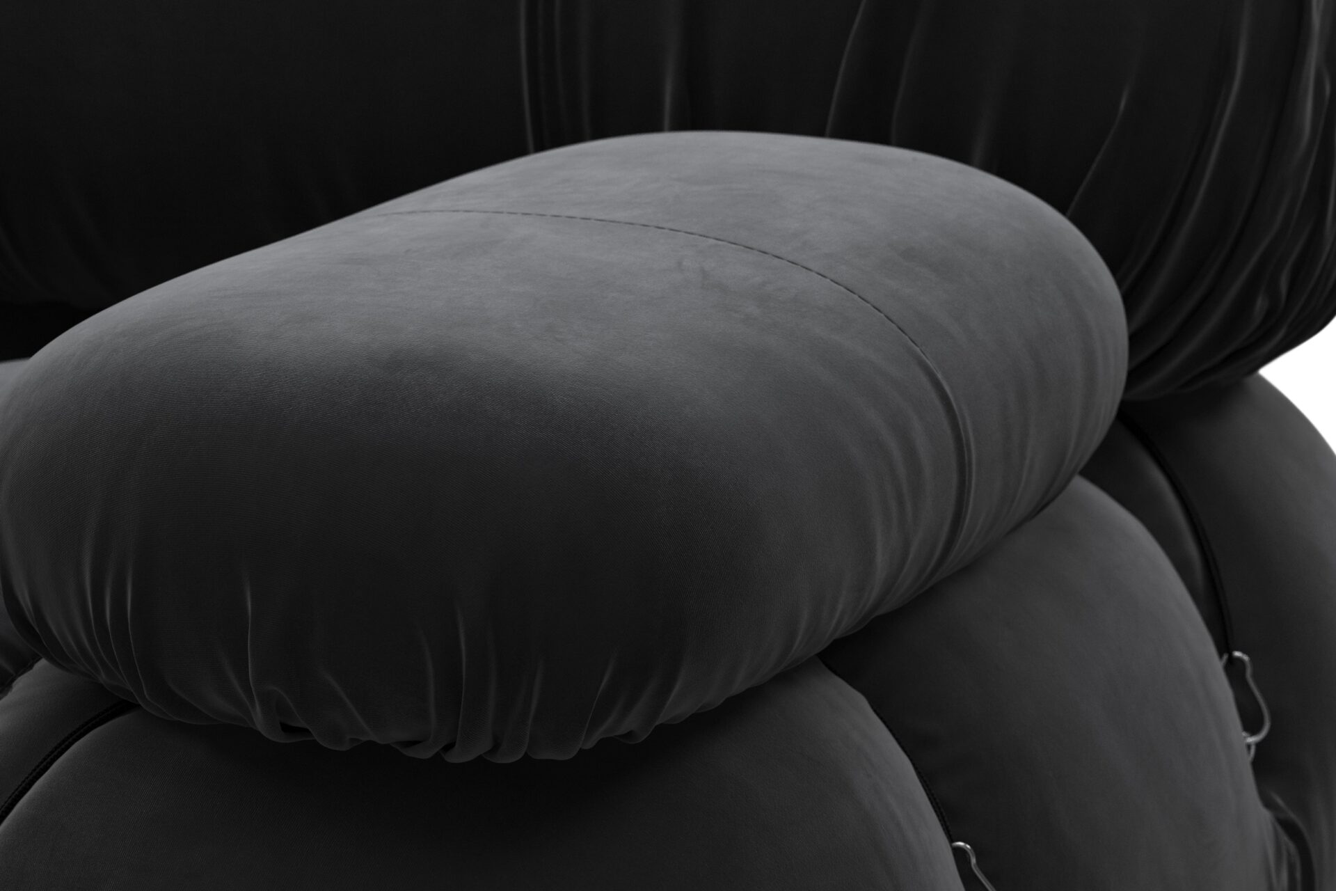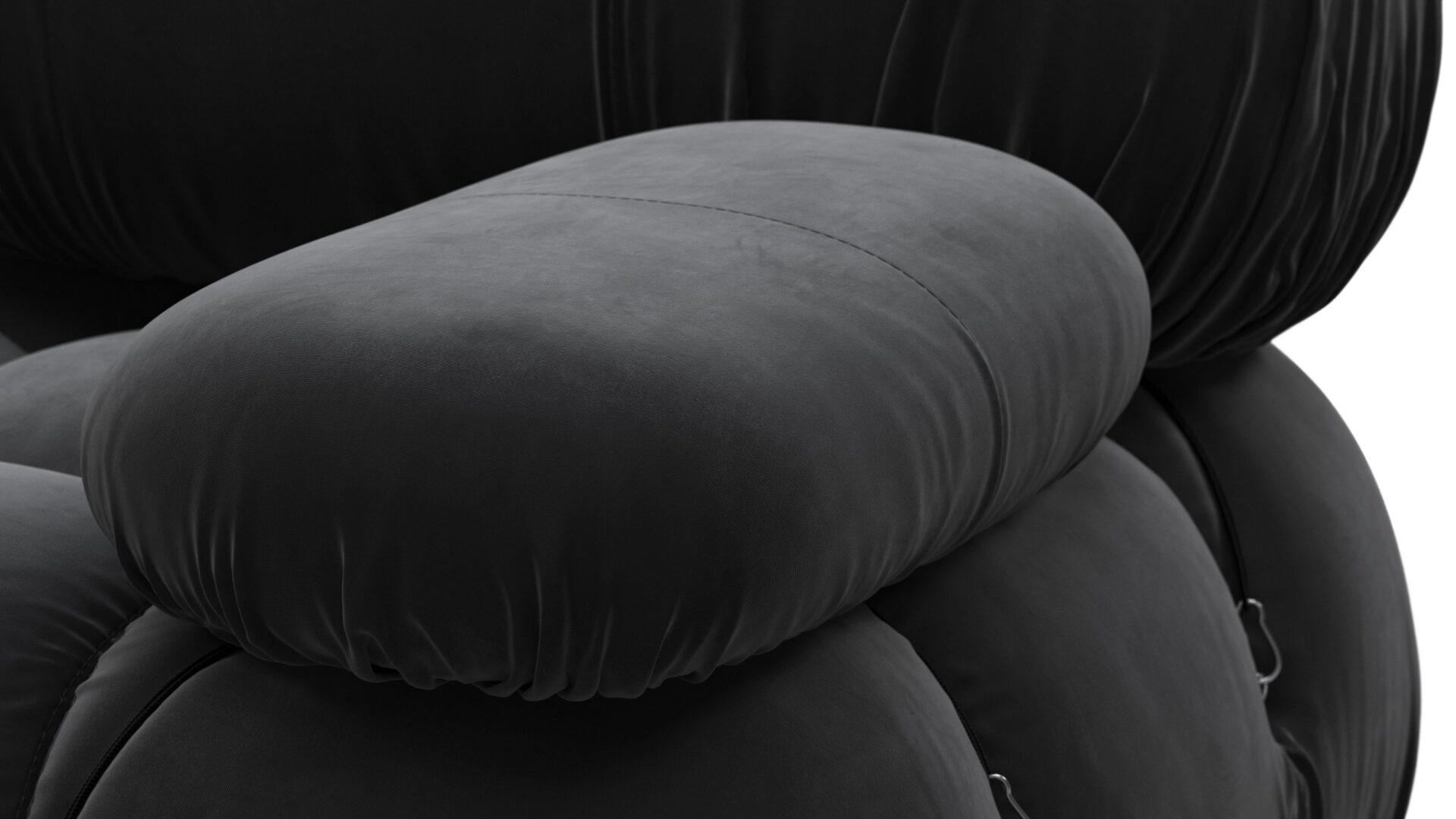 Step into the retro charm of the 1970s with the Bellini sectional sofa, embodying a spirit of liberation with its modular design and versatile customization options. Embraced by a new generation, this black velvet masterpiece features tie rods and rings for easy rearrangement. Crafted with a sturdy wooden frame and plush cold-pressed foam, the low-profile silhouette exudes relaxed luxury, inviting you to unwind in style.