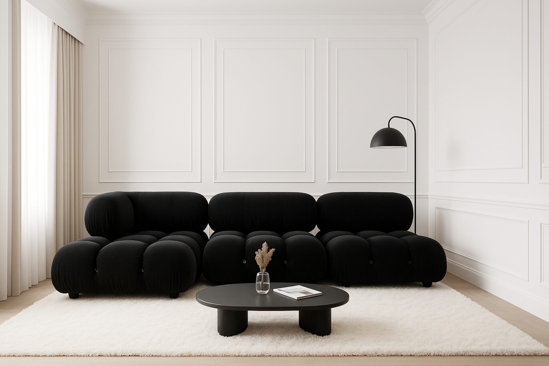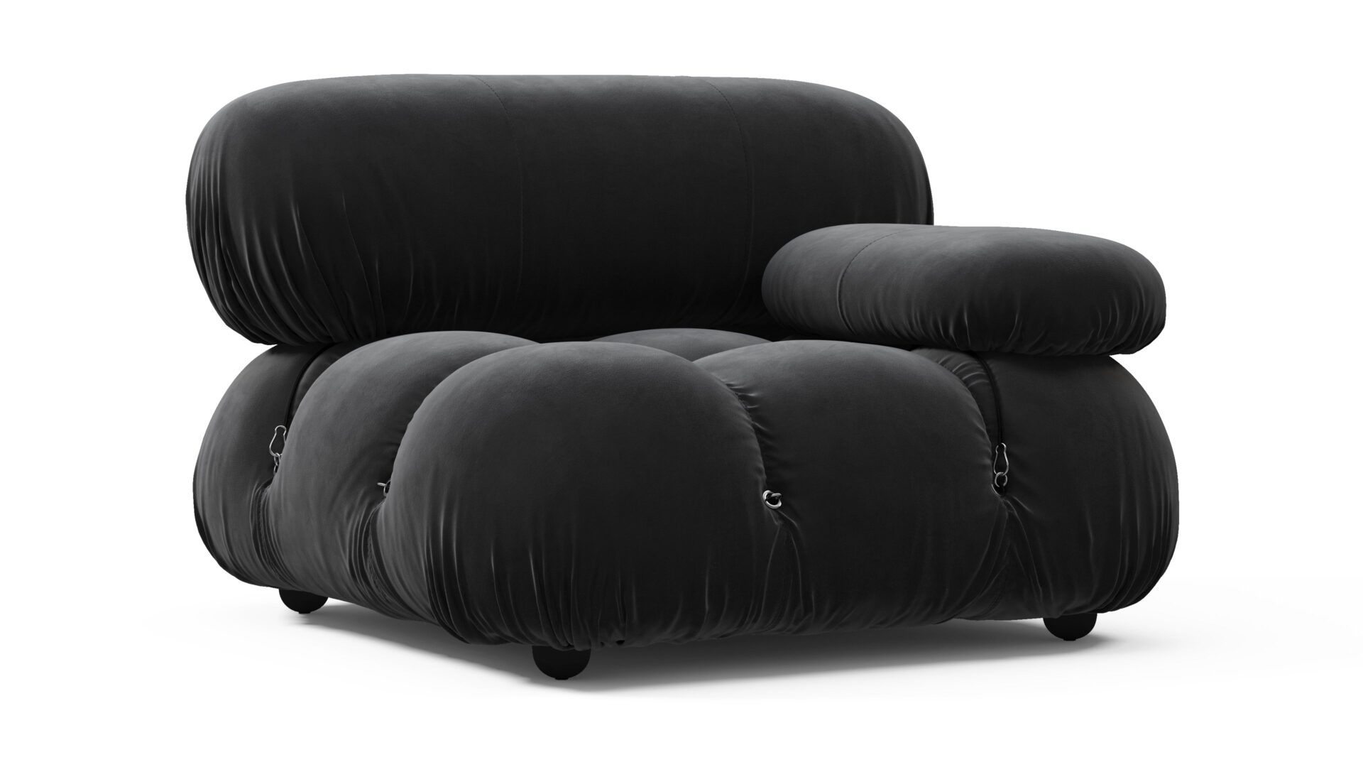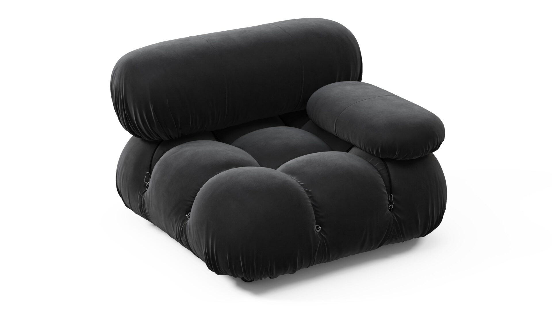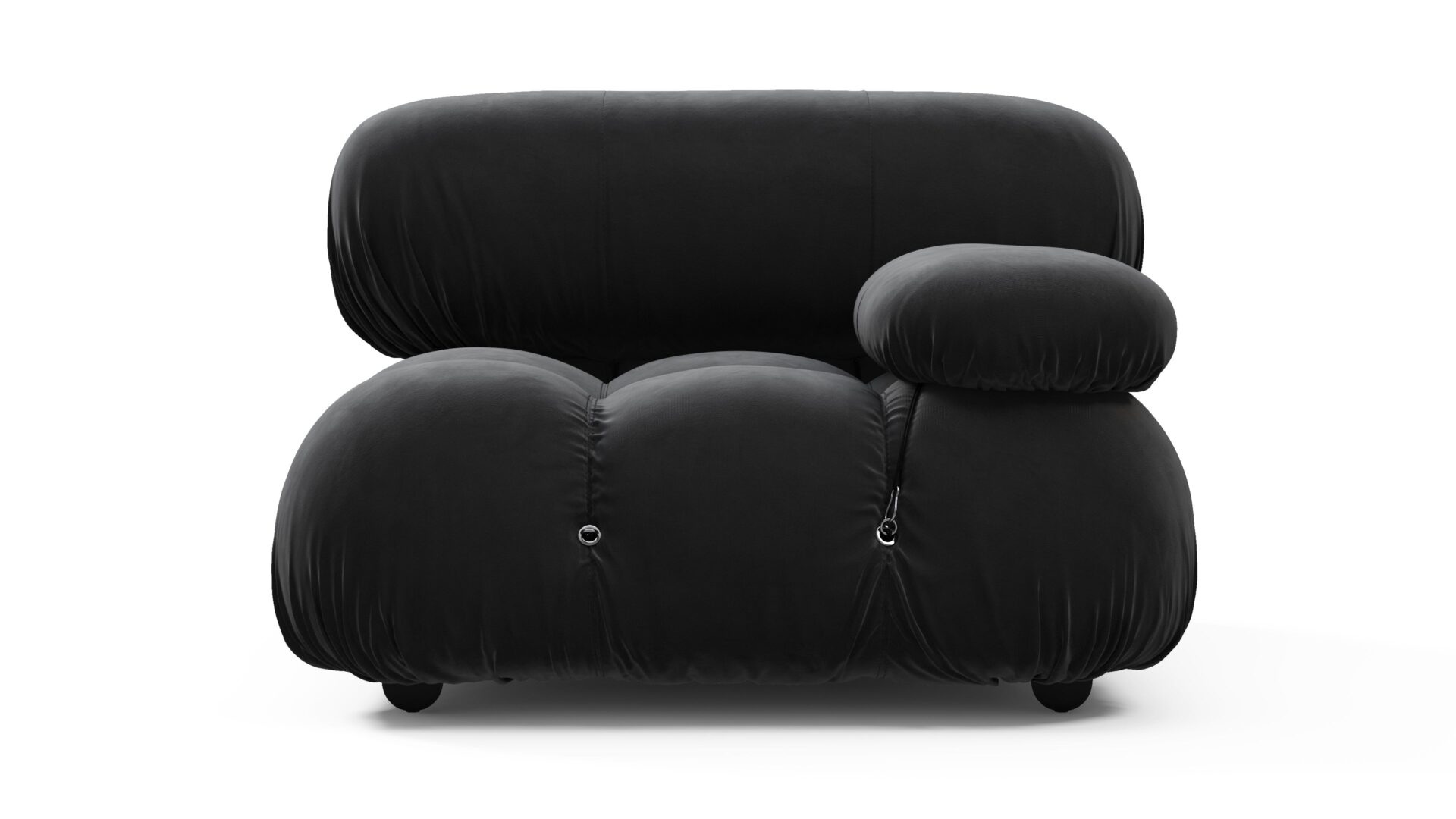 Step into the retro charm of the 1970s with the Bellini sectional sofa, embodying a spirit of liberation with its modular design and versatile customization options. Embraced by a new generation, this black velvet masterpiece features tie rods and rings for easy rearrangement. Crafted with a sturdy wooden frame and plush cold-pressed foam, the low-profile silhouette exudes relaxed luxury, inviting you to unwind in style.