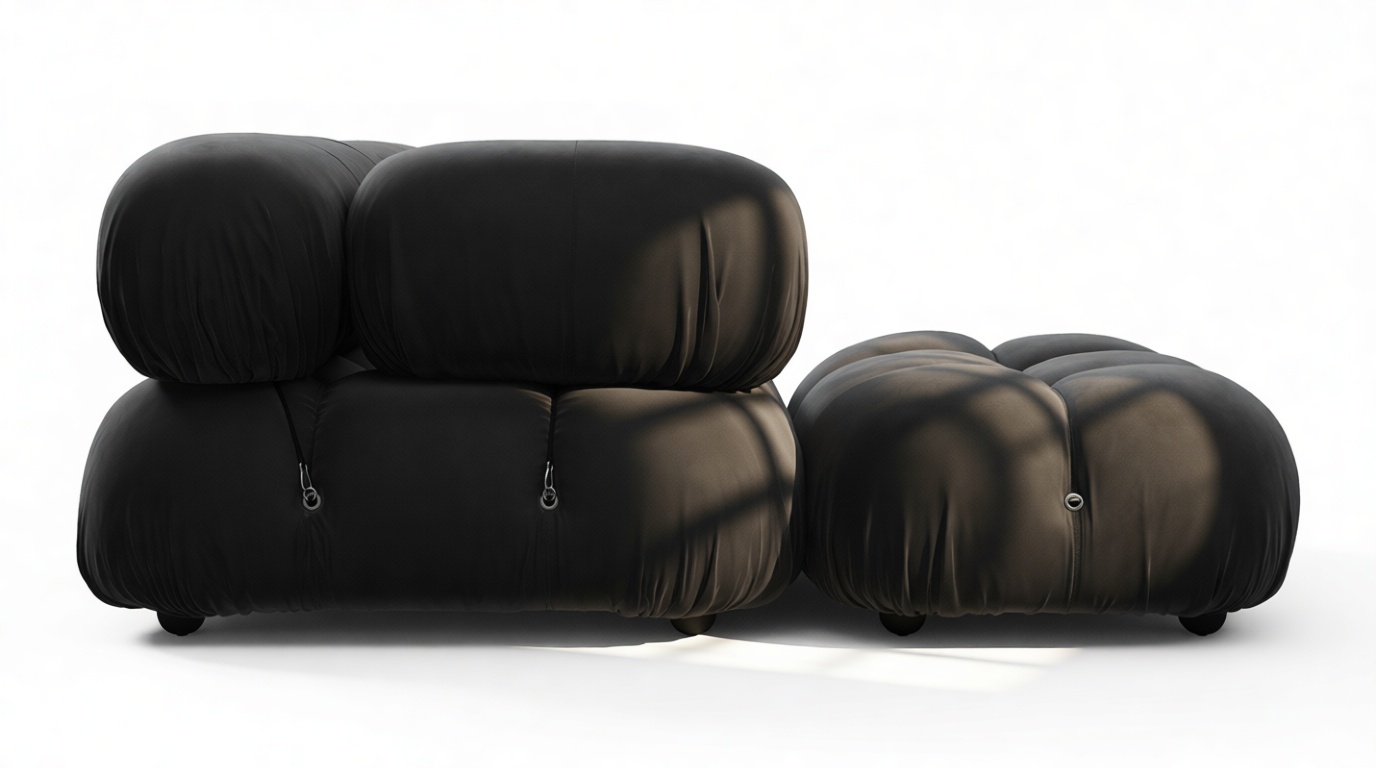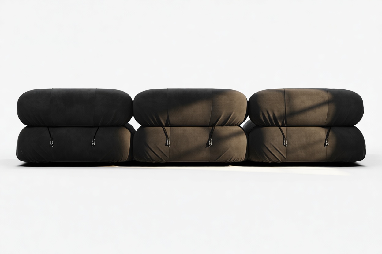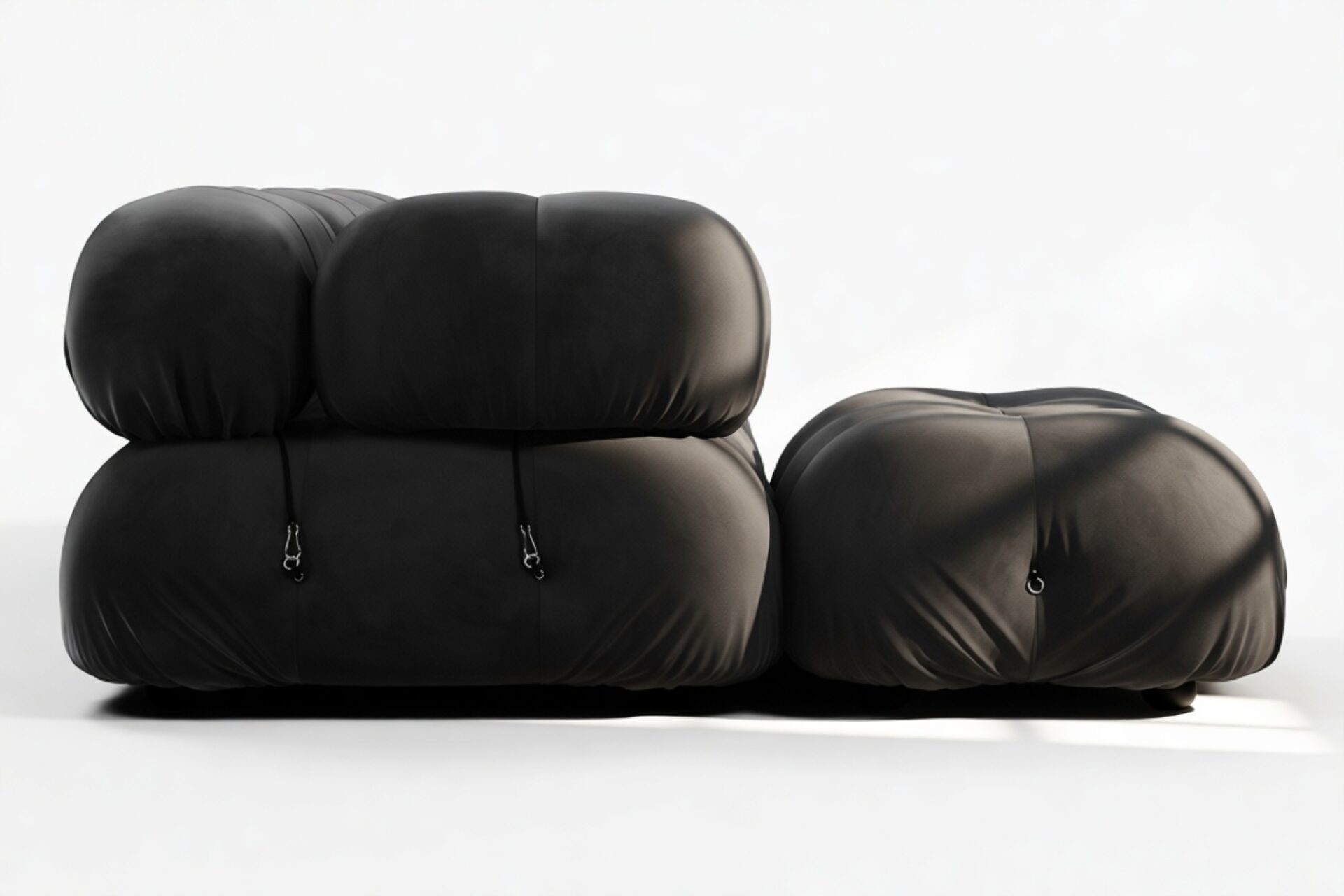 - Modular Instructions: Each section of the Mario Bellini Sofa is modular and is attached with string ties and carabiners. To assemble or rearrange your sofa, simply unclip the carabiners from one ring and attach to a corresponding ring on the module you wish to connect to.