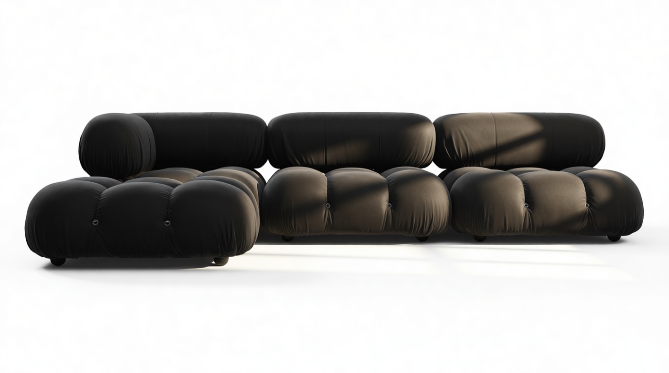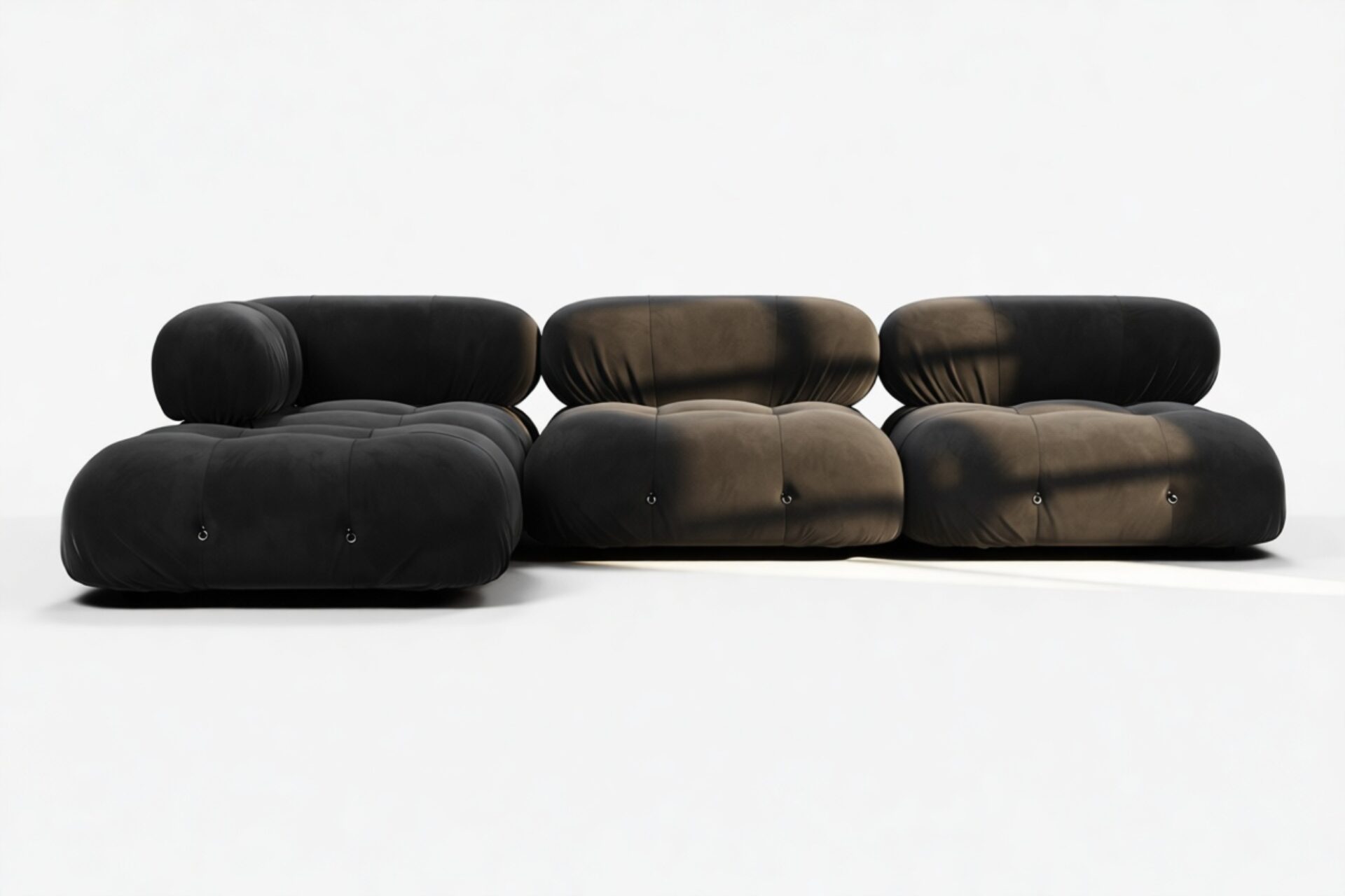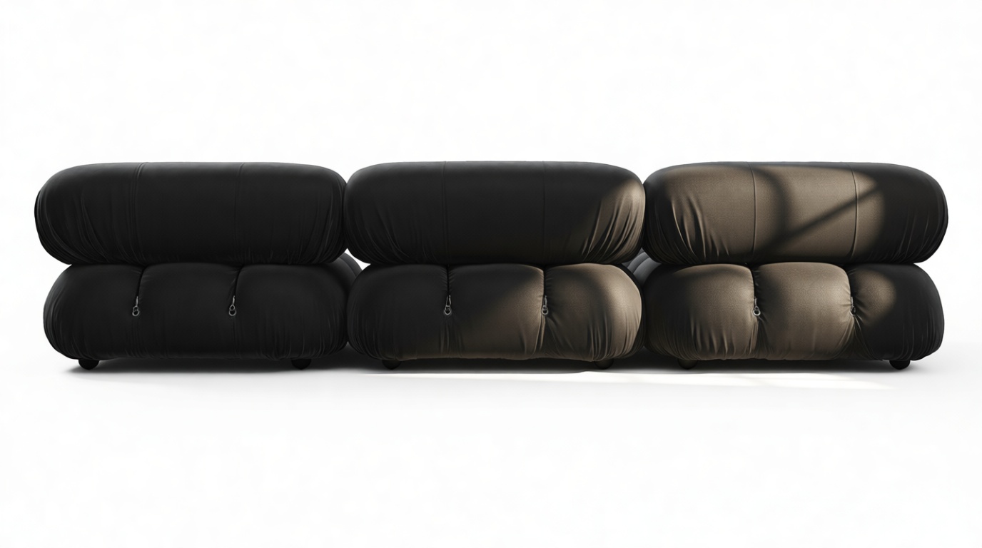 - Modular Instructions: Each section of the Mario Bellini Sofa is modular and is attached with string ties and carabiners. To assemble or rearrange your sofa, simply unclip the carabiners from one ring and attach to a corresponding ring on the module you wish to connect to.