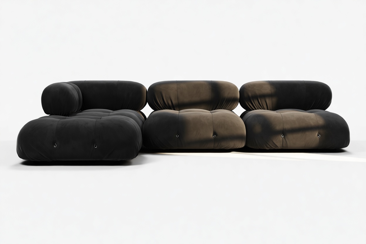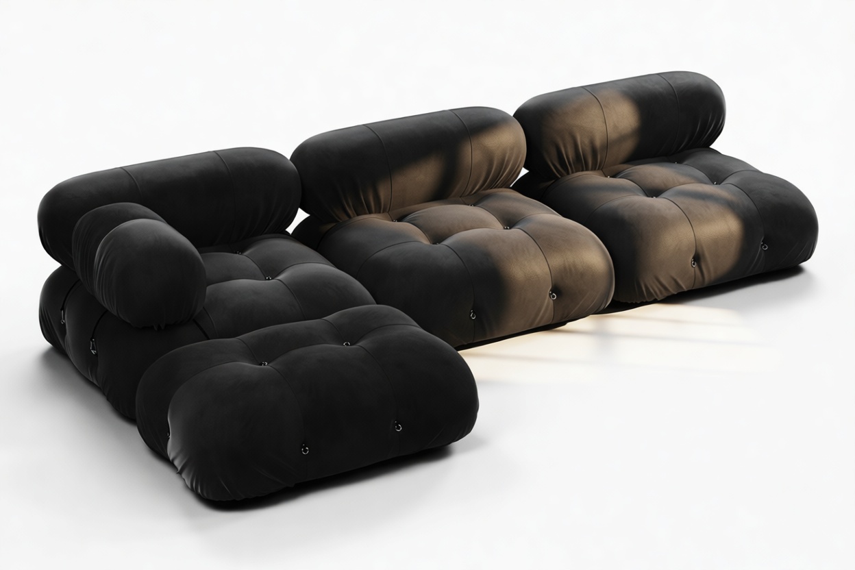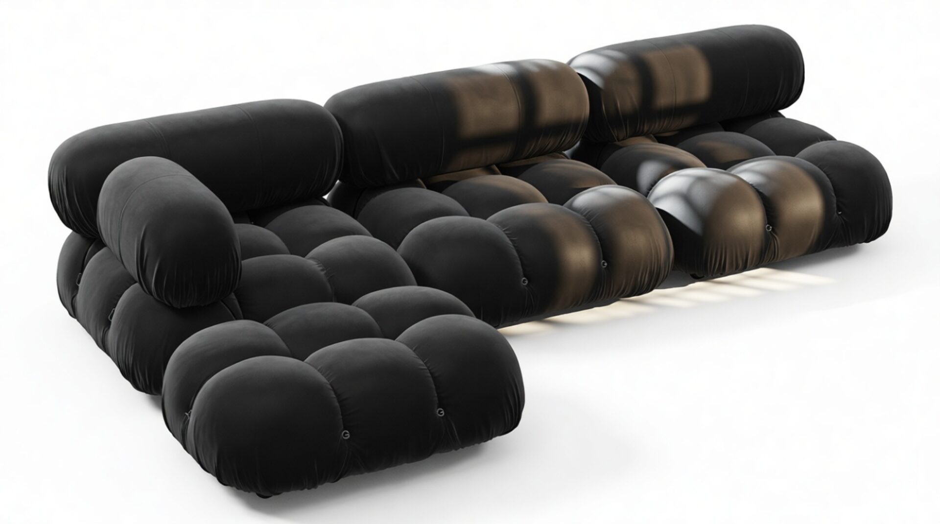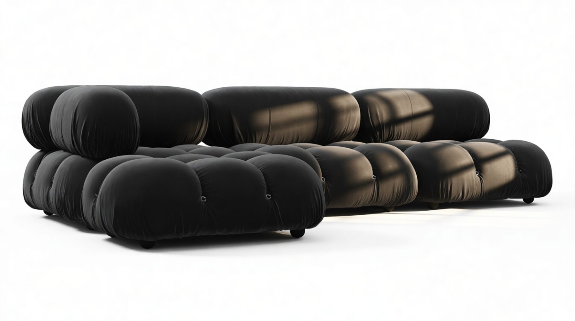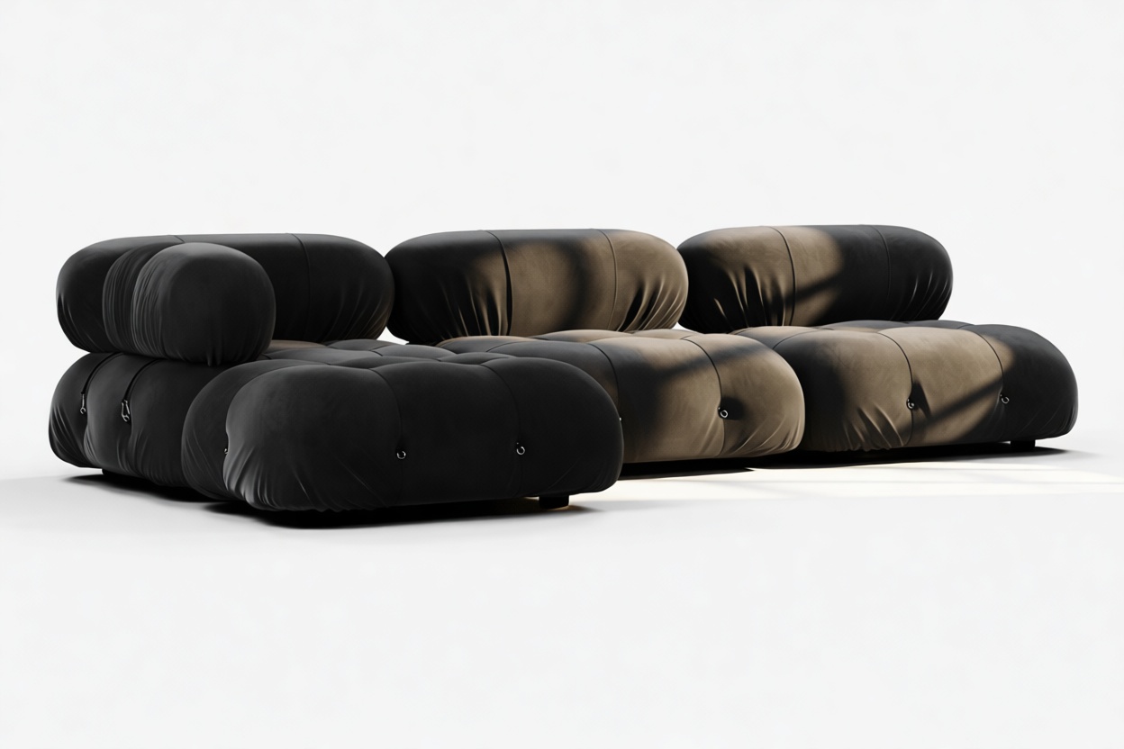 Travel back to the 1970s with the Bellini sectional sofa, an ode to a bygone era of carefree living. Breaking away from traditional designs, the Bellini offers a liberating touch to your space. Its modular construction allows for easy customization to suit room layout, style, and ambiance without a complete overhaul. Modish and versatile, the Bellini attracts a new crowd of furniture aficionados for its liberating essence and adaptability. With its tie rods and rings, this sectional enables effortless separation and rearrangement, empowering you to tailor your seating to evolving tastes. Built with a robust wooden frame and sumptuous cold-pressed foam covered in luxurious black velvet, the Bellini's sleek profile embodies opulent relaxation. Each plush cushion invites you to relax in sophisticated comfort, adding a touch of elegance to your decor.