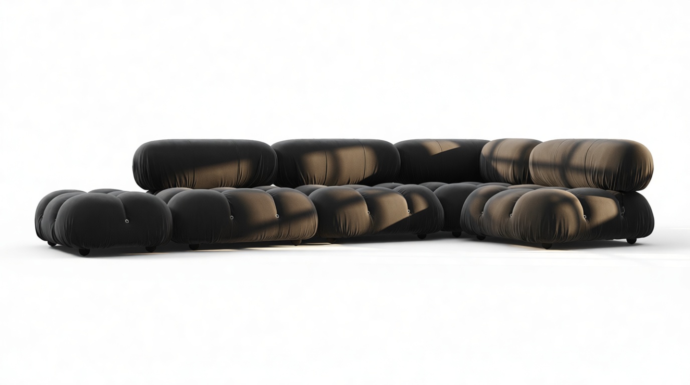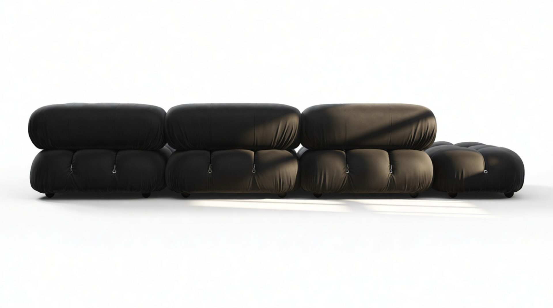 - Modular Instructions: Each section of the Mario Bellini Sofa is modular and is attached with string ties and carabiners. To assemble or rearrange your sofa, simply unclip the carabiners from one ring and attach to a corresponding ring on the module you wish to connect to.