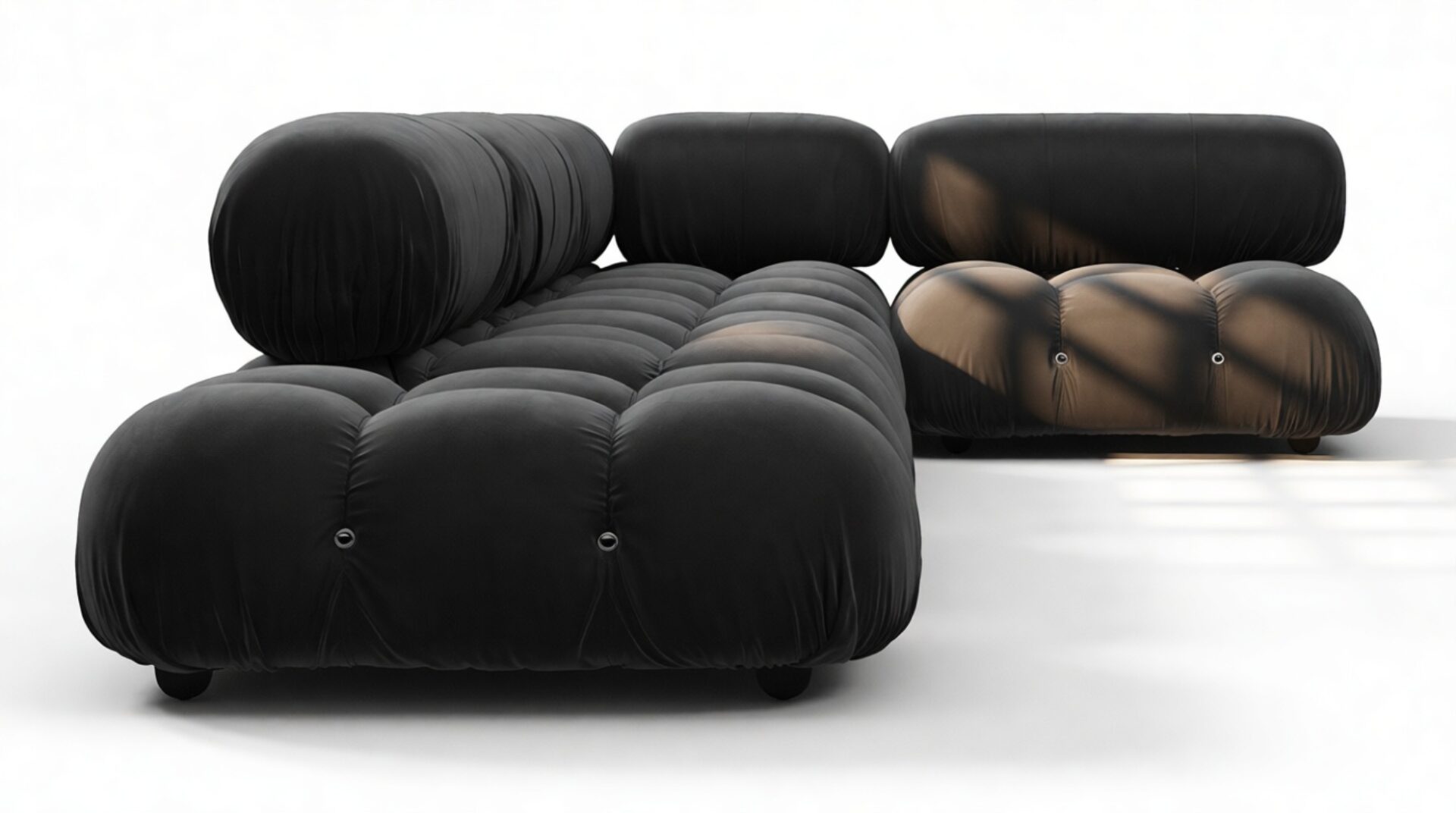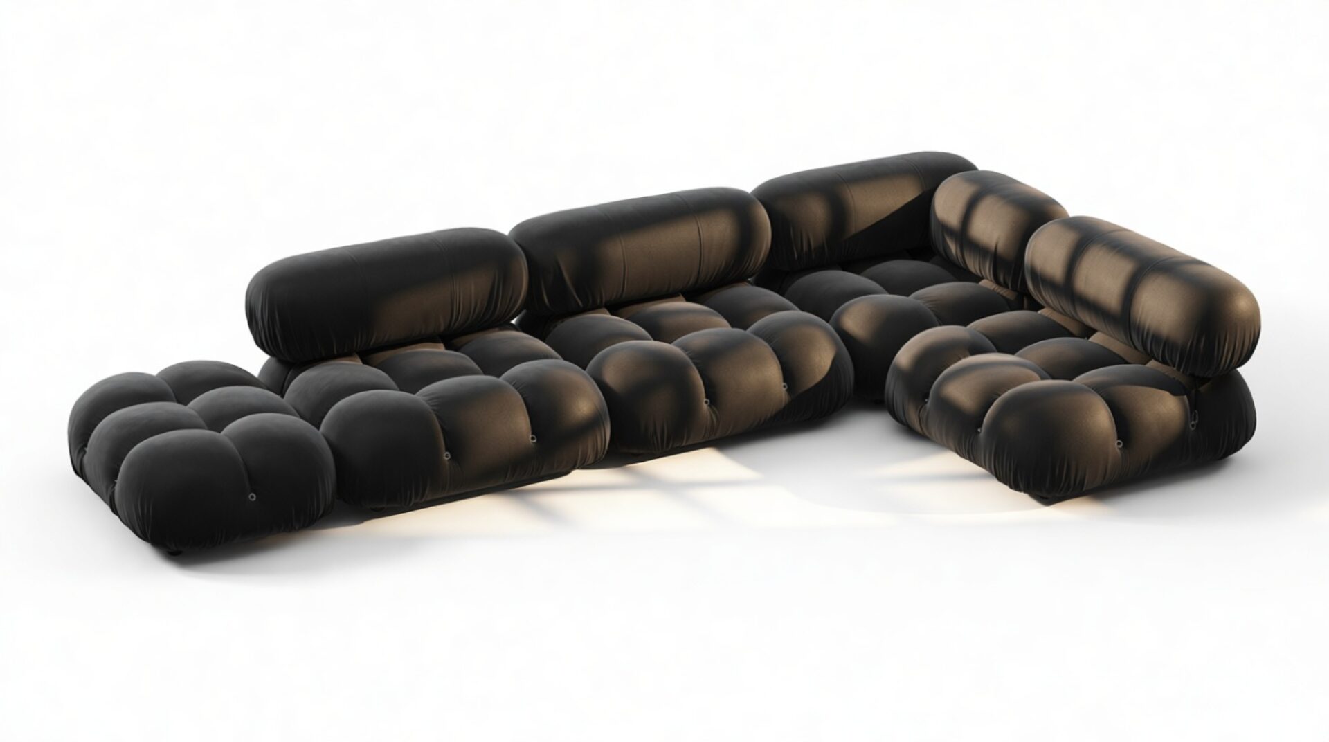 Step back into the disco era with the stylish Bellini sectional sofa. This trendy modular sofa is a symbol of retro chic, offering endless options for customization in your living space. Featuring a sturdy wooden frame and plush cold-pressed foam wrapped in luxurious black velvet, each inviting cushion invites you to relax in elegance and comfort.