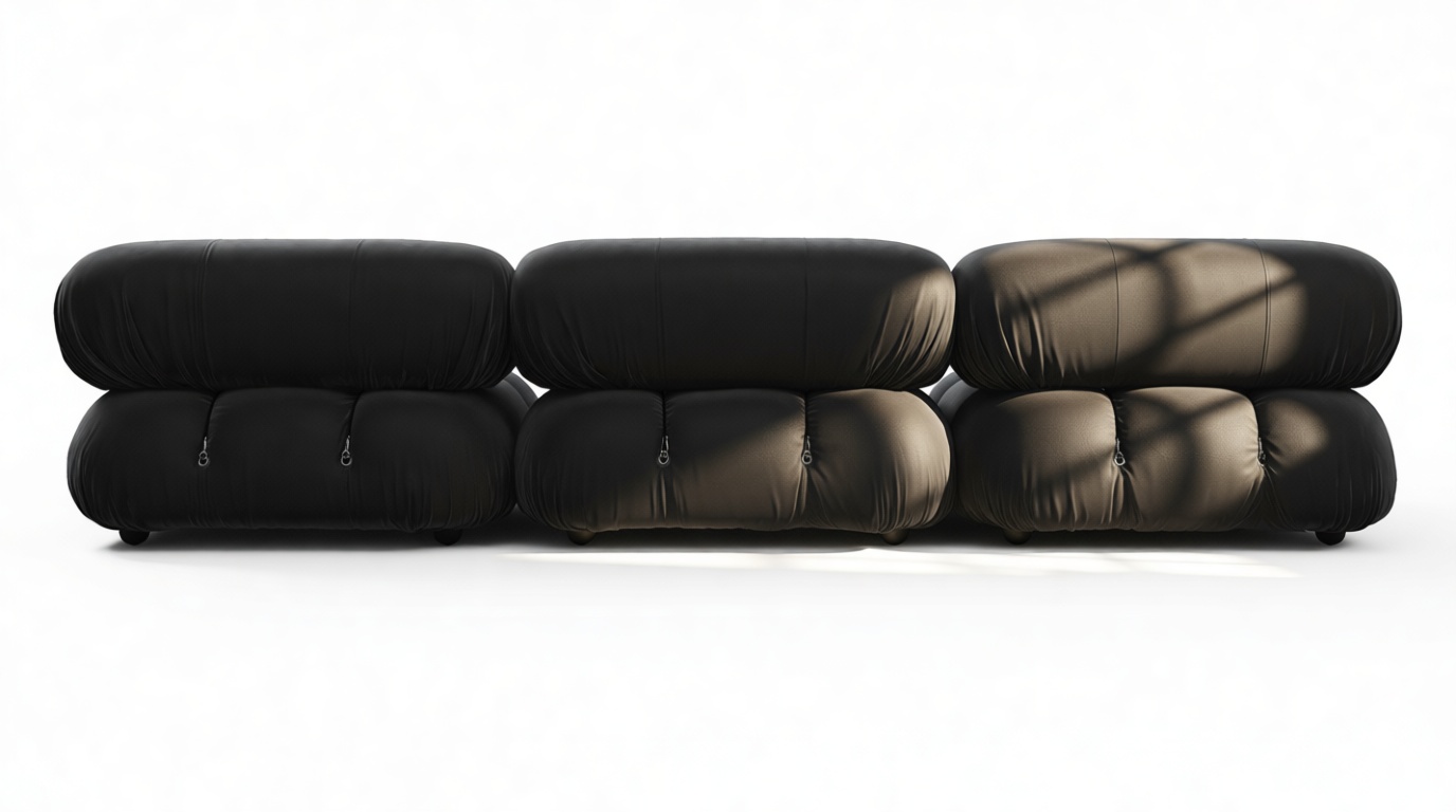 - Modular Instructions: Each section of the Mario Bellini Sofa is modular and is attached with string ties and carabiners. To assemble or rearrange your sofa, simply unclip the carabiners from one ring and attach to a corresponding ring on the module you wish to connect to.