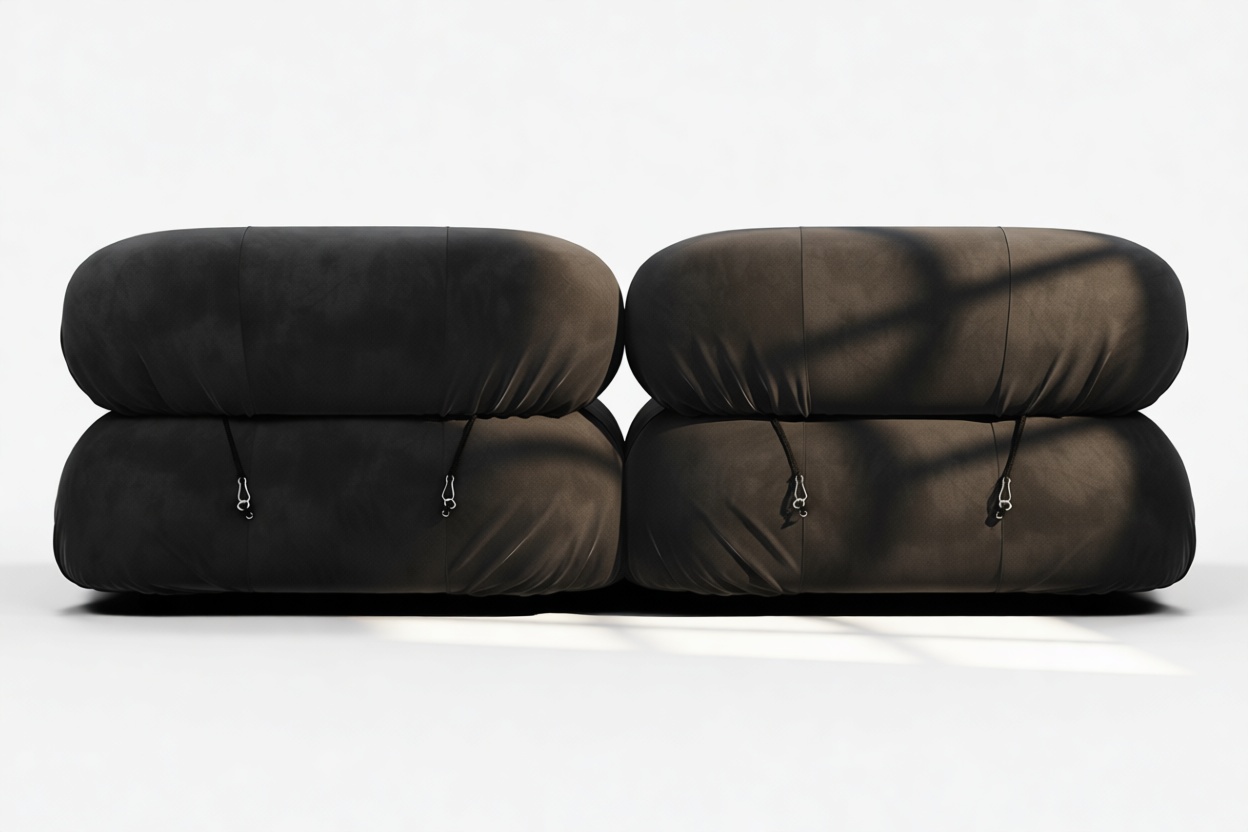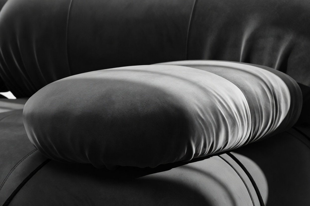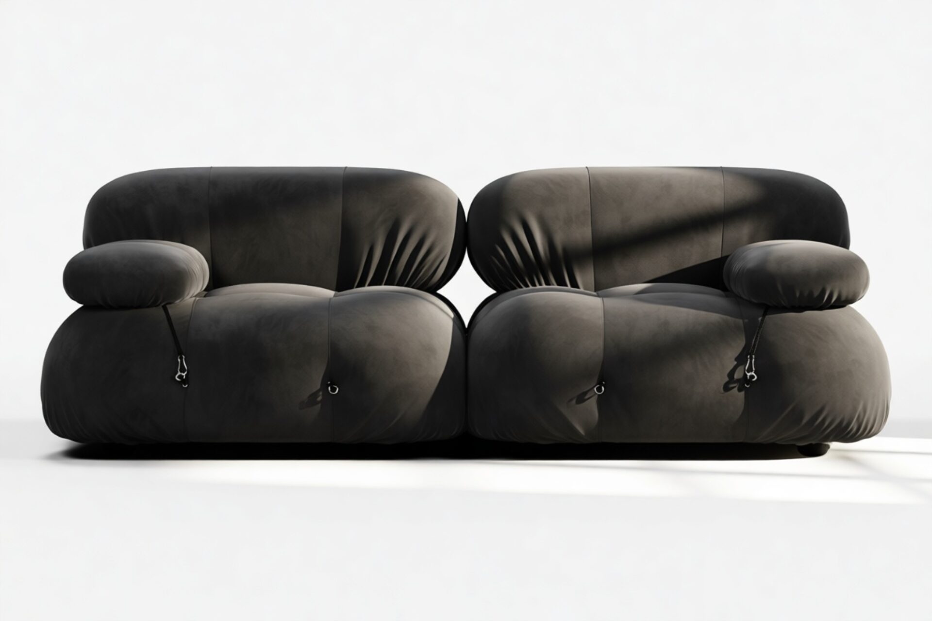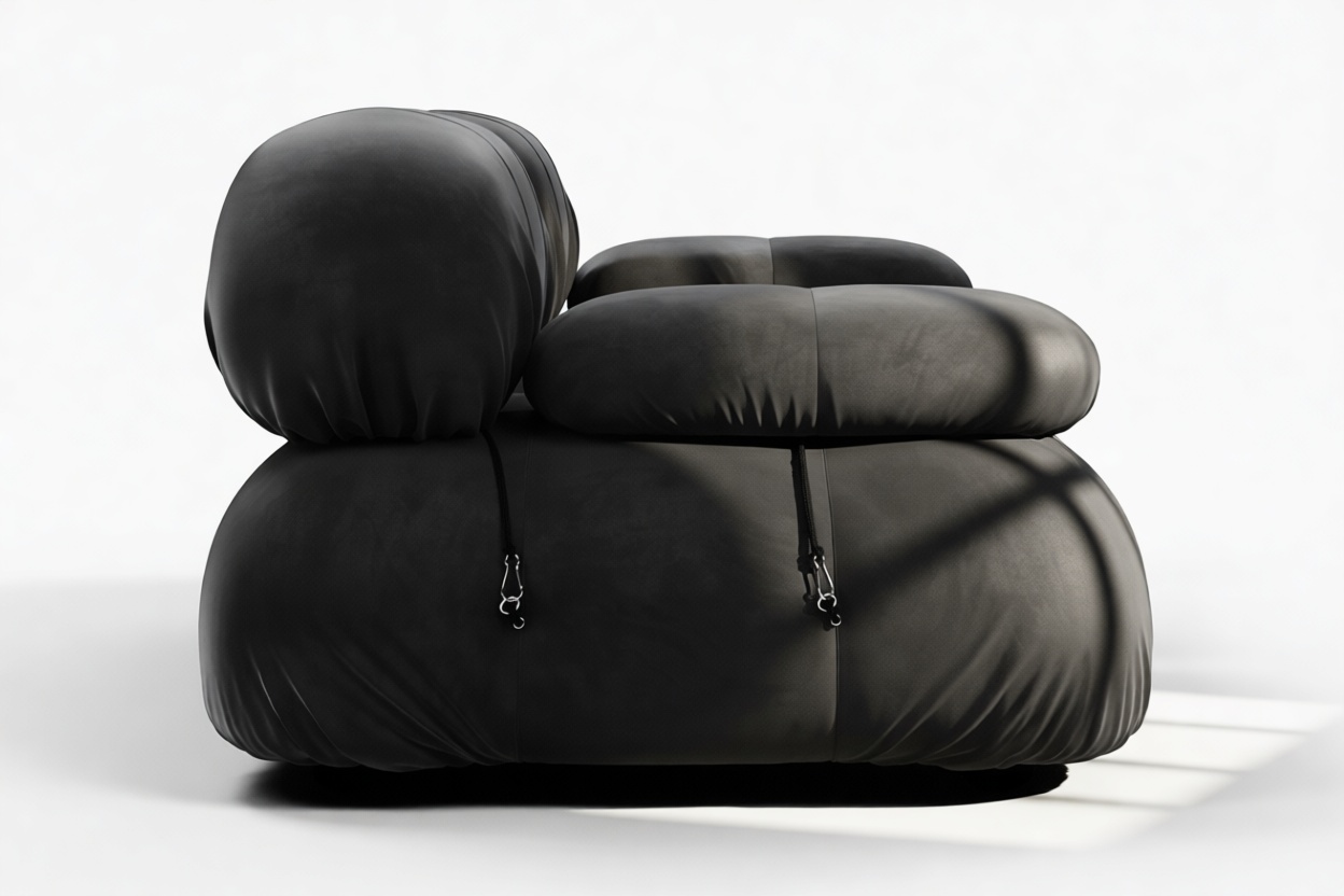 Travel back to the 1970s with the Bellini sectional sofa, a tribute to the era of groovy vibes and carefree living. Ditching the bulky norm, the Bellini provides a sense of liberation to your space. Its modular design lets you customize it to suit your layout, style, and mood without a full redecoration. Crafted with a robust wooden frame, plush cold-pressed foam, and enveloped in soft black velvet fabric, the Bellini's low-profile silhouette exudes relaxed luxury. Each cushion invites you to unwind in style, promising a lavish and cozy seating experience. Retaining its charm among furniture enthusiasts, the Bellini is beloved for its liberating essence and adaptability. The tie rods and rings allow effortless rearrangement, offering the freedom to adjust your sofa to your evolving preferences. Its versatility shines, with the sectional layout giving endless options for configurations, blending relaxation and social interaction seamlessly. The Bellini is a timeless favorite that can adapt to any setting and aesthetic, catering to various room sizes and styles effortlessly.
