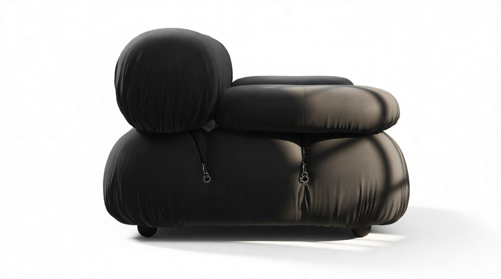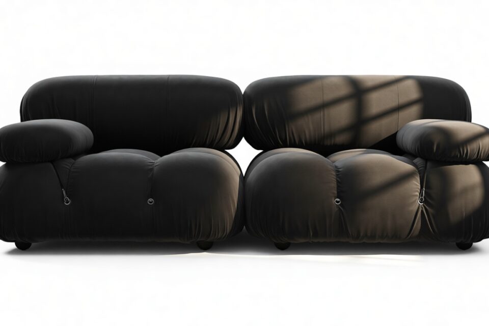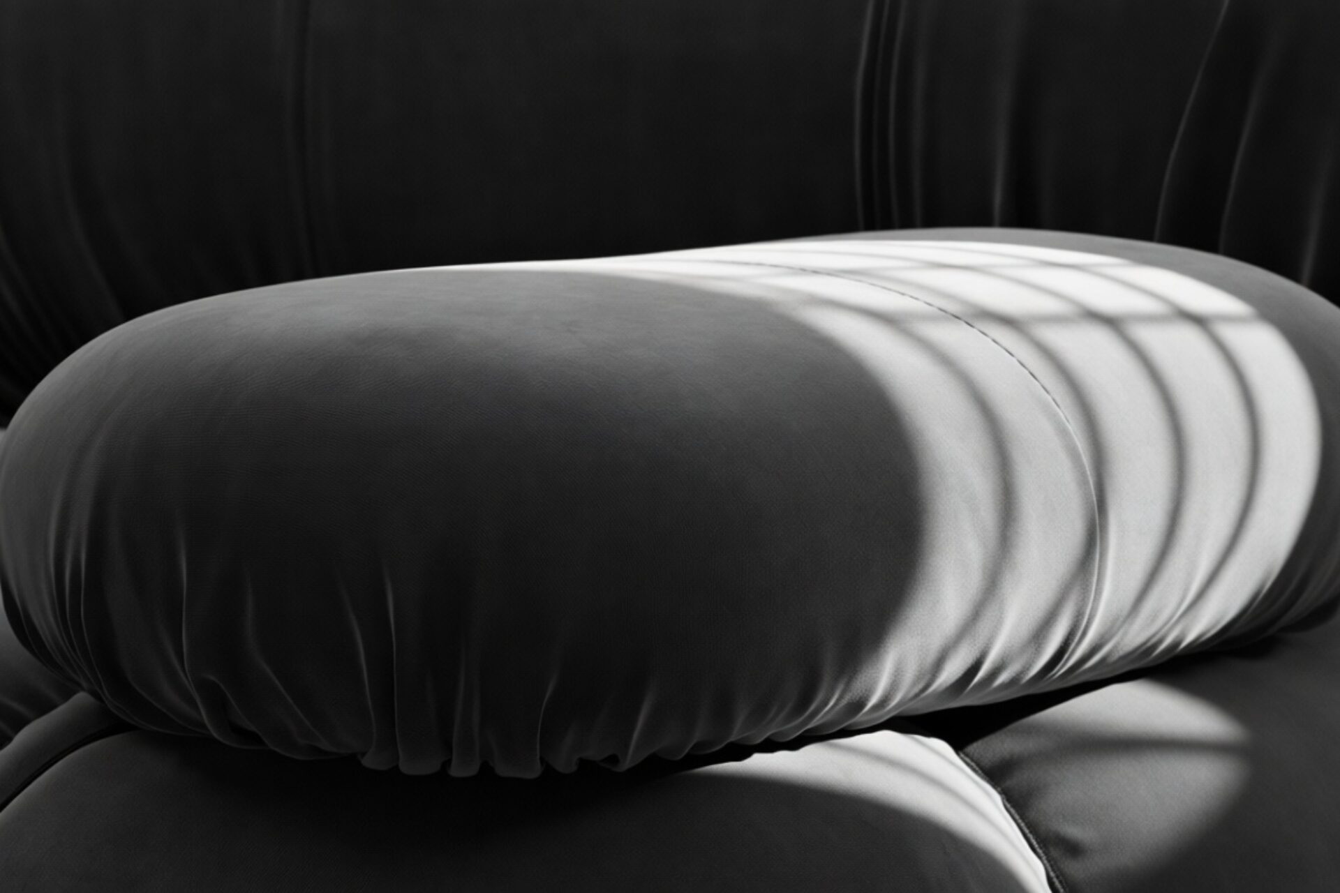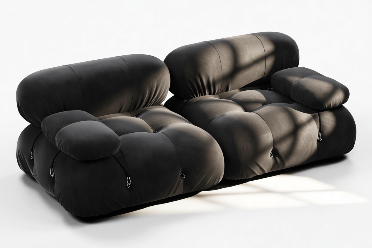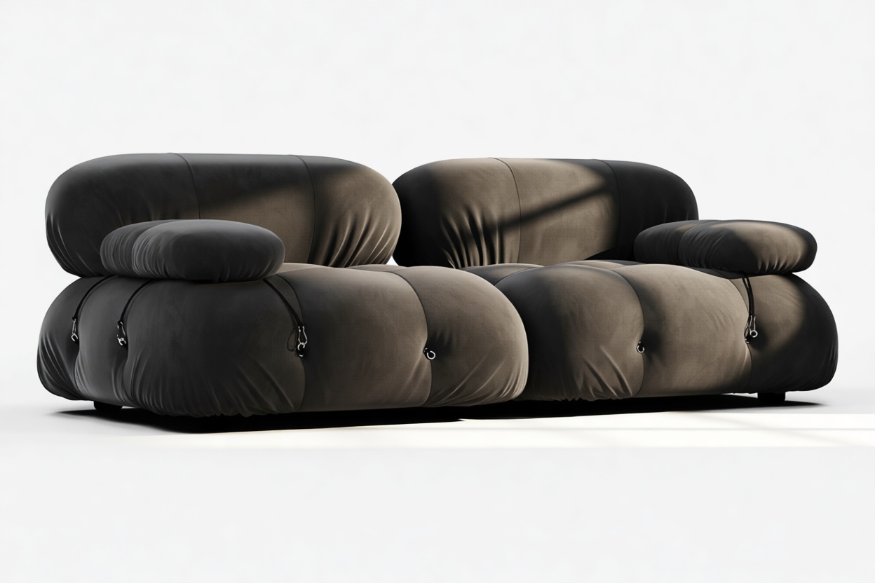 Travel back to the 1970s with the Bellini sectional sofa, a tribute to the era of groovy vibes and carefree living. Ditching the bulky norm, the Bellini provides a sense of liberation to your space. Its modular design lets you customize it to suit your layout, style, and mood without a full redecoration. Crafted with a robust wooden frame, plush cold-pressed foam, and enveloped in soft black velvet fabric, the Bellini's low-profile silhouette exudes relaxed luxury. Each cushion invites you to unwind in style, promising a lavish and cozy seating experience. Retaining its charm among furniture enthusiasts, the Bellini is beloved for its liberating essence and adaptability. The tie rods and rings allow effortless rearrangement, offering the freedom to adjust your sofa to your evolving preferences. Its versatility shines, with the sectional layout giving endless options for configurations, blending relaxation and social interaction seamlessly. The Bellini is a timeless favorite that can adapt to any setting and aesthetic, catering to various room sizes and styles effortlessly.