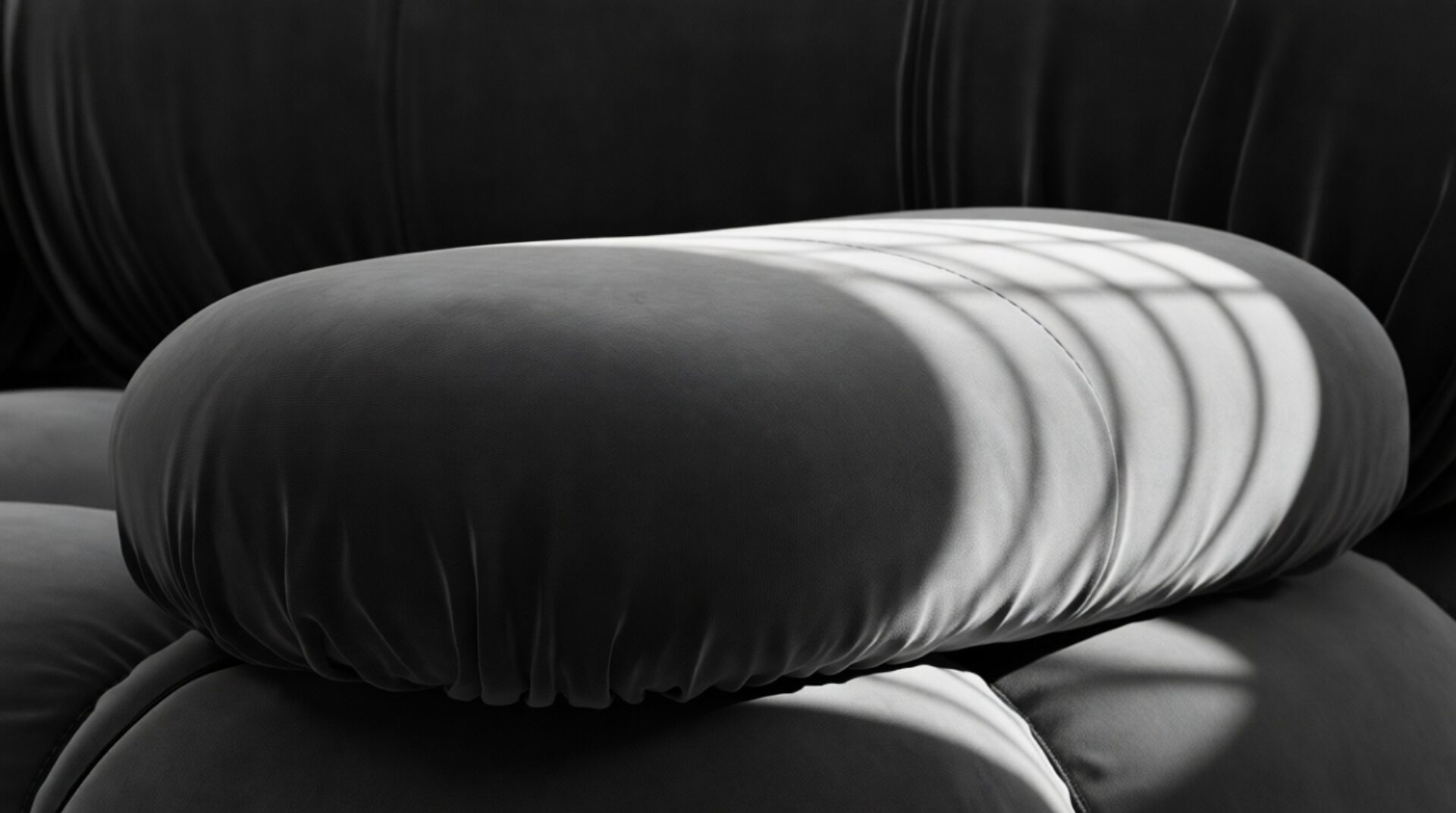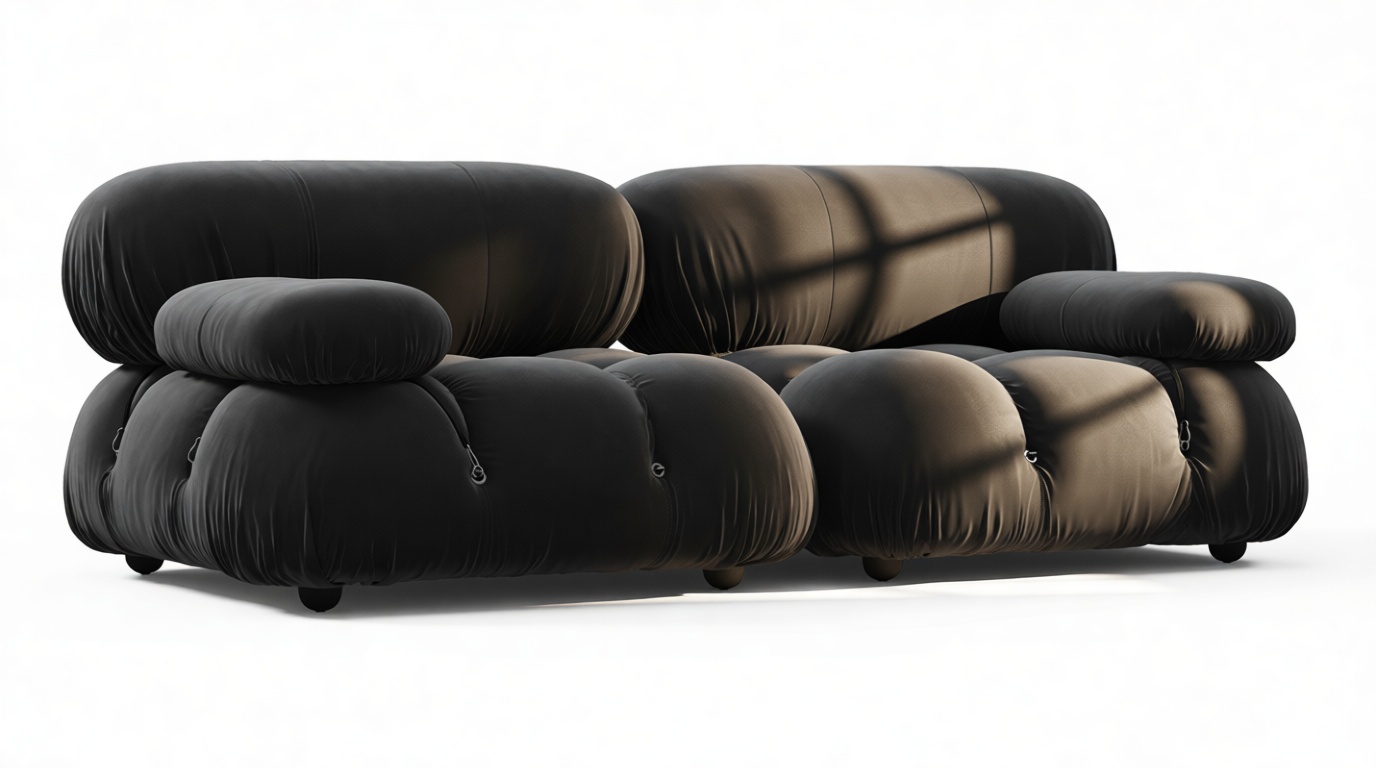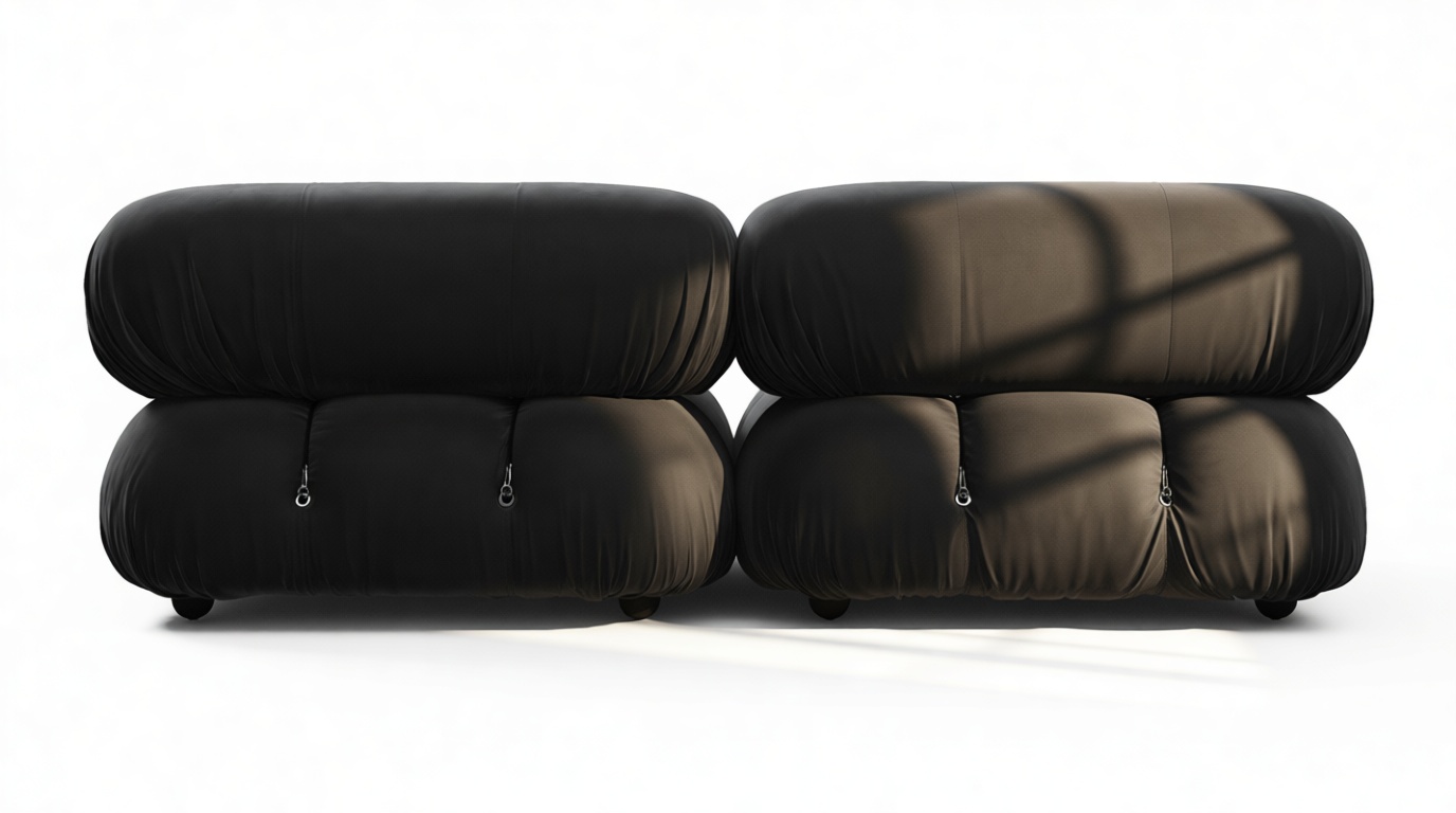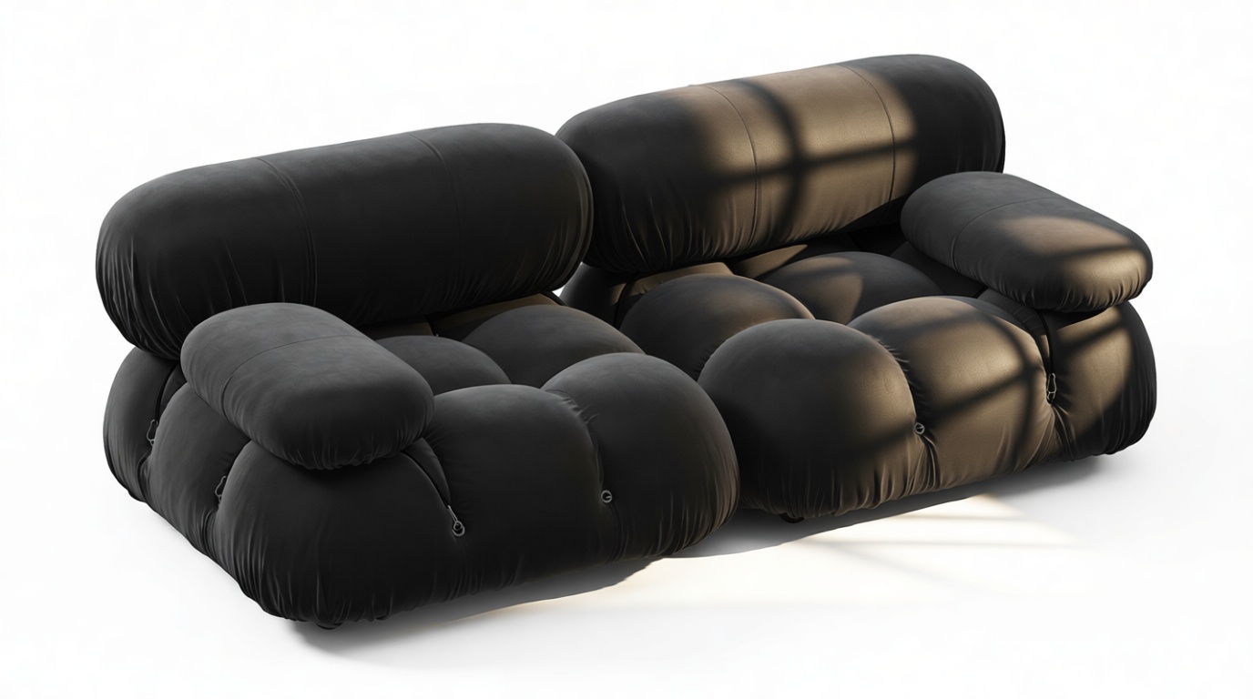 Travel back to the 1970s with the Bellini sectional sofa, a tribute to the era of groovy vibes and carefree living. Ditching the bulky norm, the Bellini provides a sense of liberation to your space. Its modular design lets you customize it to suit your layout, style, and mood without a full redecoration. Crafted with a robust wooden frame, plush cold-pressed foam, and enveloped in soft black velvet fabric, the Bellini's low-profile silhouette exudes relaxed luxury. Each cushion invites you to unwind in style, promising a lavish and cozy seating experience. Retaining its charm among furniture enthusiasts, the Bellini is beloved for its liberating essence and adaptability. The tie rods and rings allow effortless rearrangement, offering the freedom to adjust your sofa to your evolving preferences. Its versatility shines, with the sectional layout giving endless options for configurations, blending relaxation and social interaction seamlessly. The Bellini is a timeless favorite that can adapt to any setting and aesthetic, catering to various room sizes and styles effortlessly.