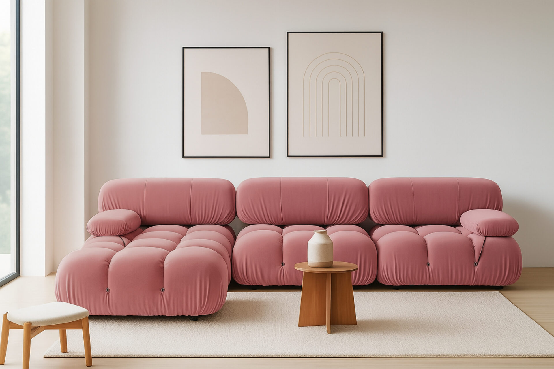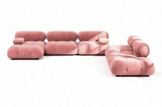 Step back into the 1970s with the Bellini sectional sofa, celebrating an era of groovy vibes and carefree living. With its modular design, this versatile piece offers a liberating essence, allowing you to customize your space effortlessly. Crafted with a sturdy wooden frame and plush cold-pressed foam wrapped in Blush Pink Velvet, the Bellini exudes relaxed luxury and style, inviting you to unwind in comfort while showcasing a modern and chic touch to your home décor.