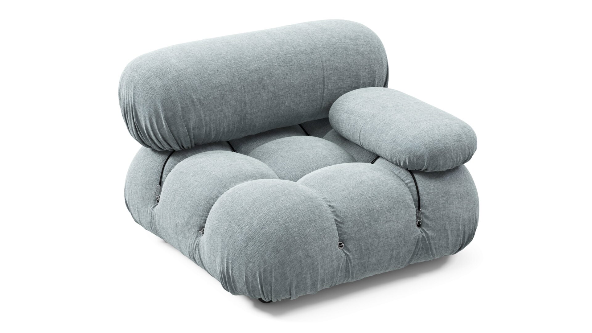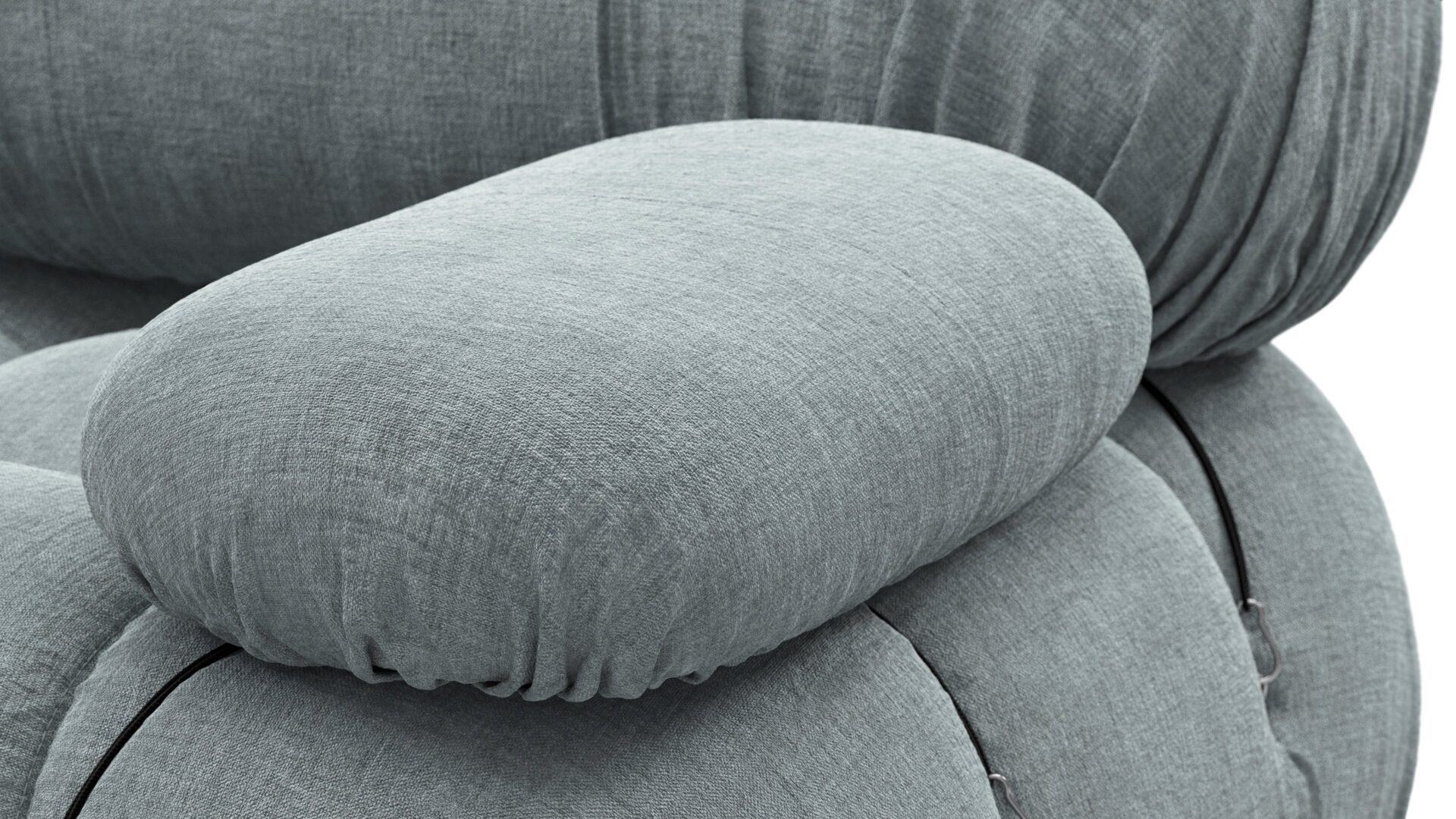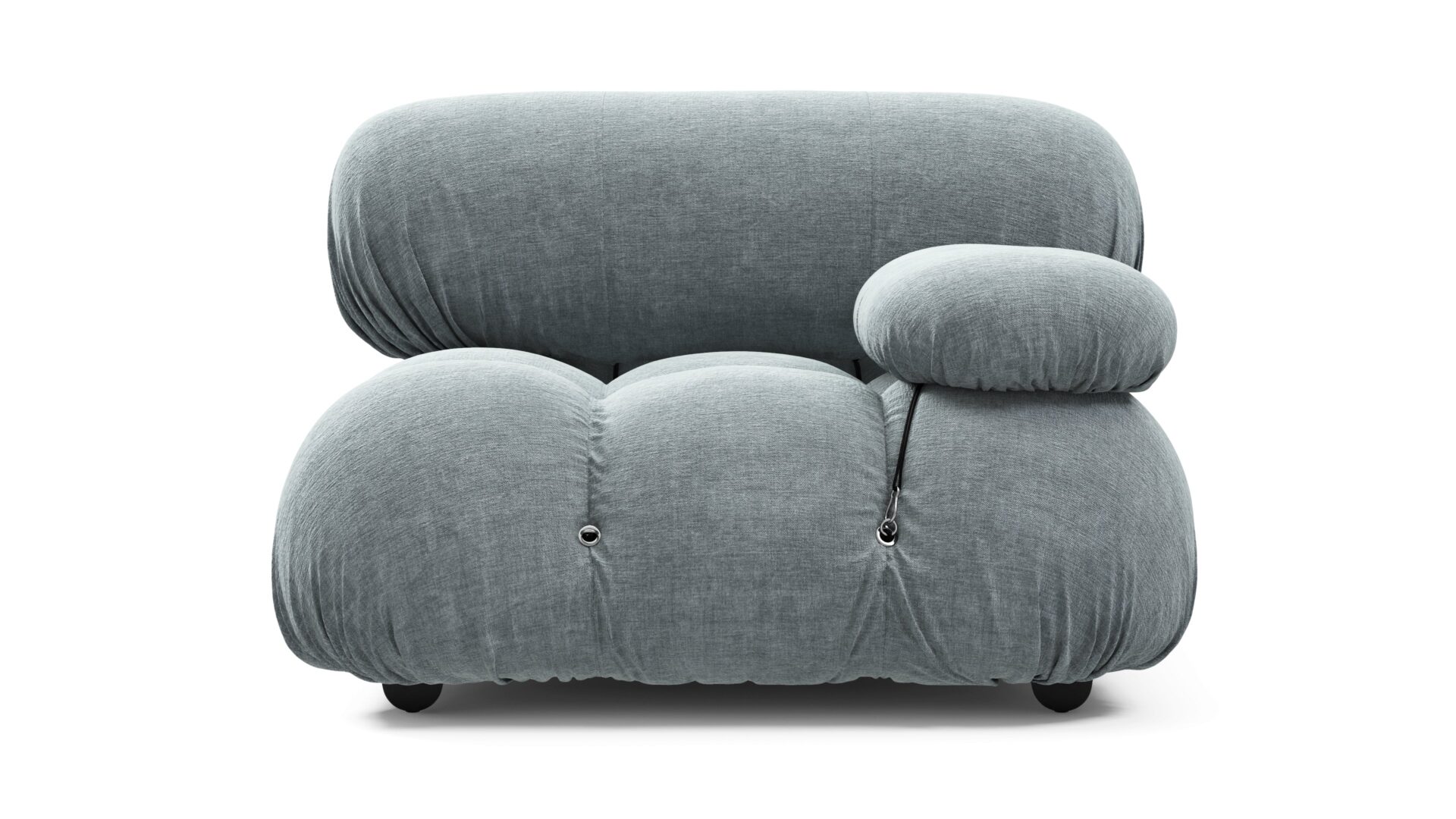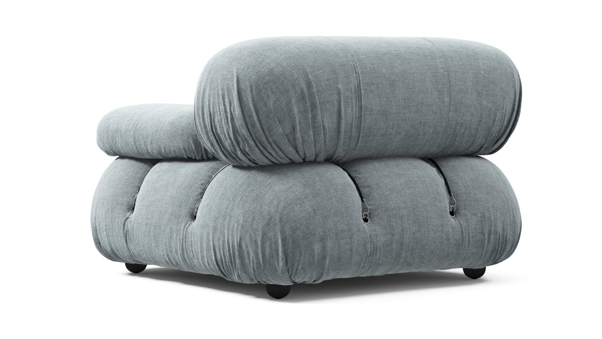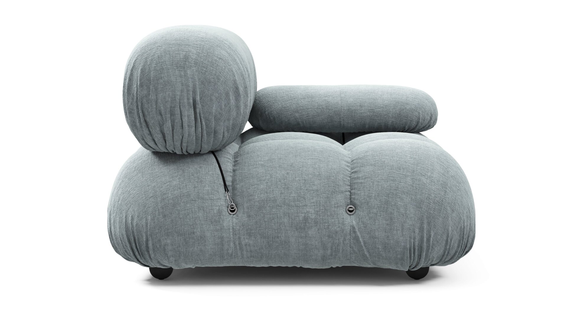 - Modular Instructions: Each section of the Mario Bellini Sofa is modular and is attached with string ties and carabiners. To assemble or rearrange your sofa, simply unclip the carabiners from one ring and attach to a corresponding ring on the module you wish to connect to.
