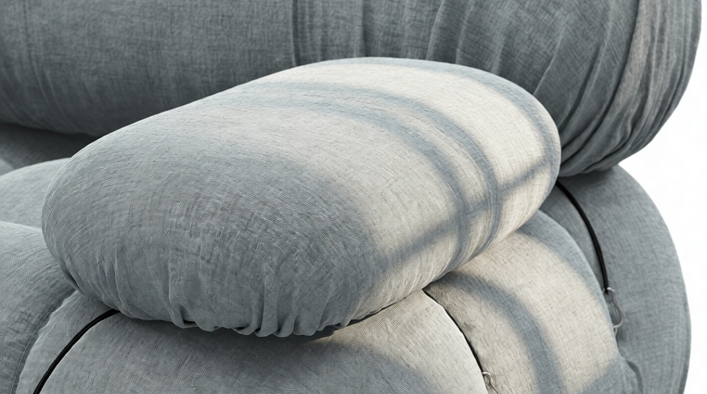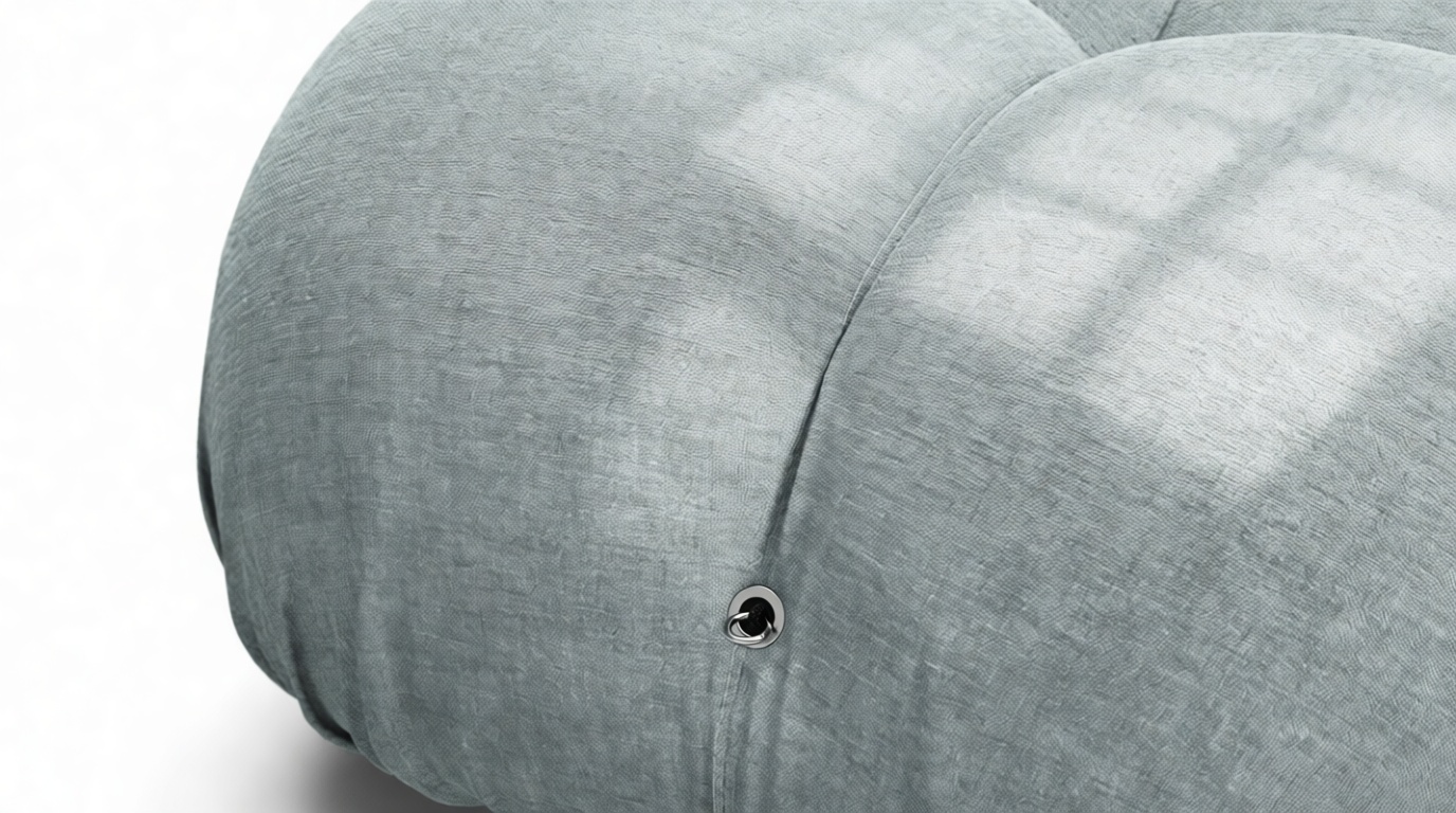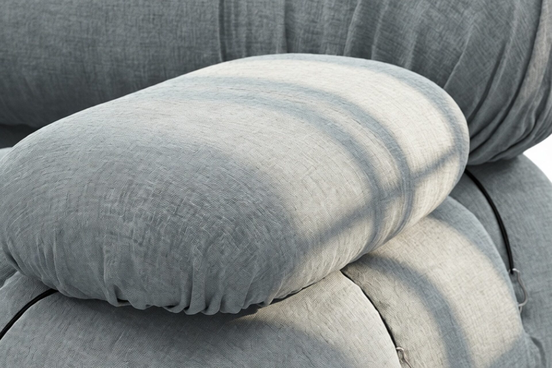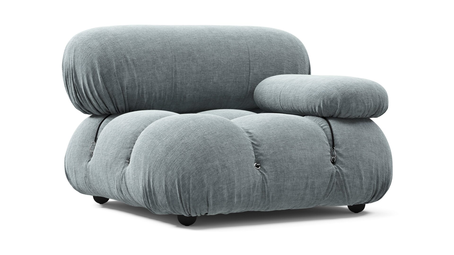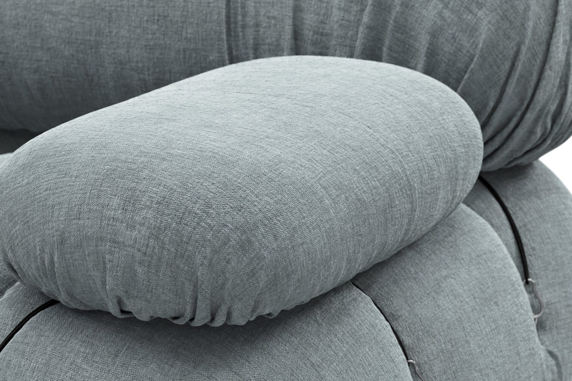 - Modular Instructions: Each section of the Mario Bellini Sofa is modular and is attached with string ties and carabiners. To assemble or rearrange your sofa, simply unclip the carabiners from one ring and attach to a corresponding ring on the module you wish to connect to.
