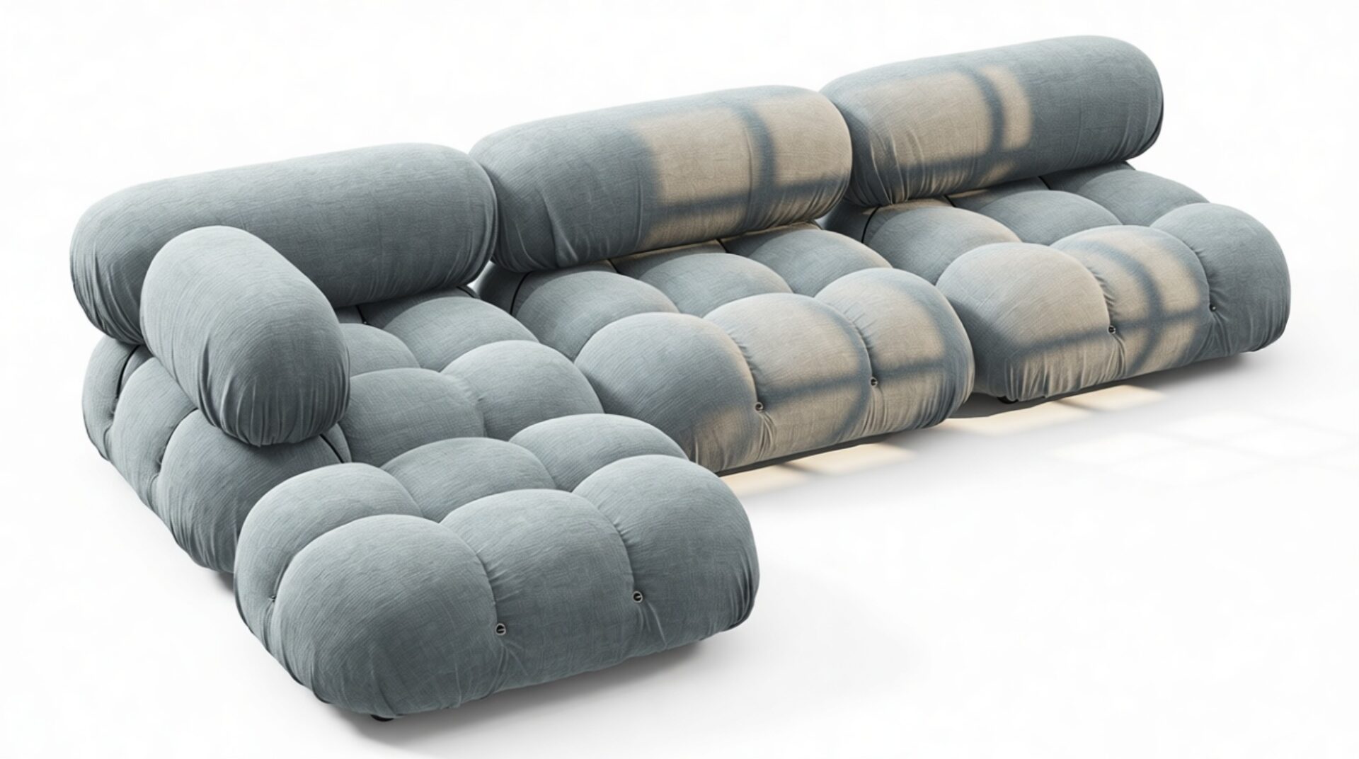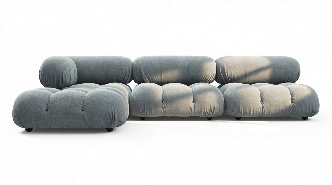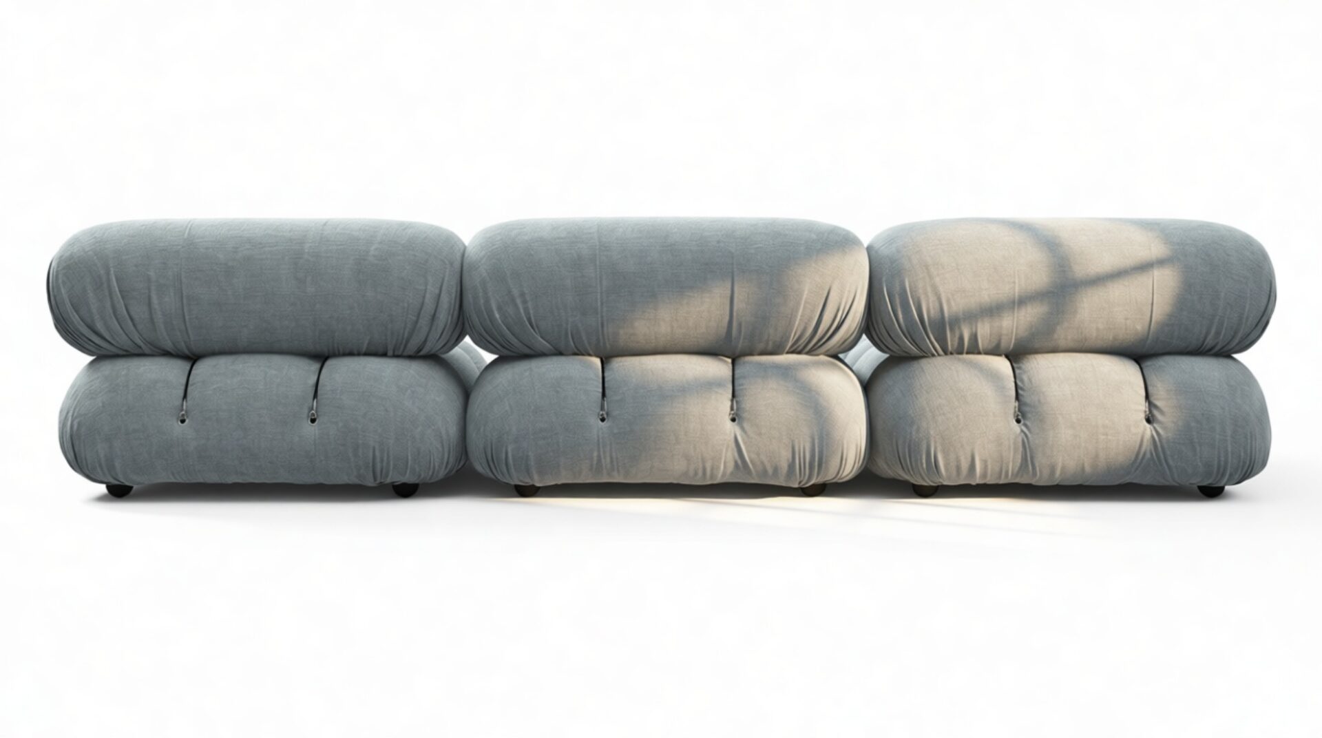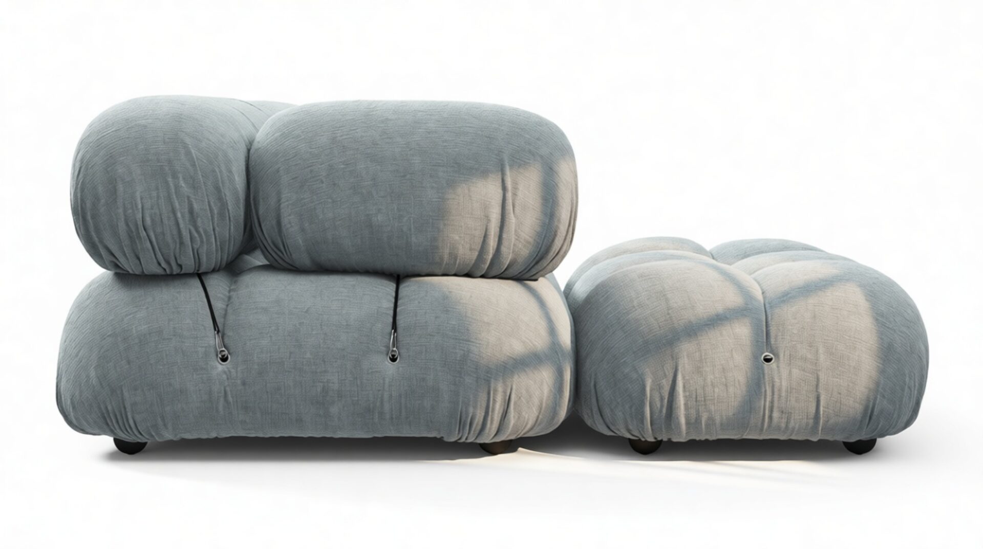 - Modular Instructions: Each section of the Mario Bellini Sofa is modular and is attached with string ties and carabiners. To assemble or rearrange your sofa, simply unclip the carabiners from one ring and attach to a corresponding ring on the module you wish to connect to.