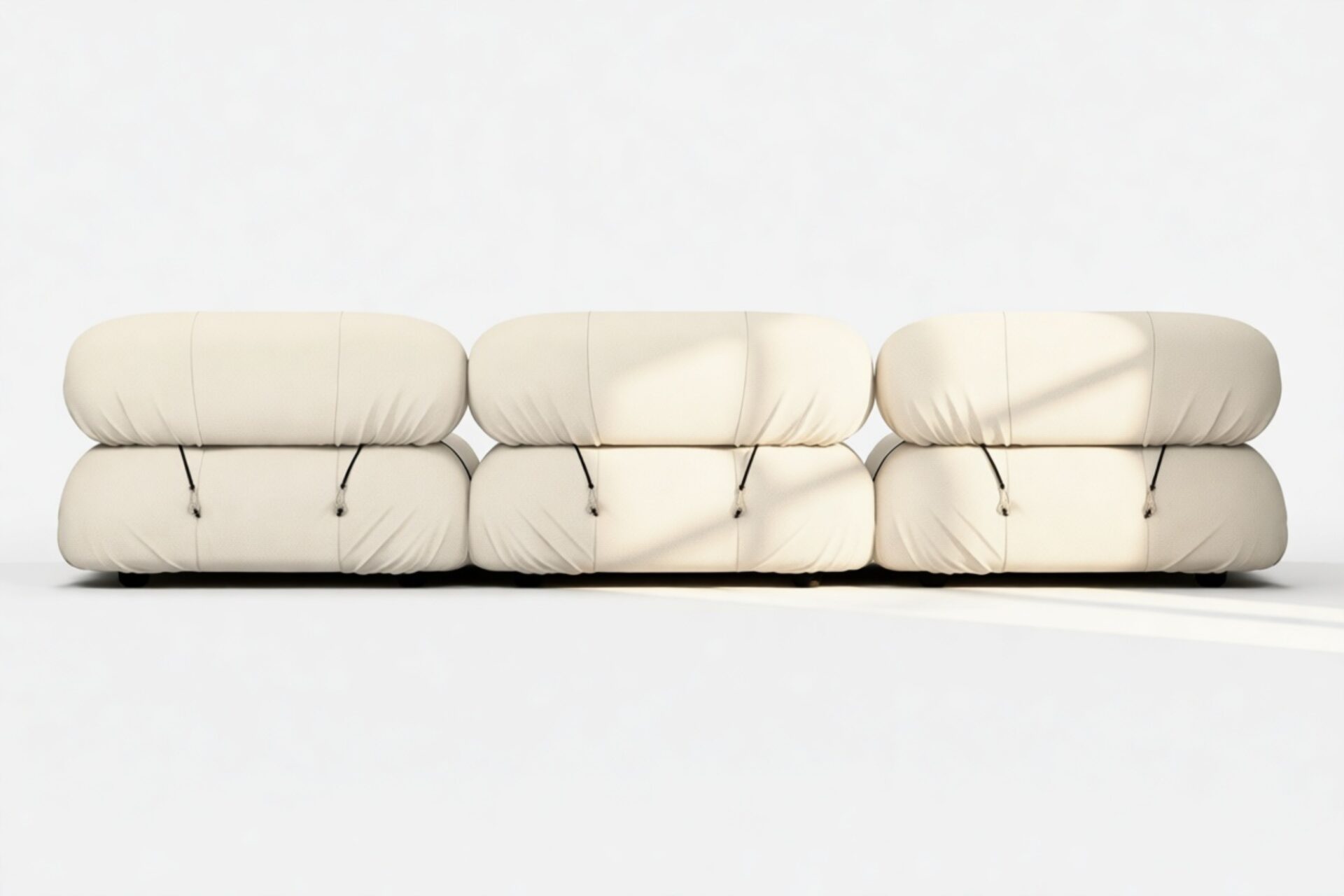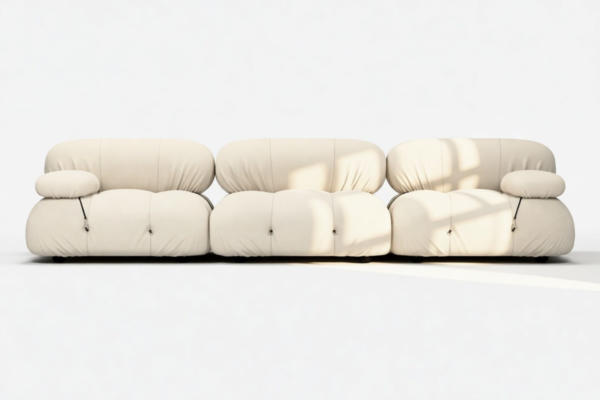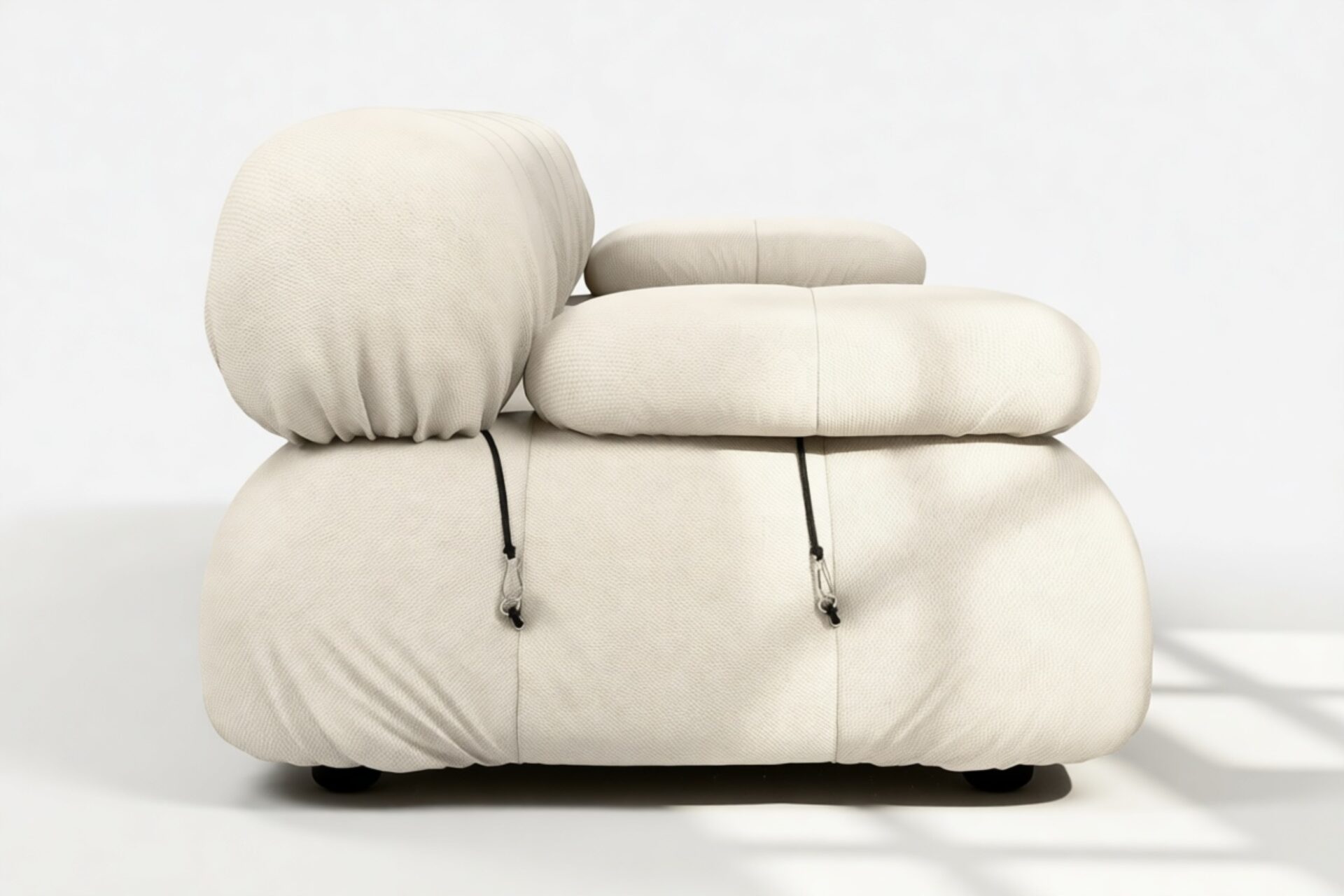 - Modular Instructions: Each section of the Mario Bellini Sofa is modular and is attached with string ties and carabiners. To assemble or rearrange your sofa, simply unclip the carabiners from one ring and attach to a corresponding ring on the module you wish to connect to.
