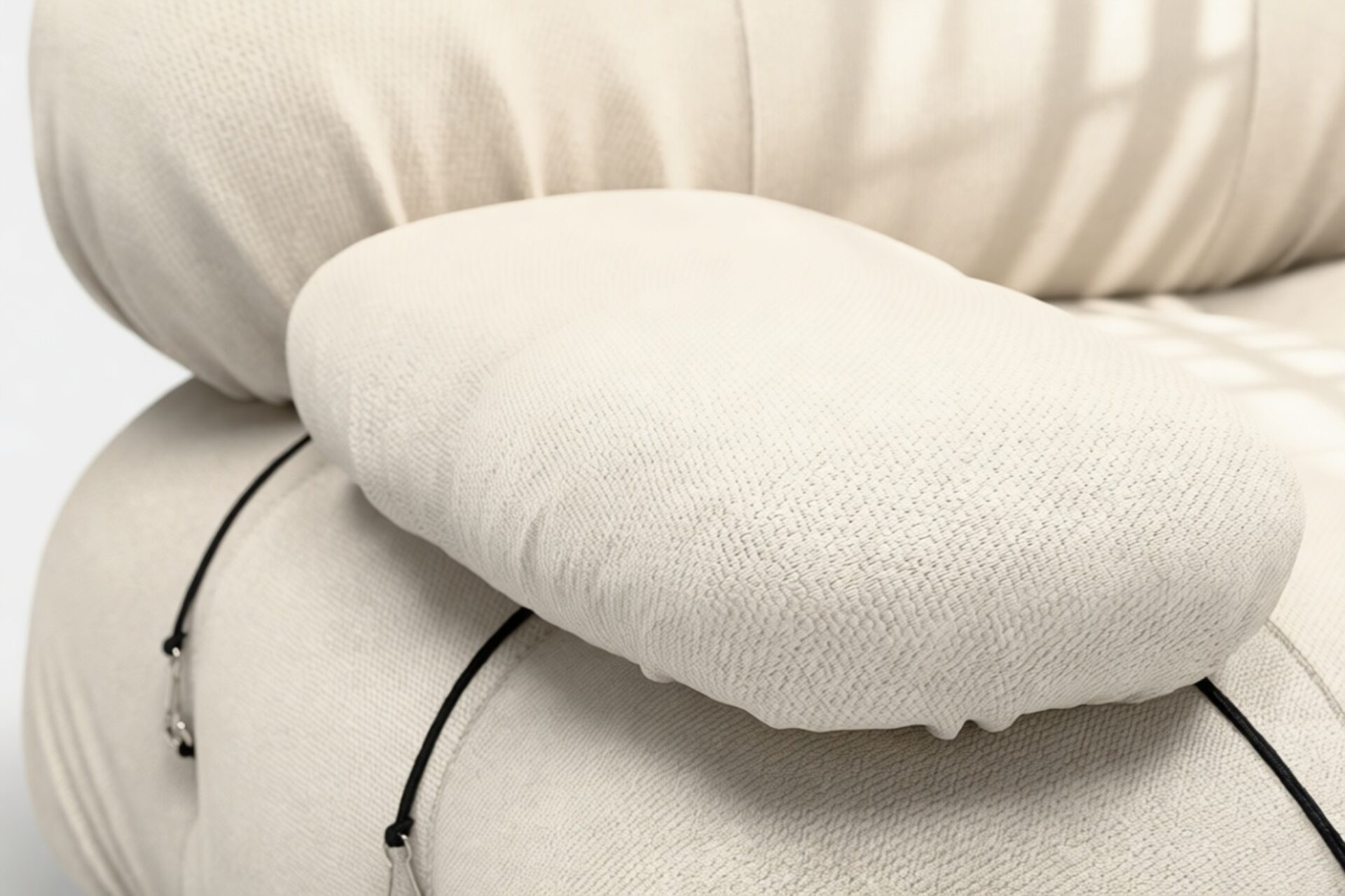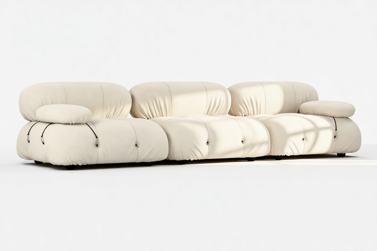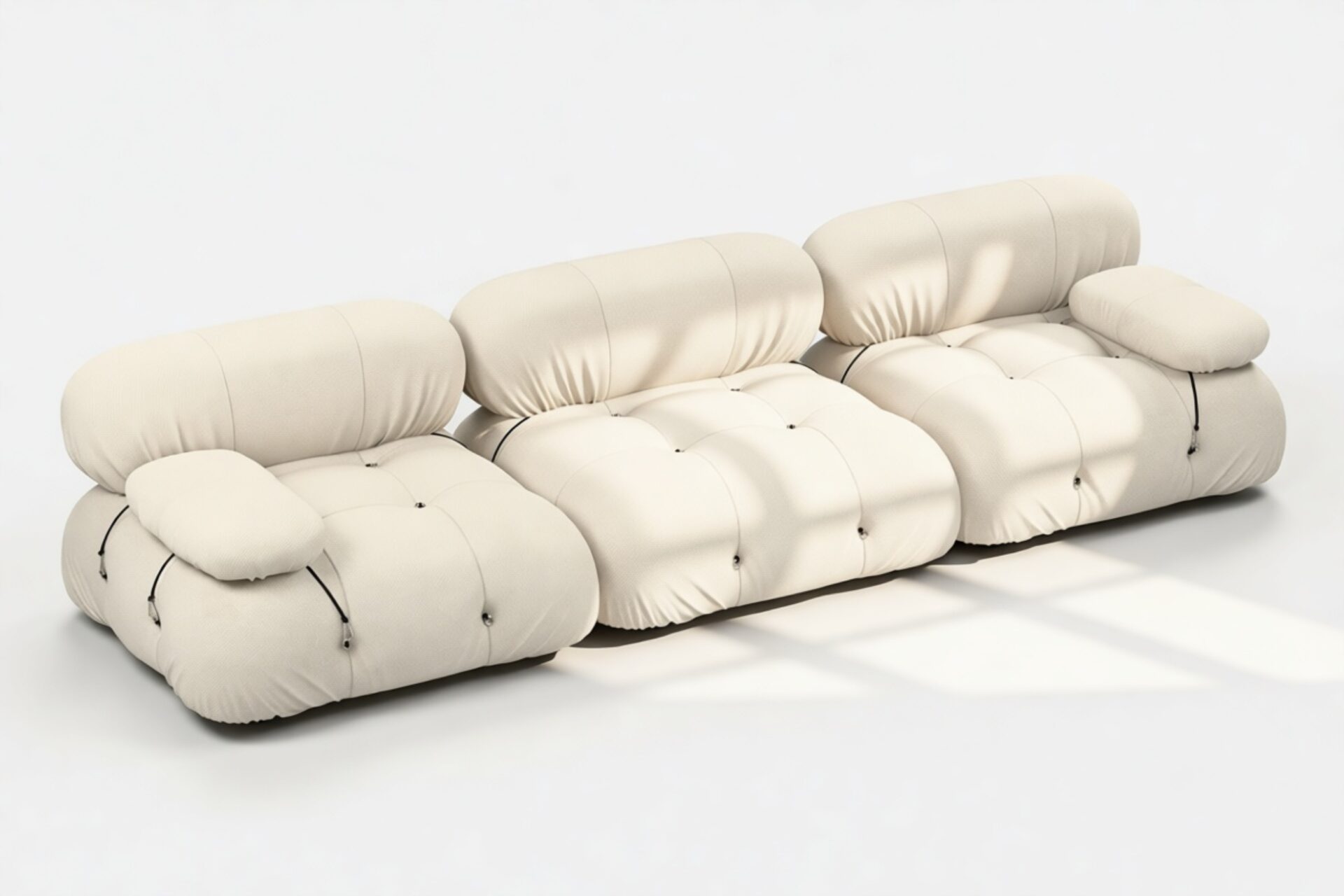 - Modular Instructions: Each section of the Mario Bellini Sofa is modular and is attached with string ties and carabiners. To assemble or rearrange your sofa, simply unclip the carabiners from one ring and attach to a corresponding ring on the module you wish to connect to.