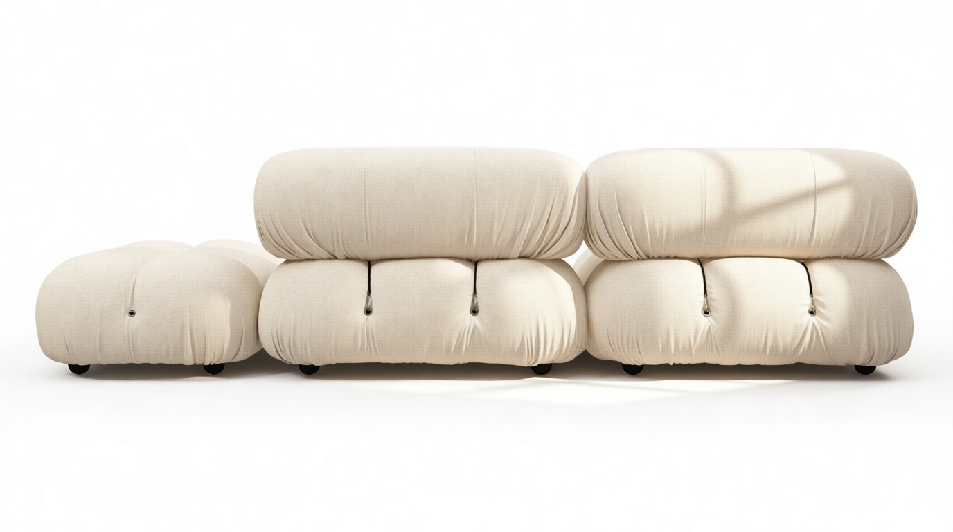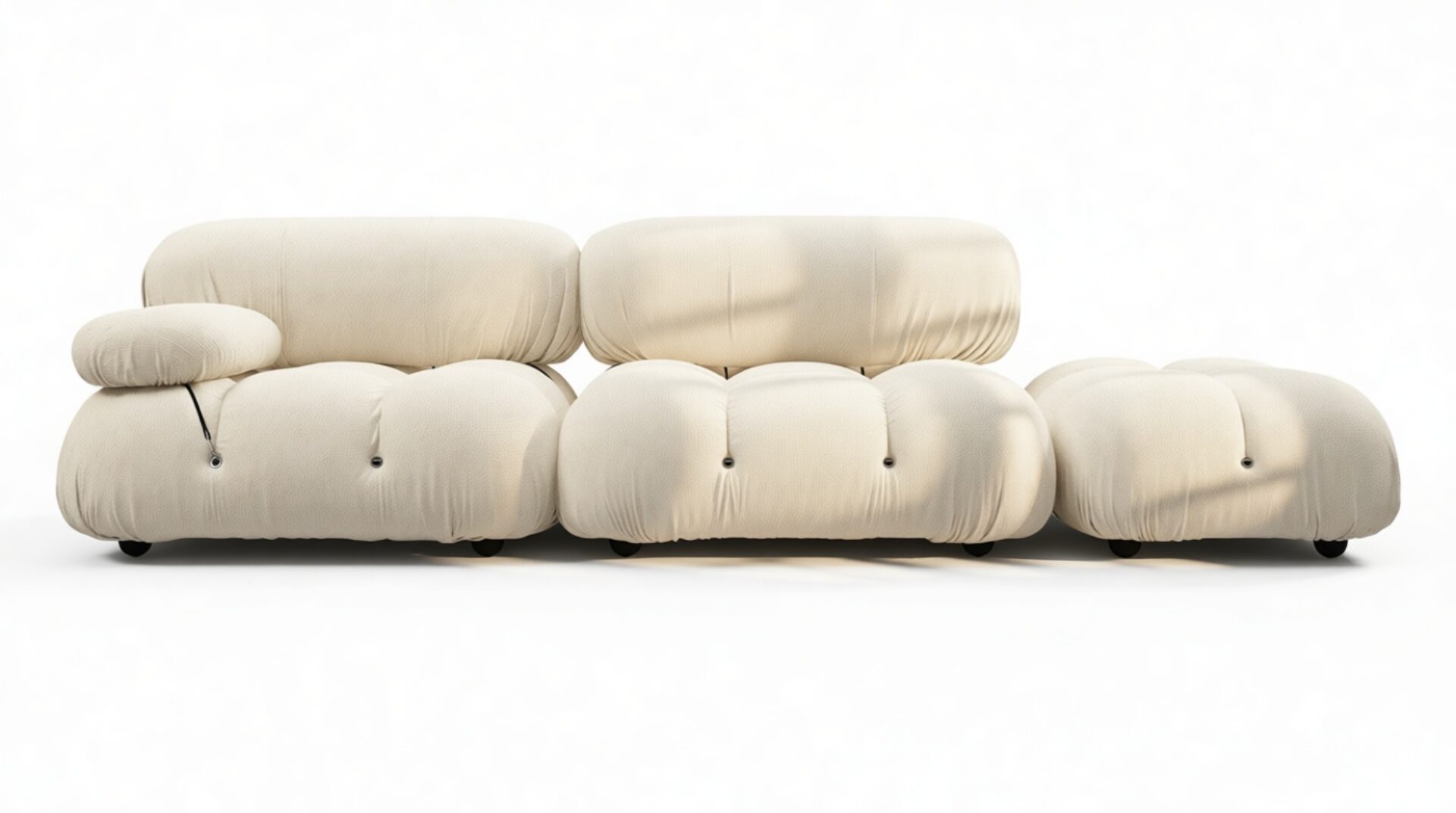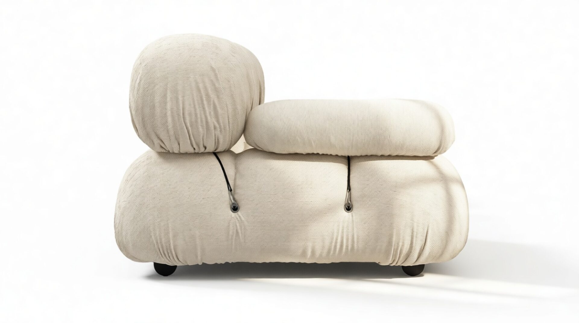 - Modular Instructions: Each section of the Mario Bellini Sofa is modular and is attached with string ties and carabiners. To assemble or rearrange your sofa, simply unclip the carabiners from one ring and attach to a corresponding ring on the module you wish to connect to.