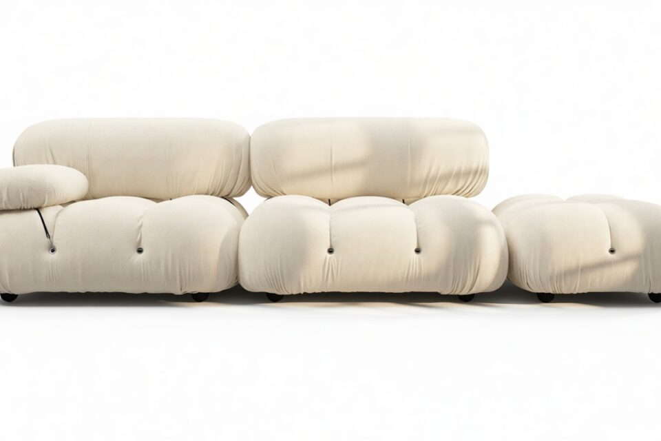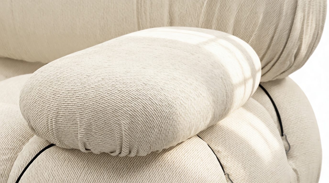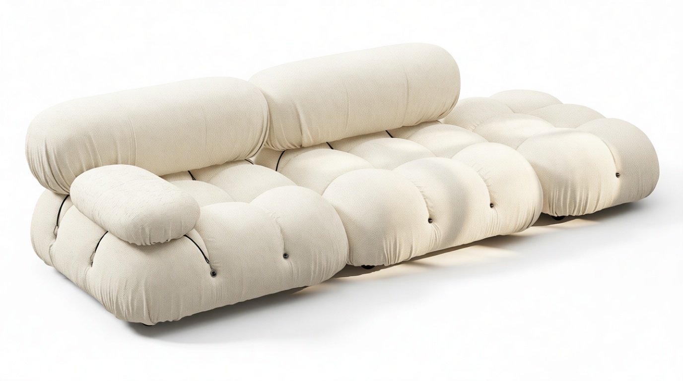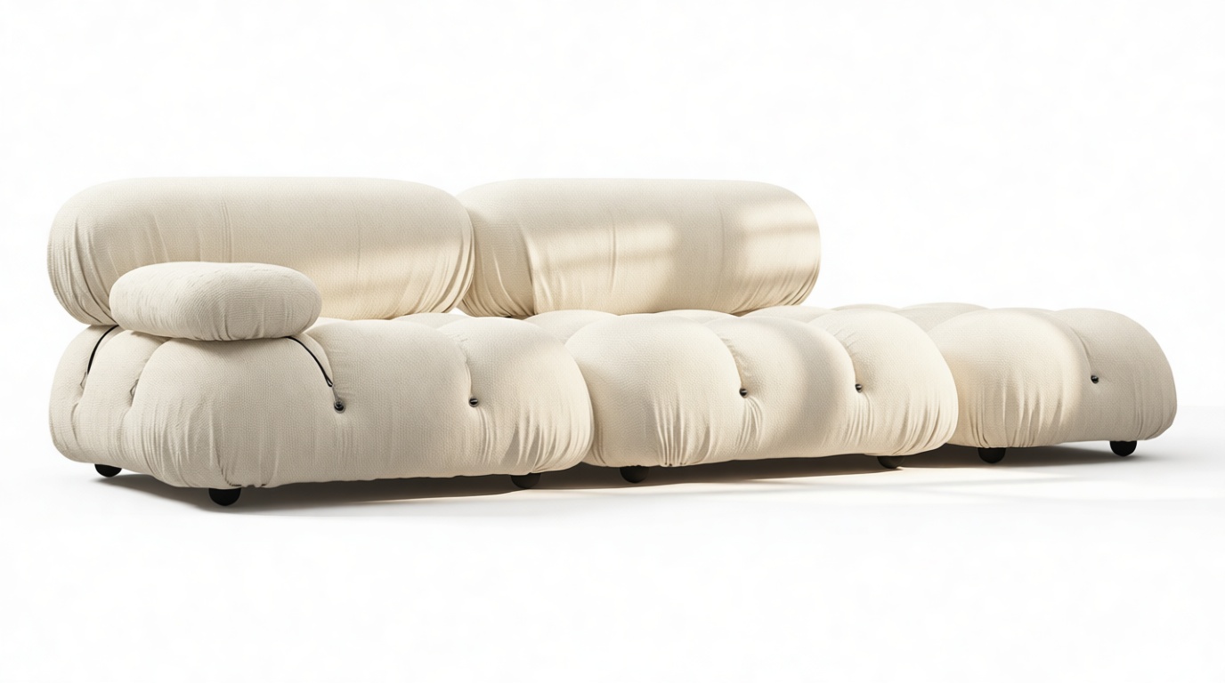 - Modular Instructions: Each section of the Mario Bellini Sofa is modular and is attached with string ties and carabiners. To assemble or rearrange your sofa, simply unclip the carabiners from one ring and attach to a corresponding ring on the module you wish to connect to.