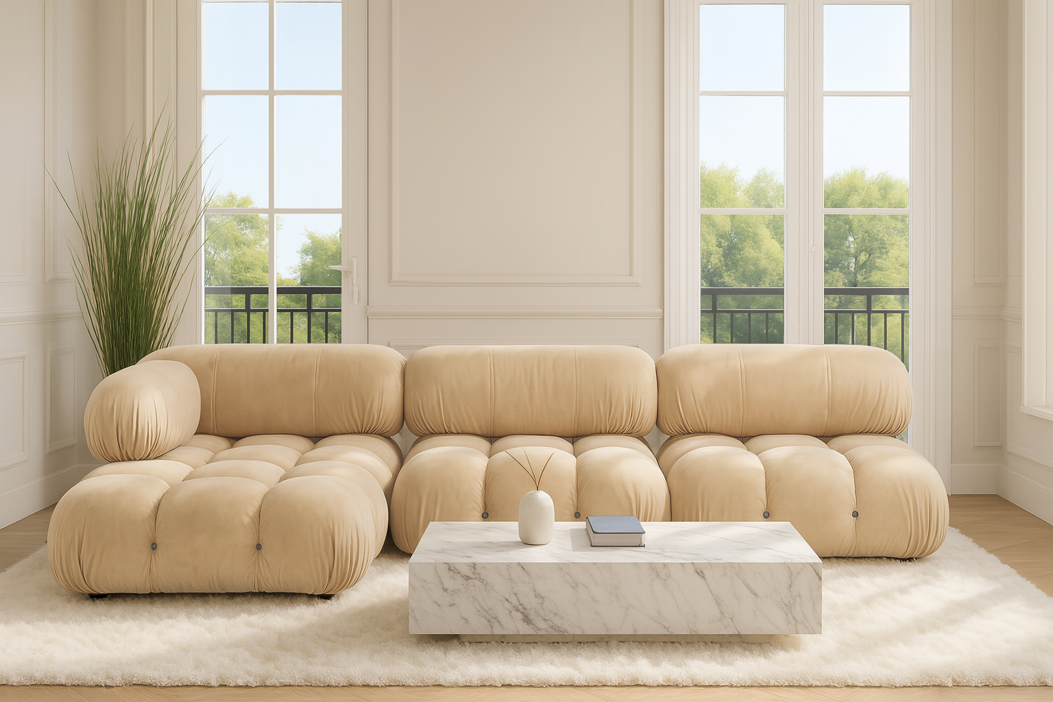 Step back into the 1970s with the Bellini sectional sofa, embodying groovy vibes and carefree living. Defying tradition, its modular design offers liberation for your space, effortlessly customizable to suit your layout and mood. Crafted with a durable wooden frame and plush cold-pressed foam wrapped in soft Ecru Velvet fabric, the Bellini exudes relaxed luxury and style.