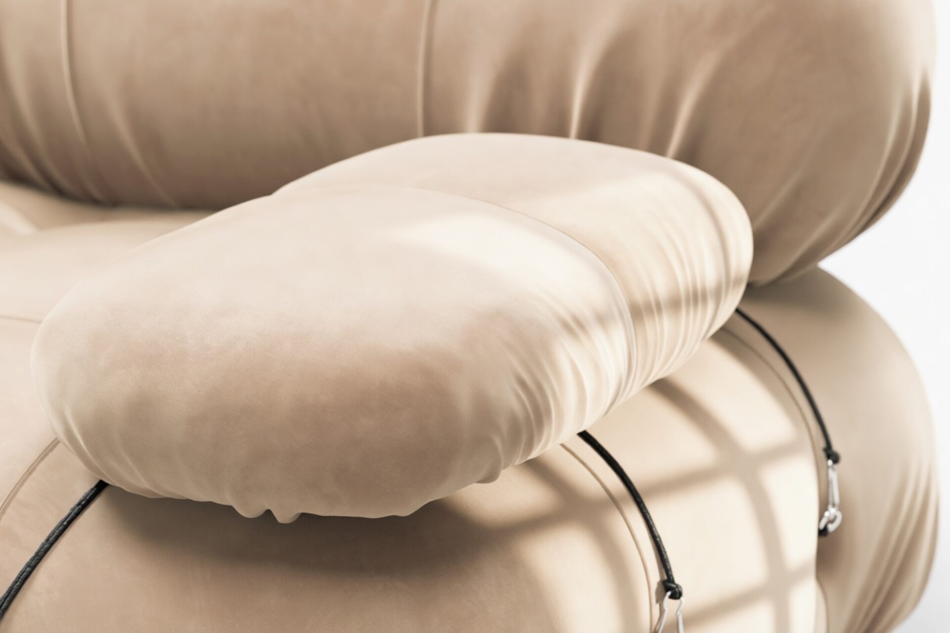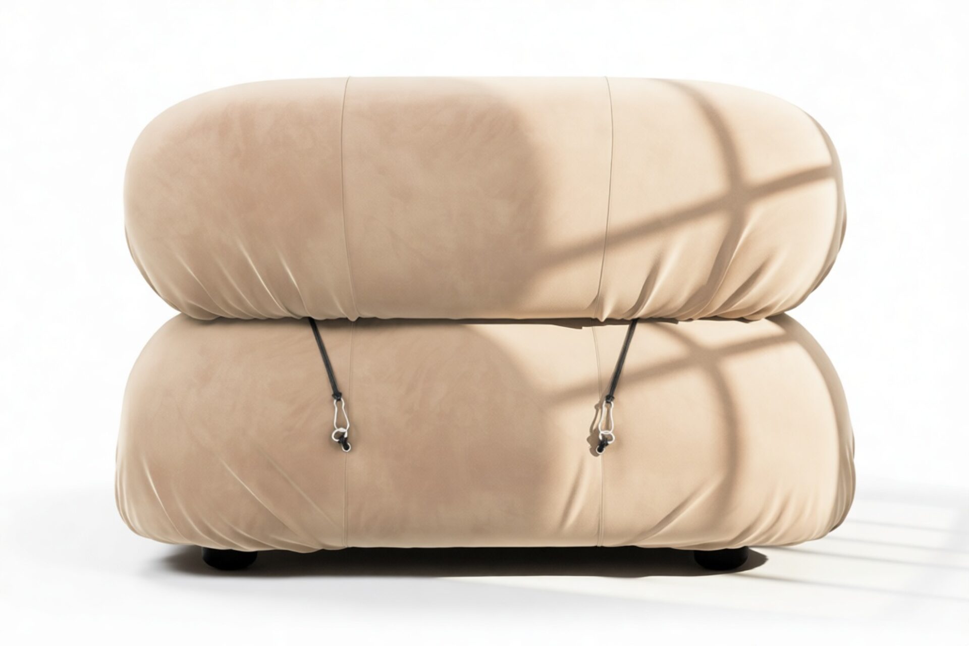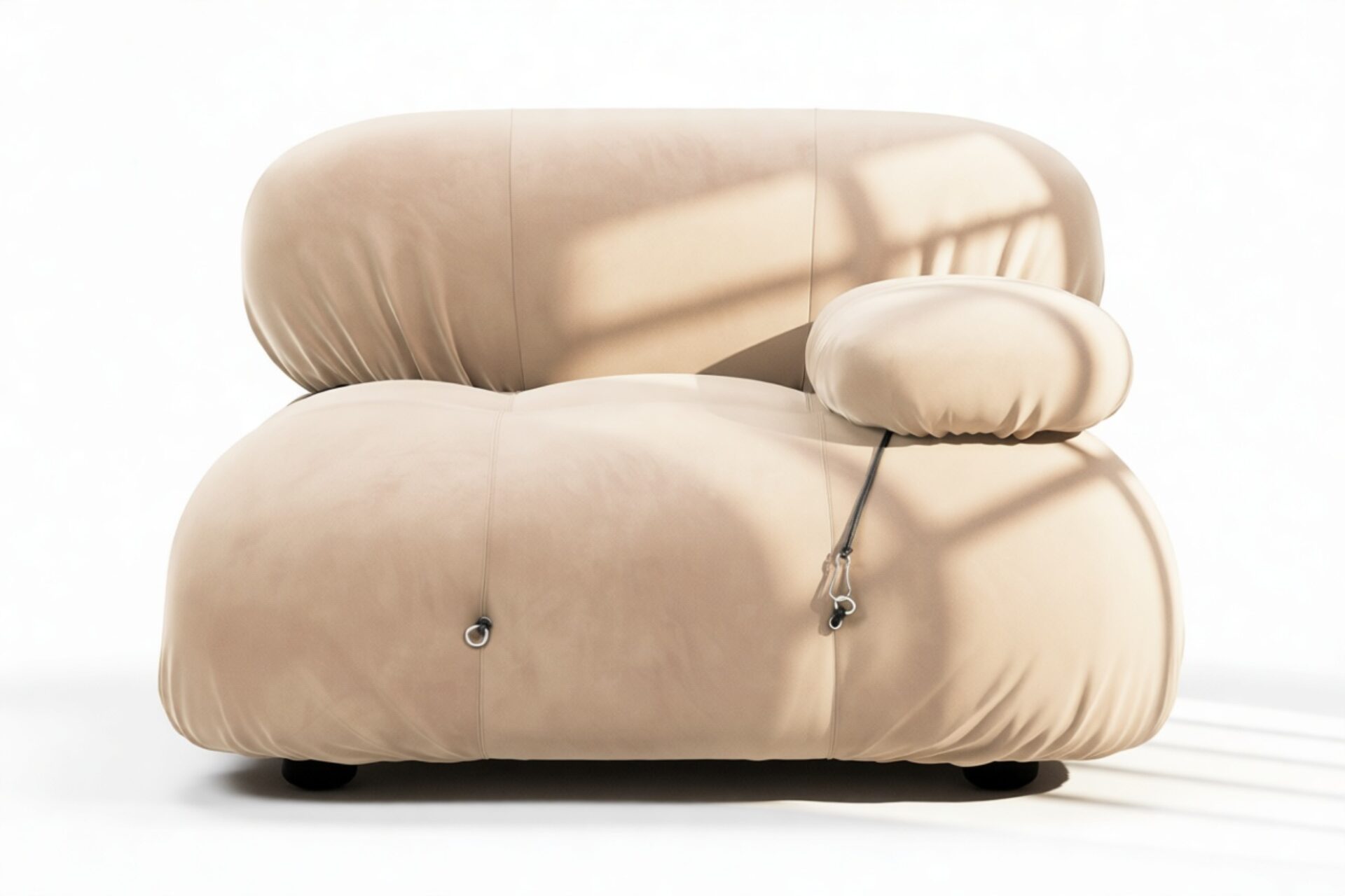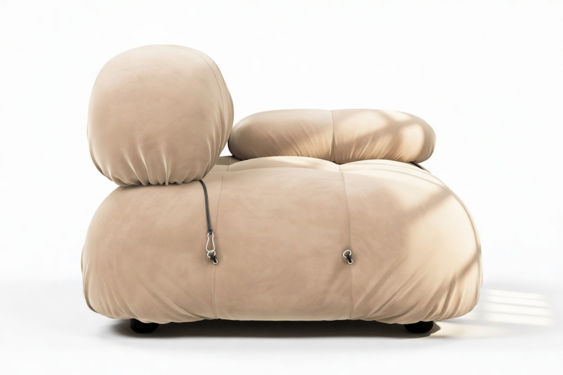 - Modular Instructions: Each section of the Mario Bellini Sofa is modular and is attached with string ties and carabiners. To assemble or rearrange your sofa, simply unclip the carabiners from one ring and attach to a corresponding ring on the module you wish to connect to.