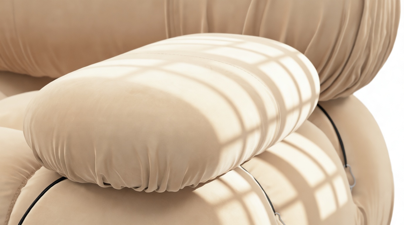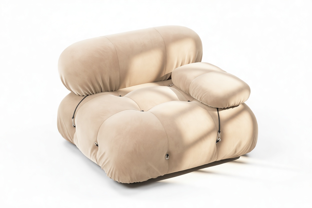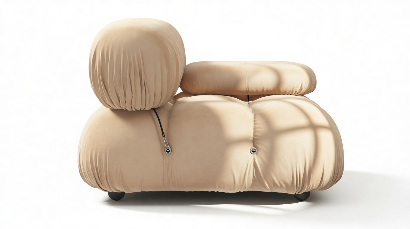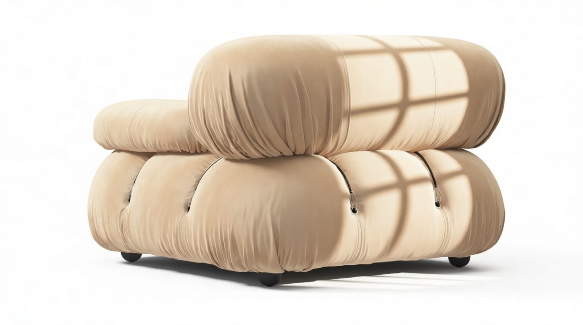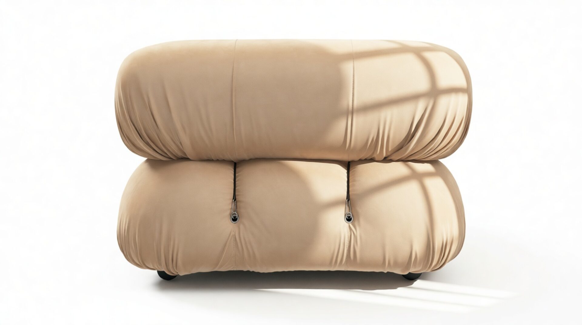 - Modular Instructions: Each section of the Mario Bellini Sofa is modular and is attached with string ties and carabiners. To assemble or rearrange your sofa, simply unclip the carabiners from one ring and attach to a corresponding ring on the module you wish to connect to.