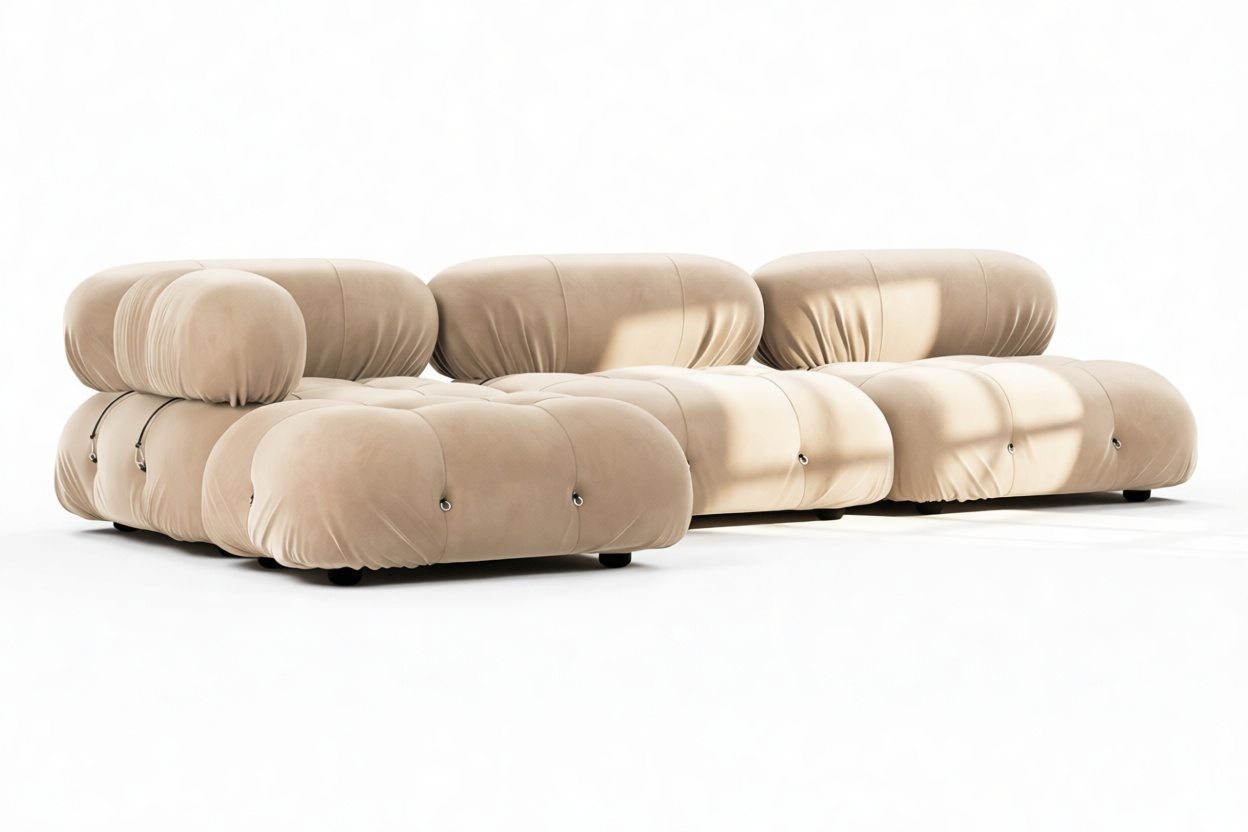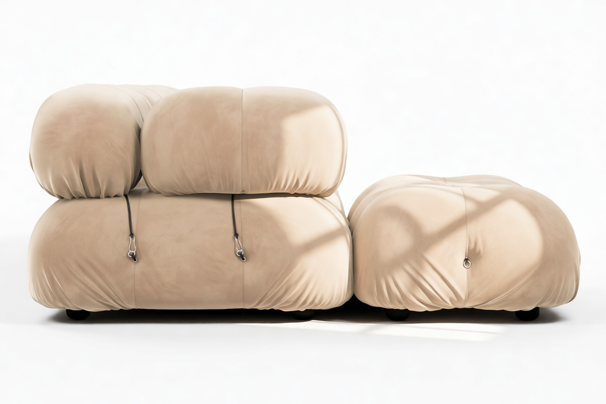 Step back in time to the 1970s with the Bellini sectional sofa, exuding groovy vibes and carefree living. Its modular design brings liberation to your space, easily customizable to suit your layout, style, and mood. Embraced by a new generation, this sofa features tie rods and rings, allowing effortless rearrangement. Crafted with a sturdy wooden frame and plush cold-pressed foam enveloped in ecru velvet, the Bellini combines relaxed luxury with endless configuration options. Unwind in style with its inviting cushions and personalized seating experience.