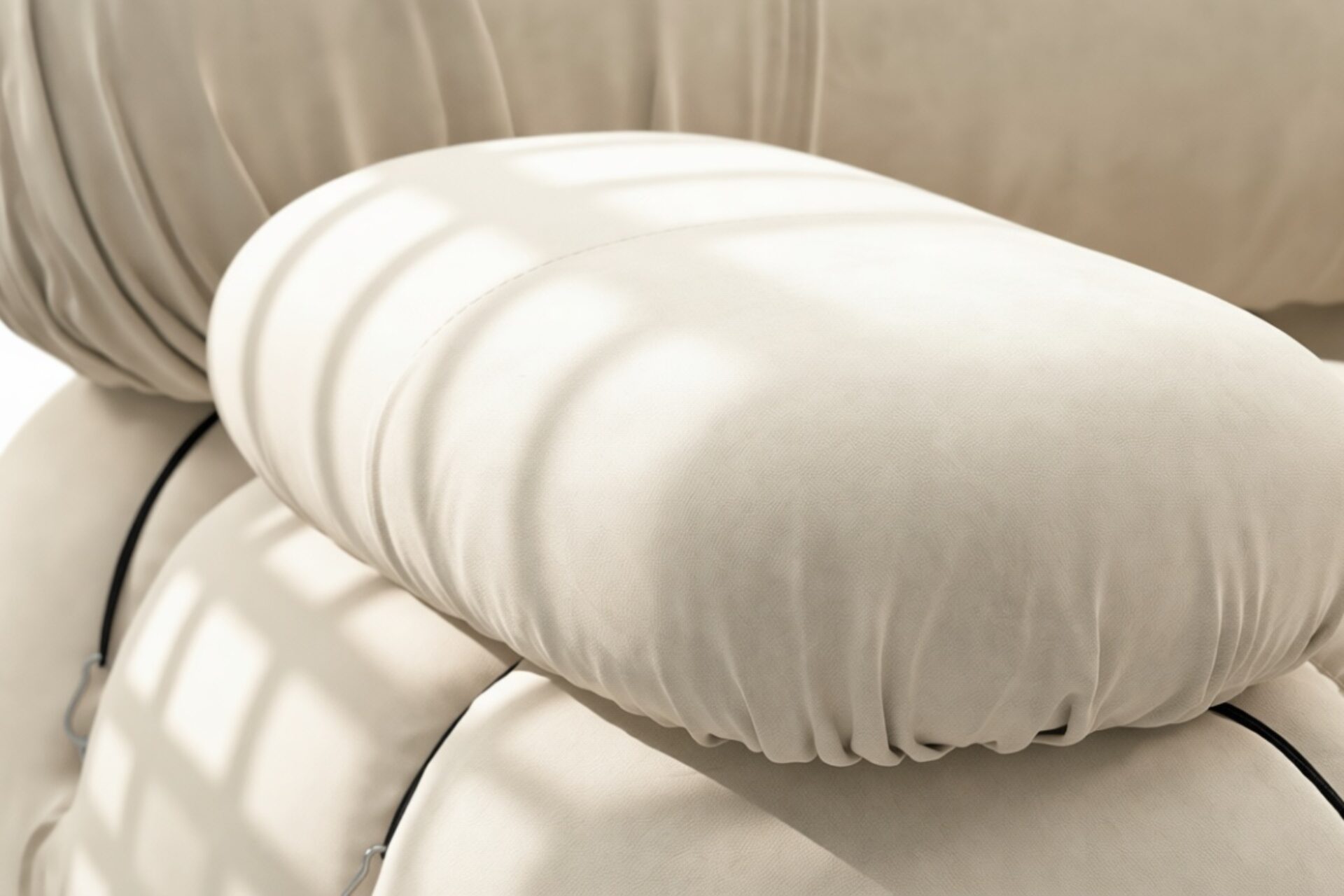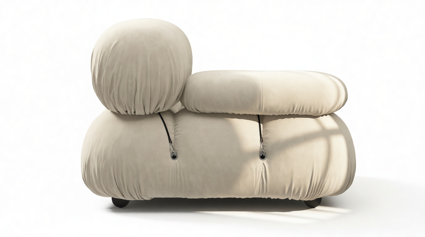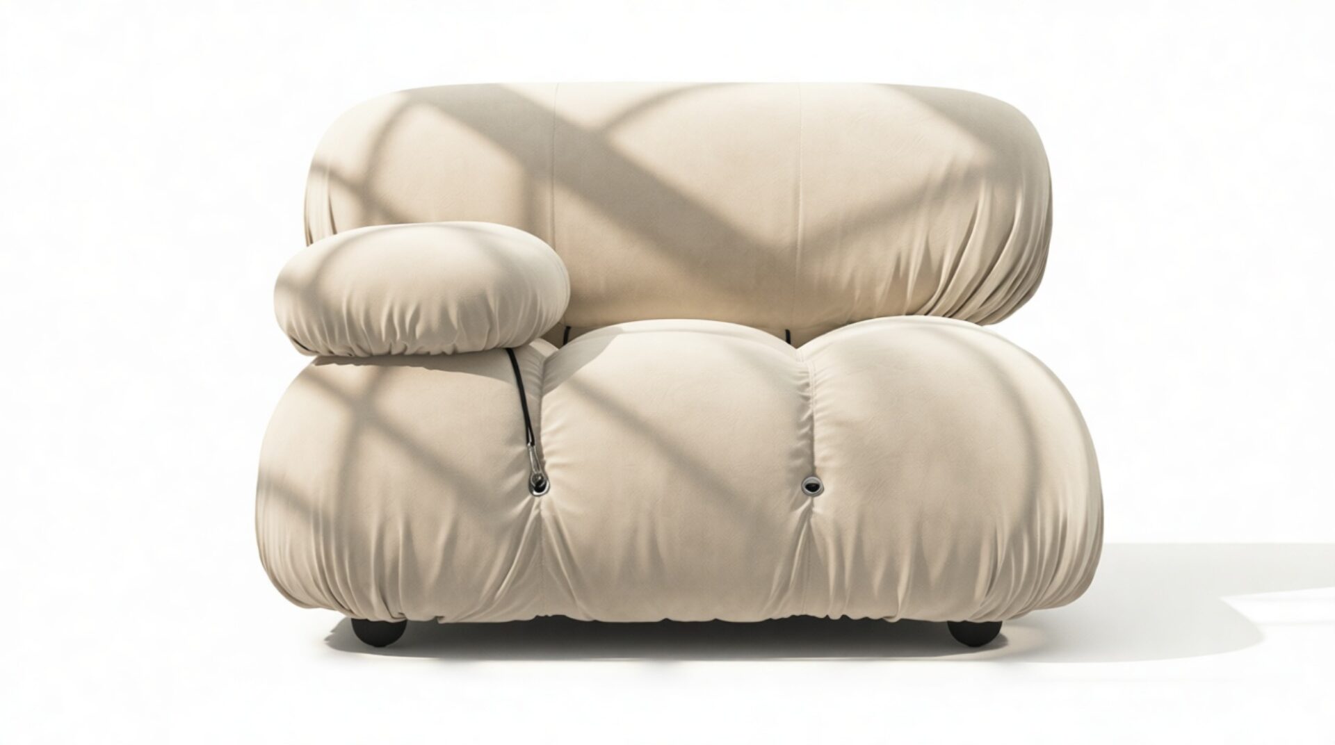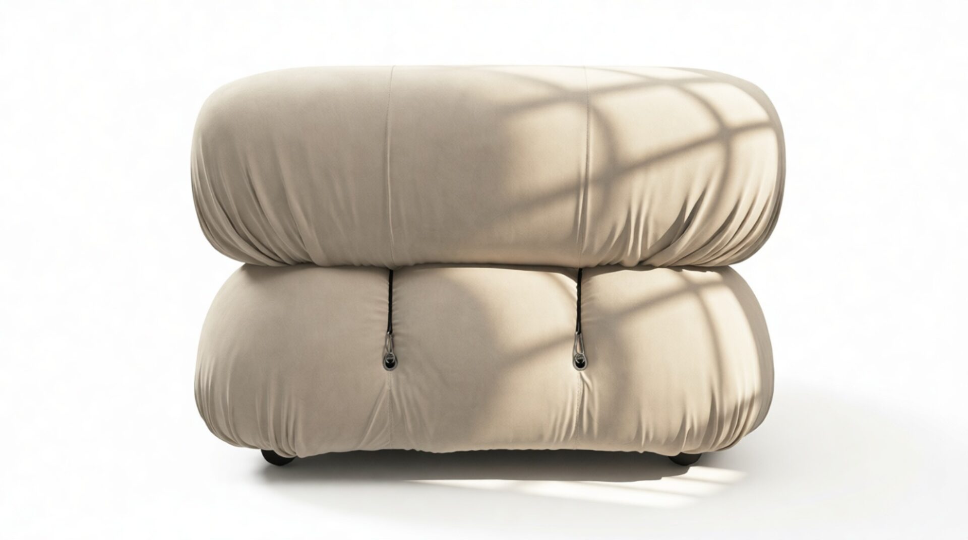 - Modular Instructions: Each section of the Mario Bellini Sofa is modular and is attached with string ties and carabiners. To assemble or rearrange your sofa, simply unclip the carabiners from one ring and attach to a corresponding ring on the module you wish to connect to.