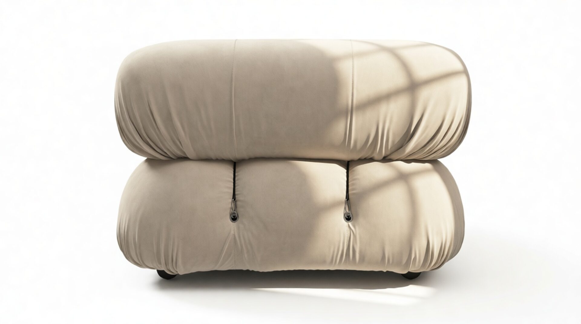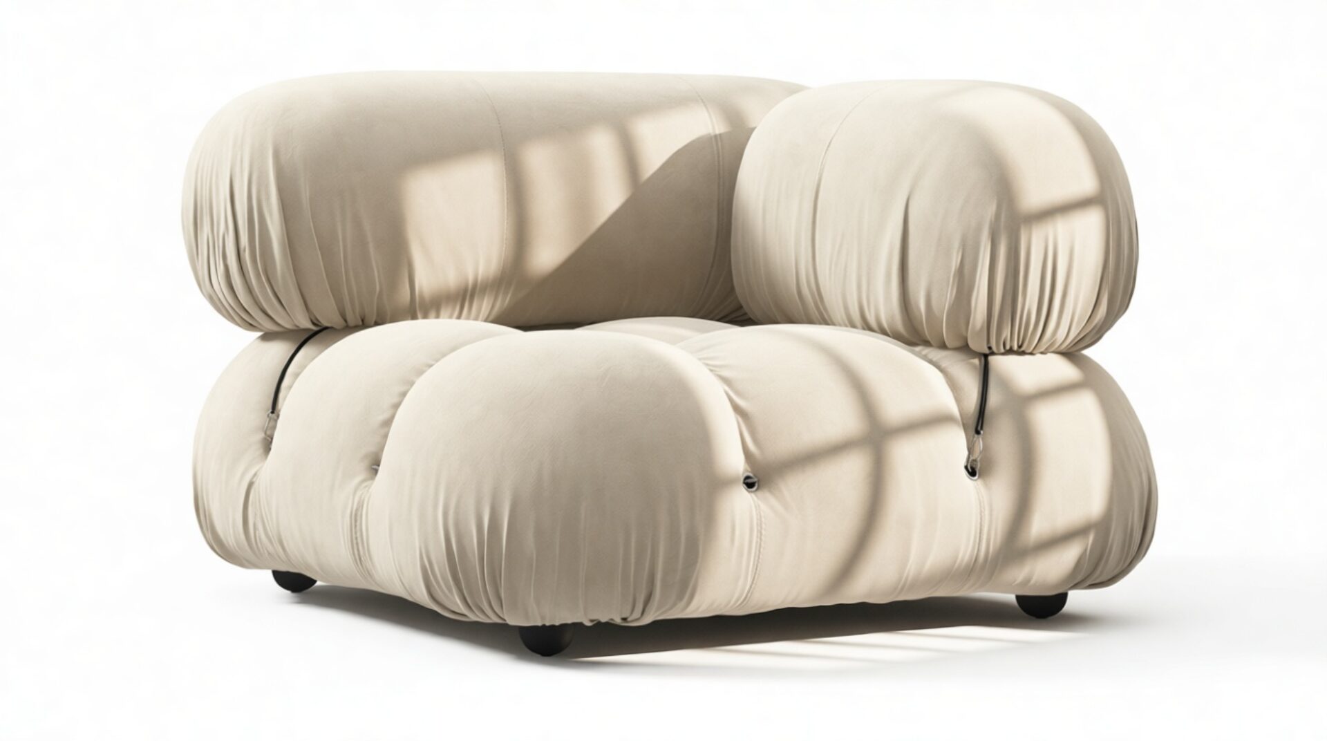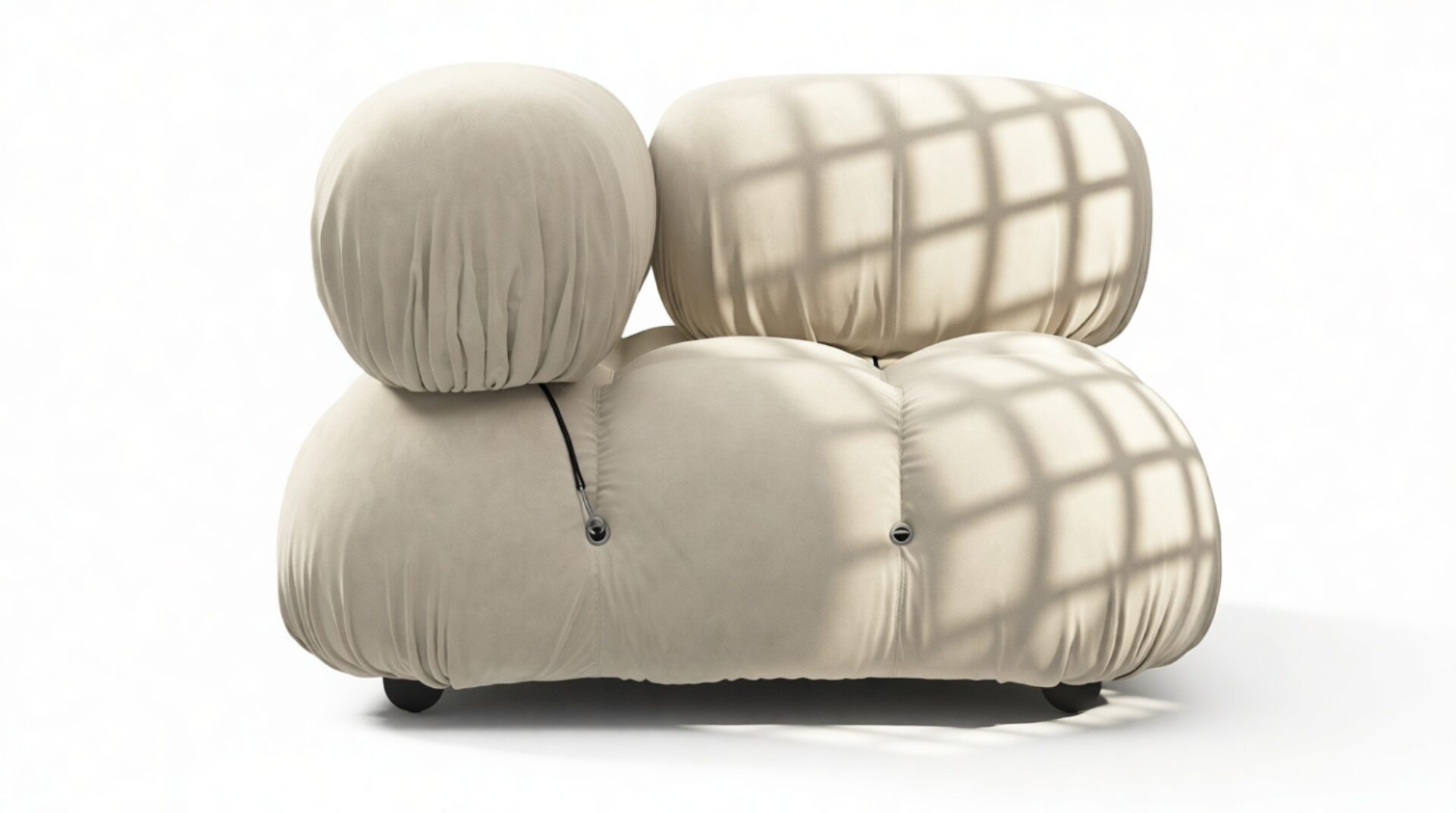- Modular Instructions: Each section of the Mario Bellini Sofa is modular and is attached with string ties and carabiners. To assemble or rearrange your sofa, simply unclip the carabiners from one ring and attach to a corresponding ring on the module you wish to connect to.