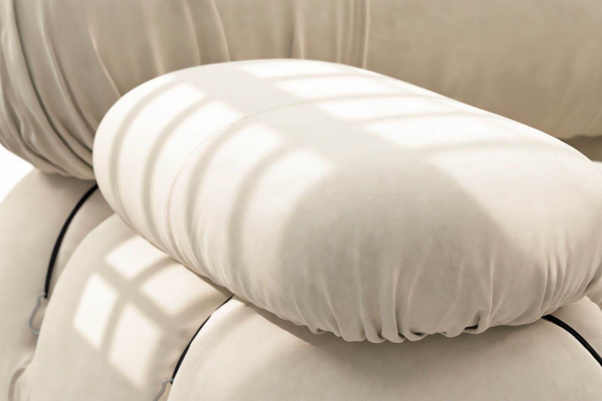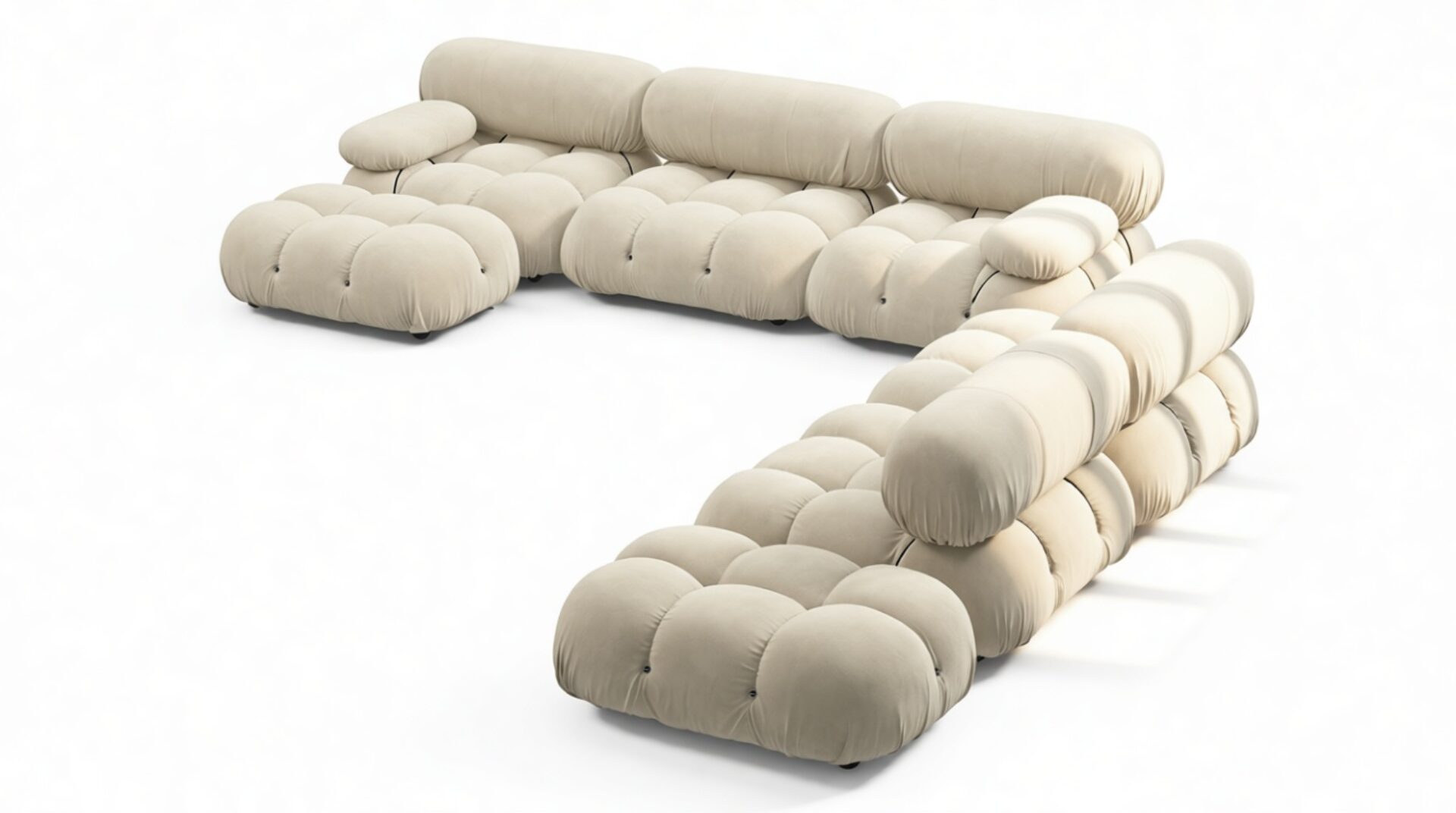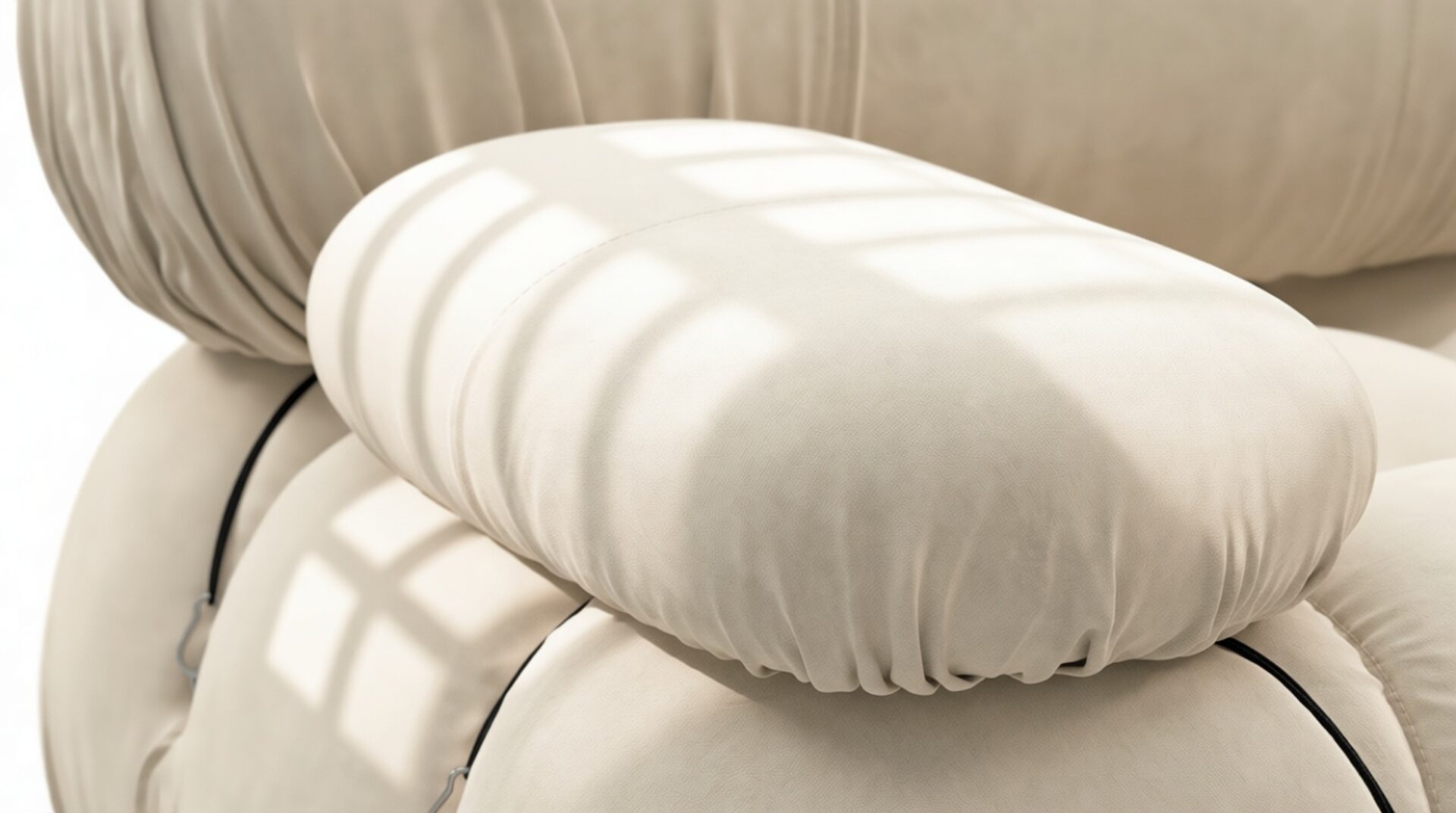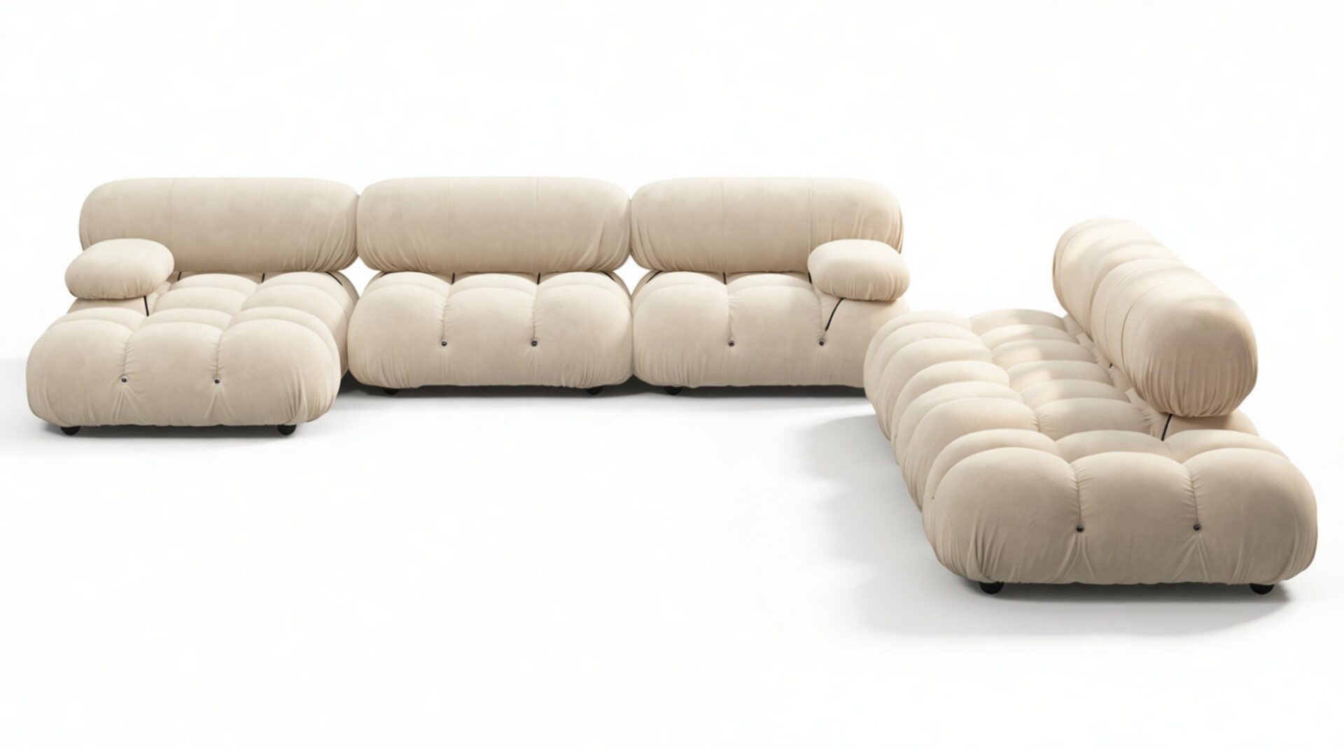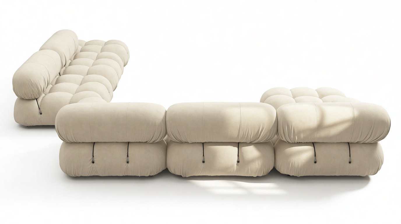 - Modular Instructions: Each section of the Mario Bellini Sofa is modular and is attached with string ties and carabiners. To assemble or rearrange your sofa, simply unclip the carabiners from one ring and attach to a corresponding ring on the module you wish to connect to.