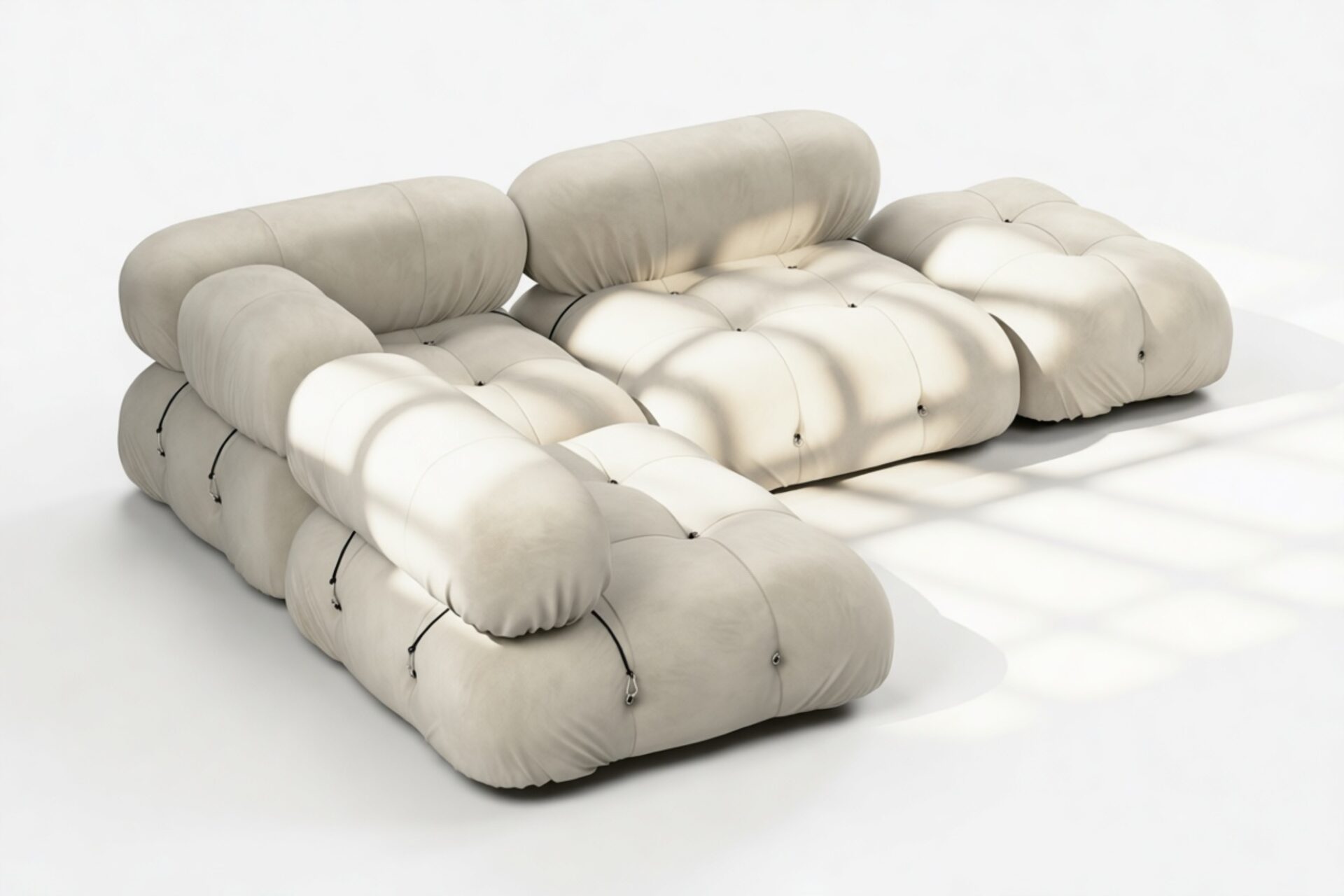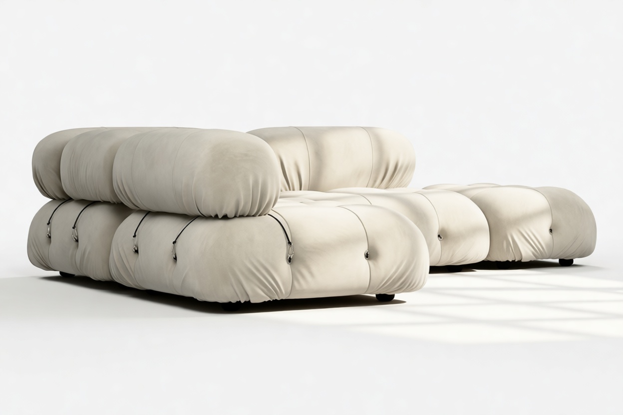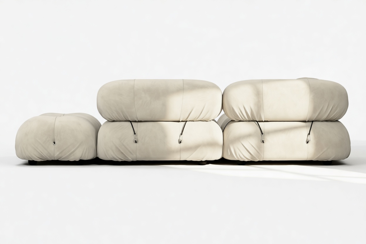 Step into the retro charm of the 1970s with the Bellini sectional sofa, epitomizing freedom and style. Crafted with tie rods and rings for easy rearrangement, it adapts effortlessly to your evolving tastes. Embrace its low-profile silhouette, thanks to a sturdy wooden frame, plush cold-pressed foam, and soft Eggshell Vegan Suede fabric, offering the perfect balance of luxury and comfort.