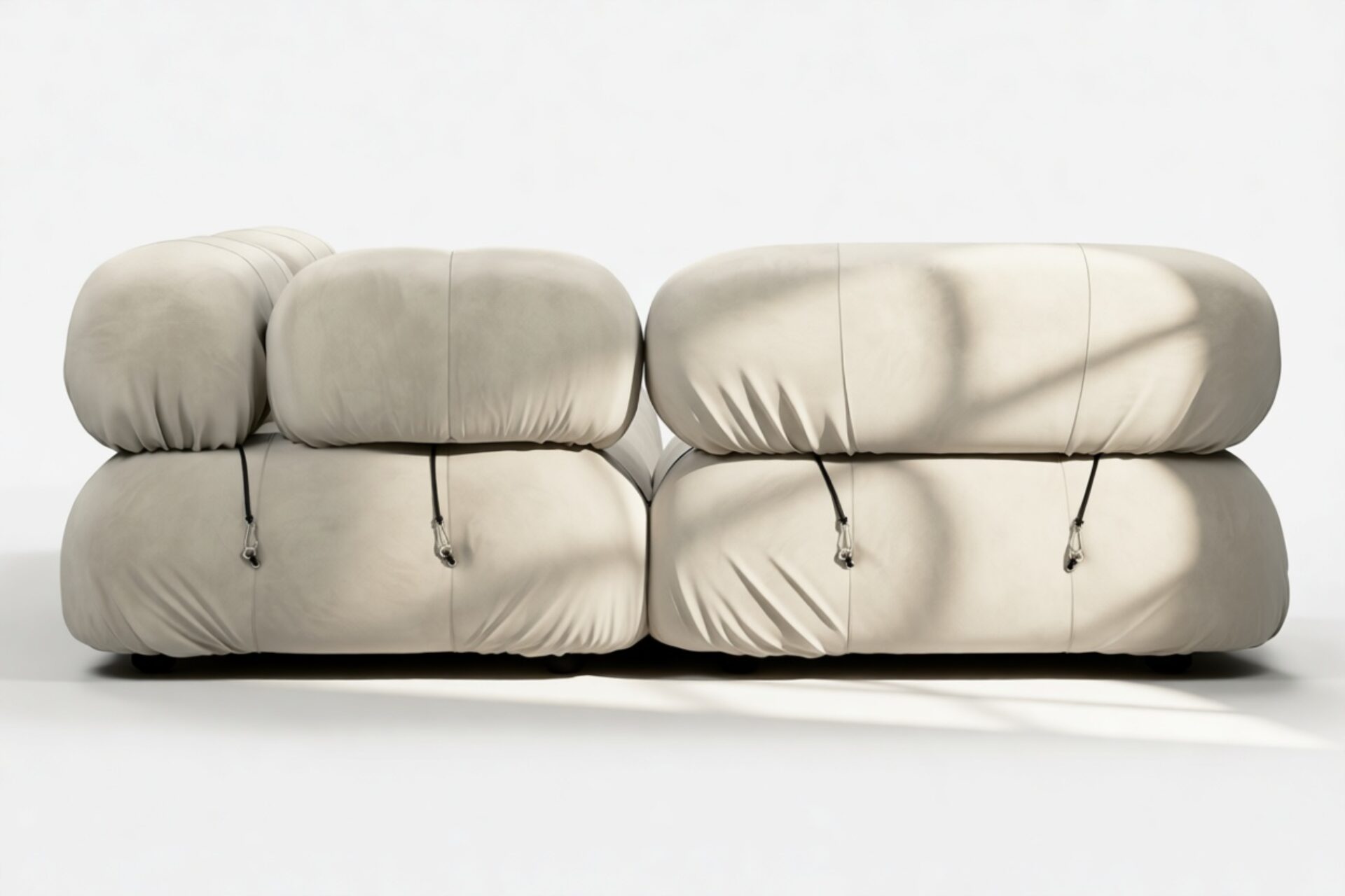 - Modular Instructions: Each section of the Mario Bellini Sofa is modular and is attached with string ties and carabiners. To assemble or rearrange your sofa, simply unclip the carabiners from one ring and attach to a corresponding ring on the module you wish to connect to.