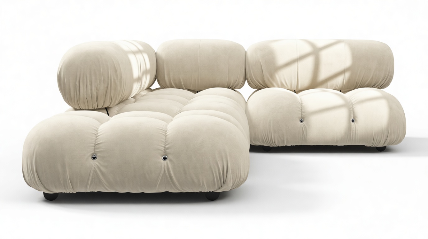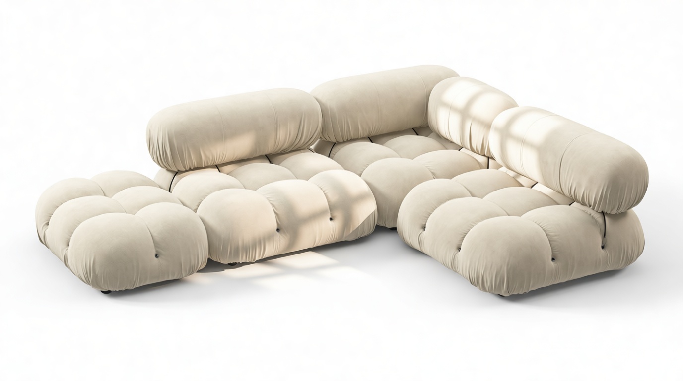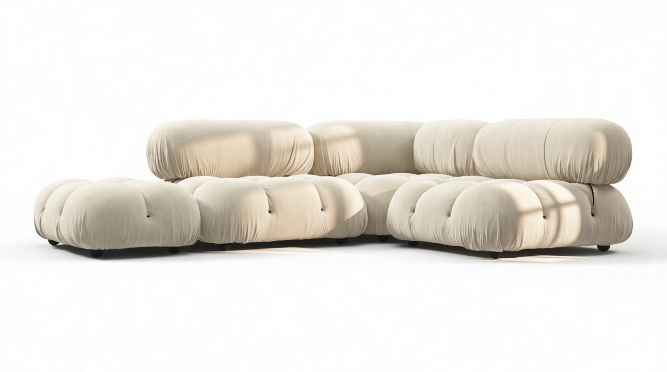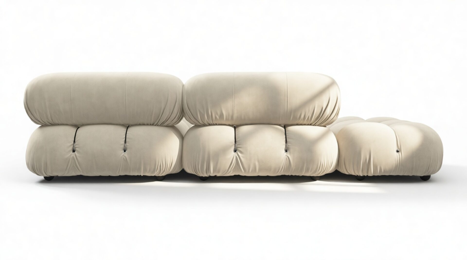 - Modular Instructions: Each section of the Mario Bellini Sofa is modular and is attached with string ties and carabiners. To assemble or rearrange your sofa, simply unclip the carabiners from one ring and attach to a corresponding ring on the module you wish to connect to.