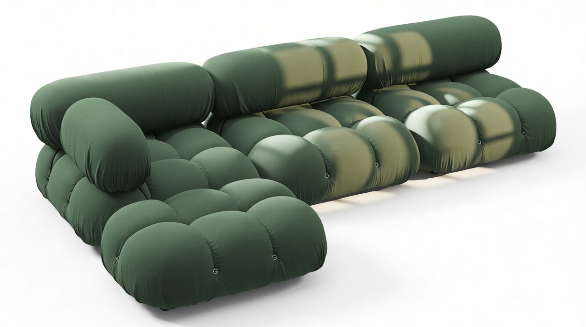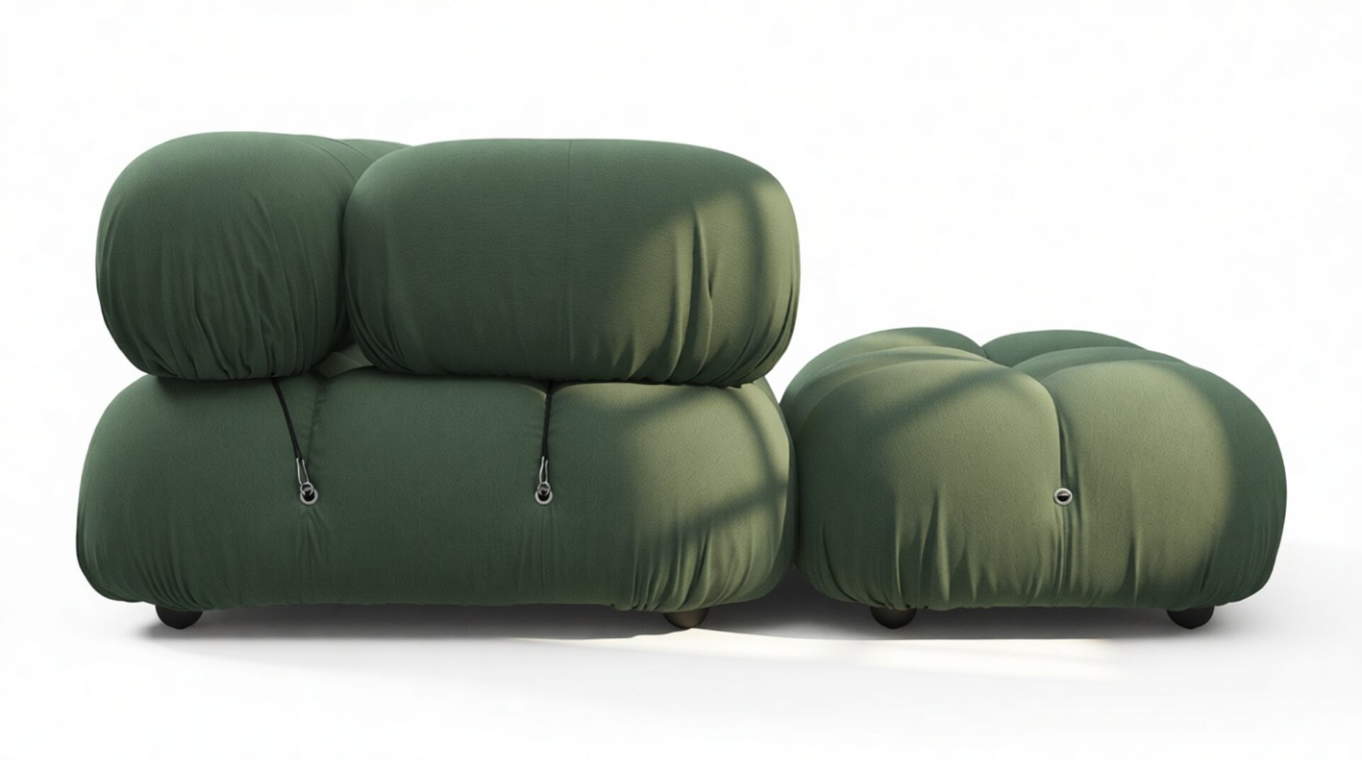 - Modular Instructions: Each section of the Mario Bellini Sofa is modular and is attached with string ties and carabiners. To assemble or rearrange your sofa, simply unclip the carabiners from one ring and attach to a corresponding ring on the module you wish to connect to.