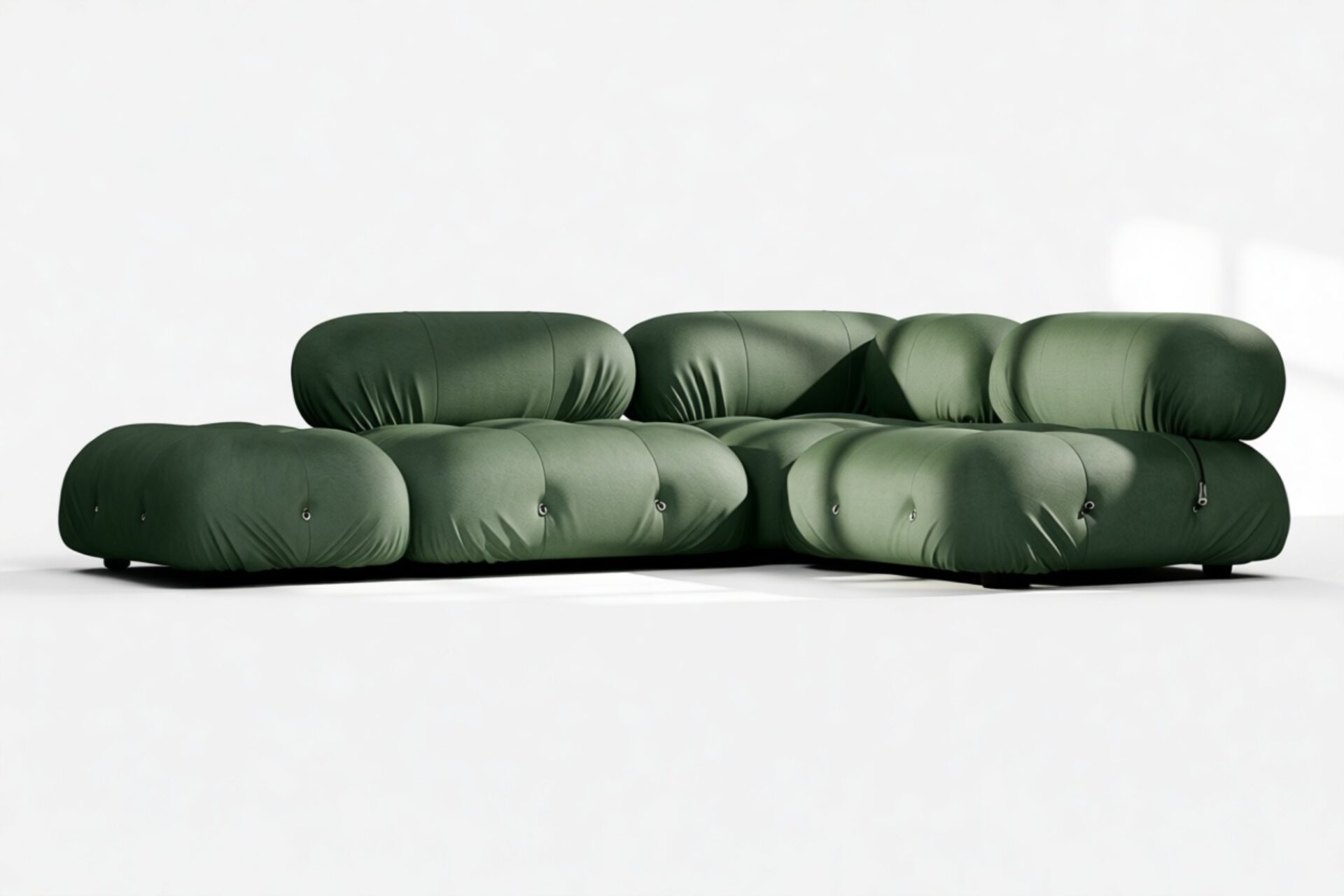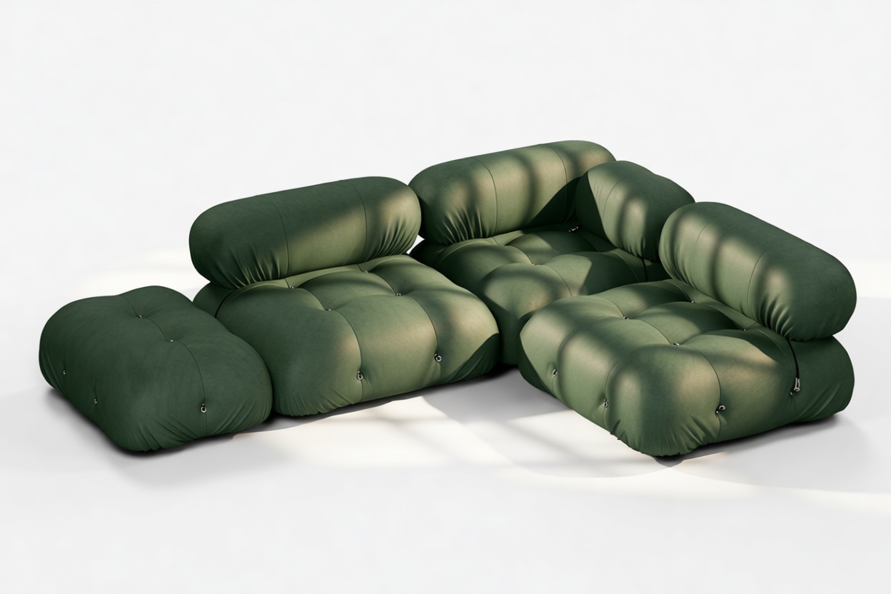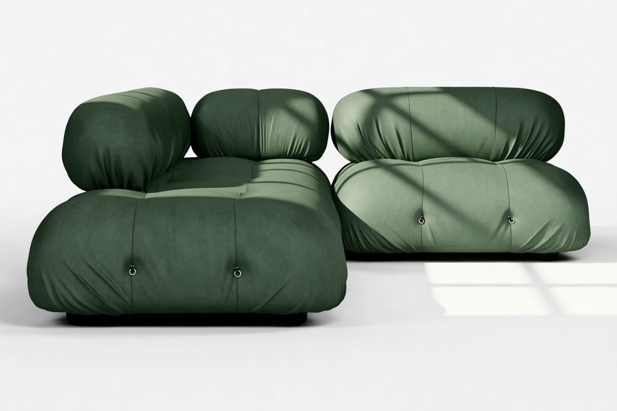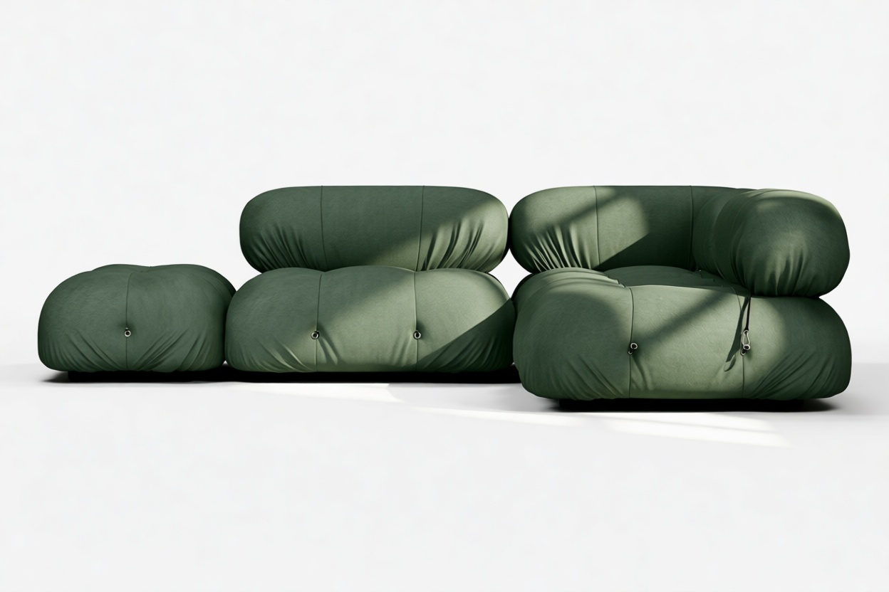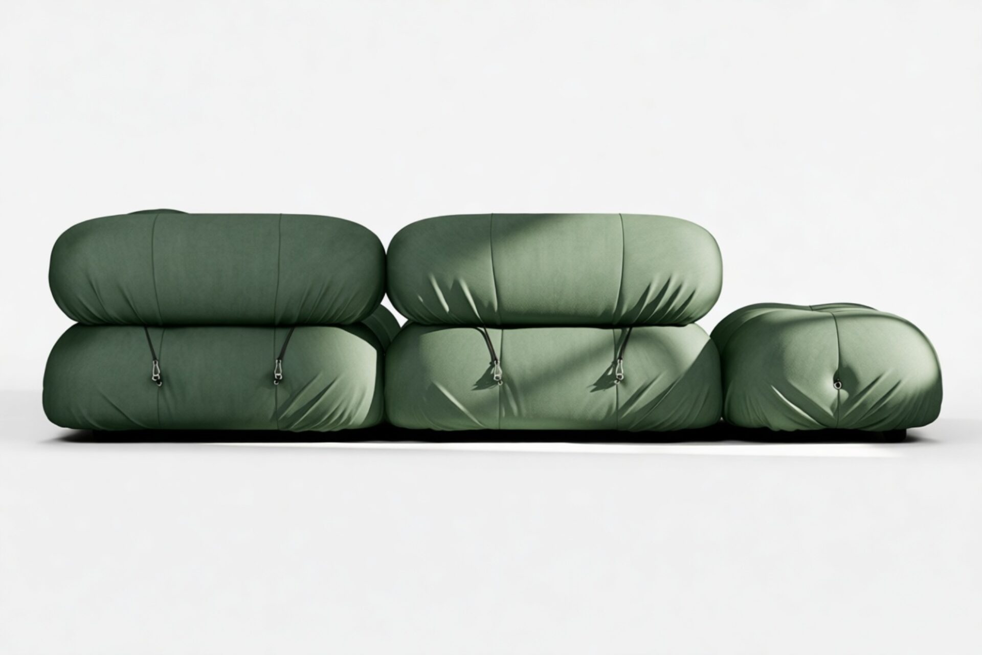 - Modular Instructions: Each section of the Mario Bellini Sofa is modular and is attached with string ties and carabiners. To assemble or rearrange your sofa, simply unclip the carabiners from one ring and attach to a corresponding ring on the module you wish to connect to.