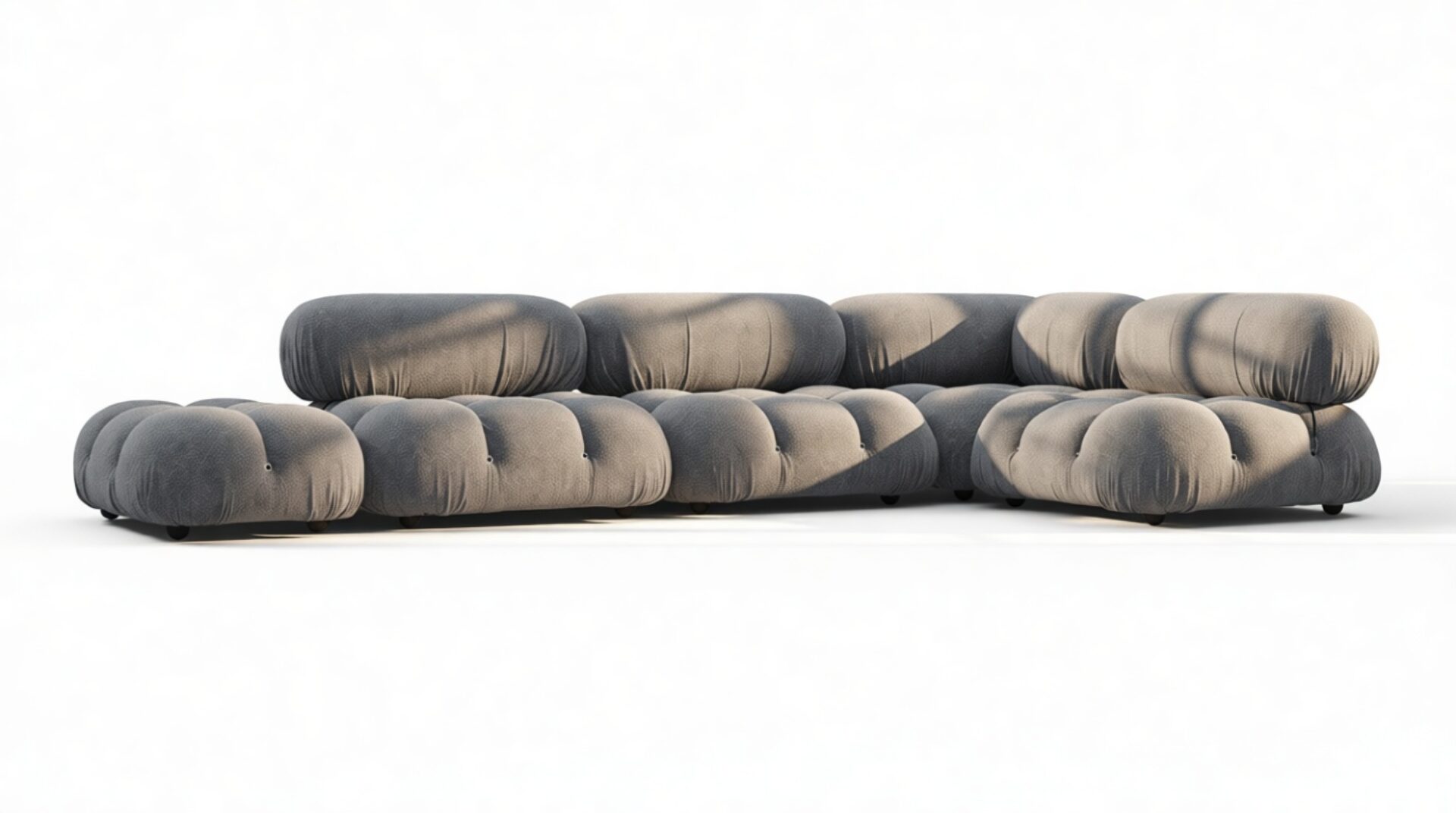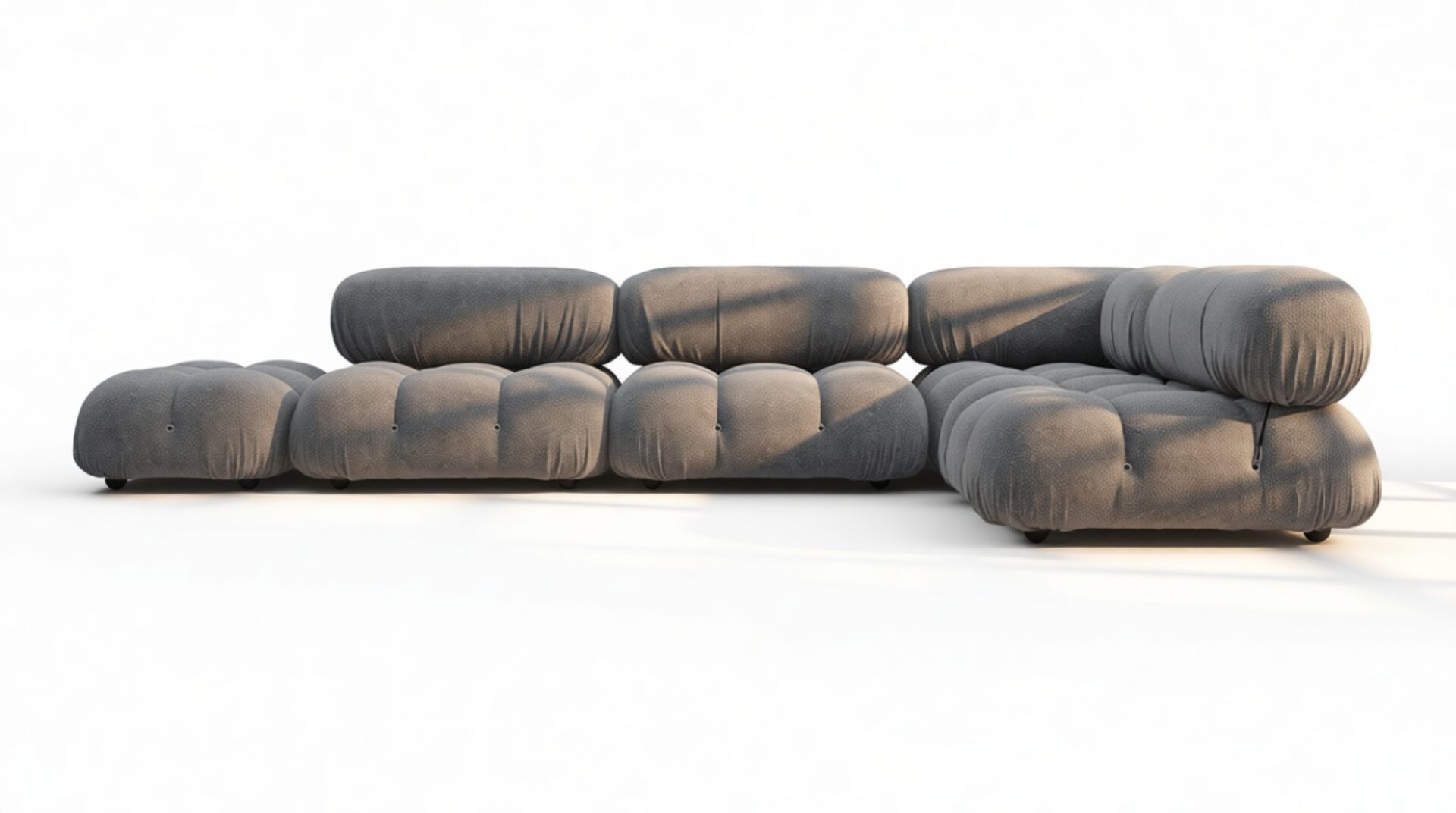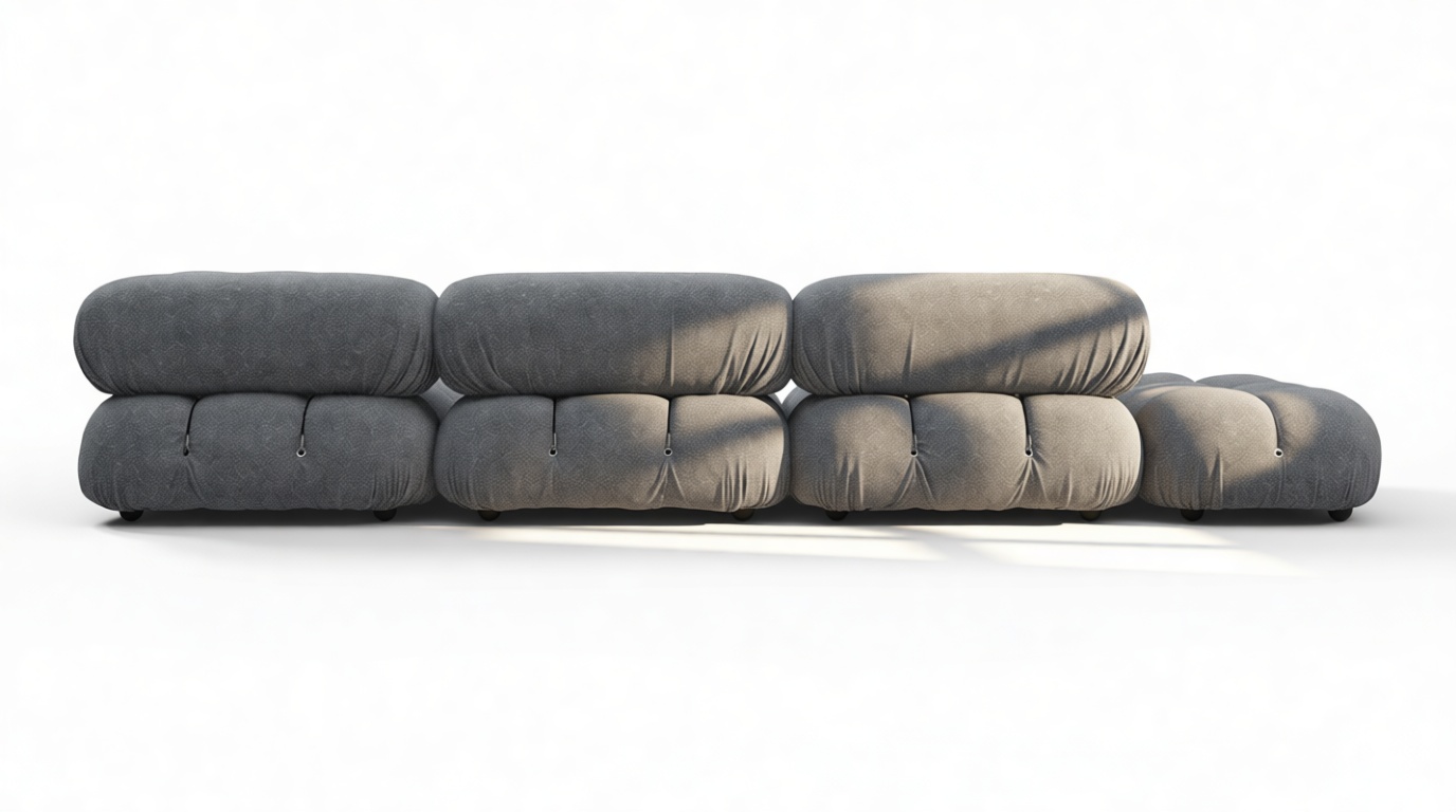 - Modular Instructions: Each section of the Mario Bellini Sofa is modular and is attached with string ties and carabiners. To assemble or rearrange your sofa, simply unclip the carabiners from one ring and attach to a corresponding ring on the module you wish to connect to.