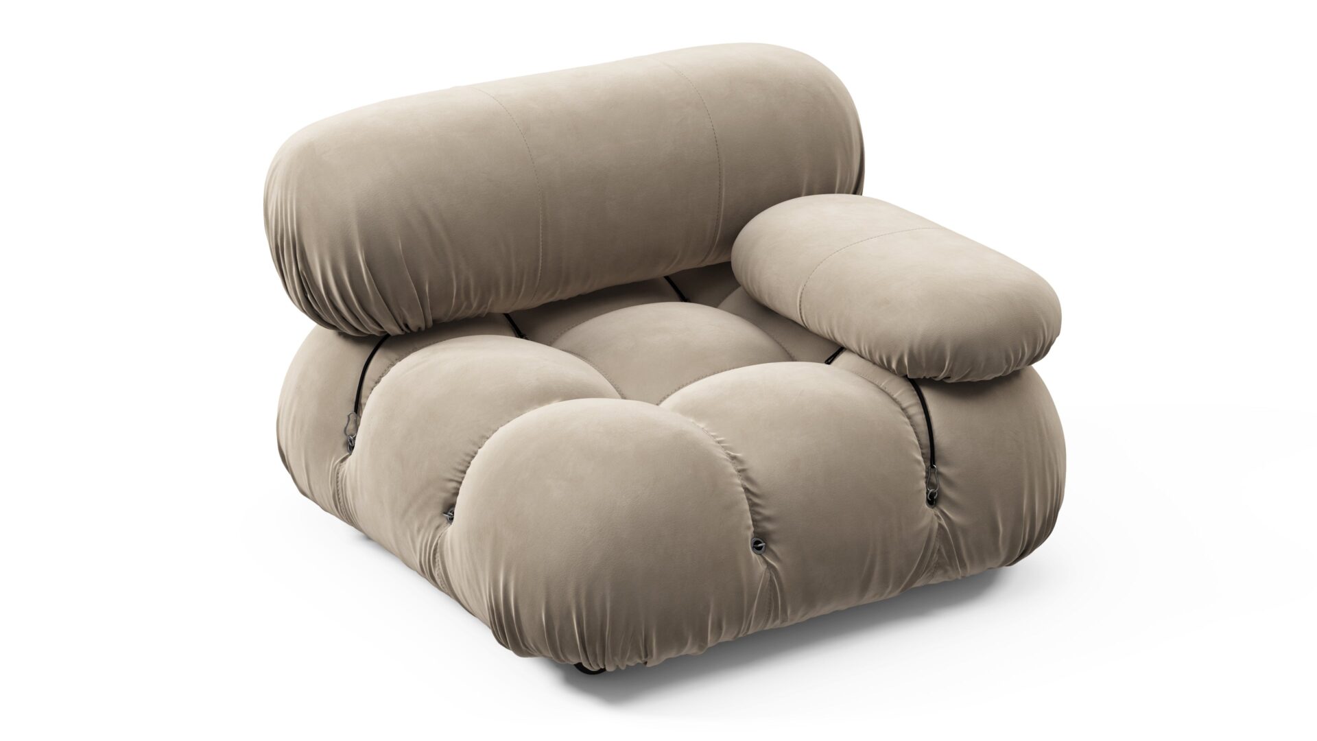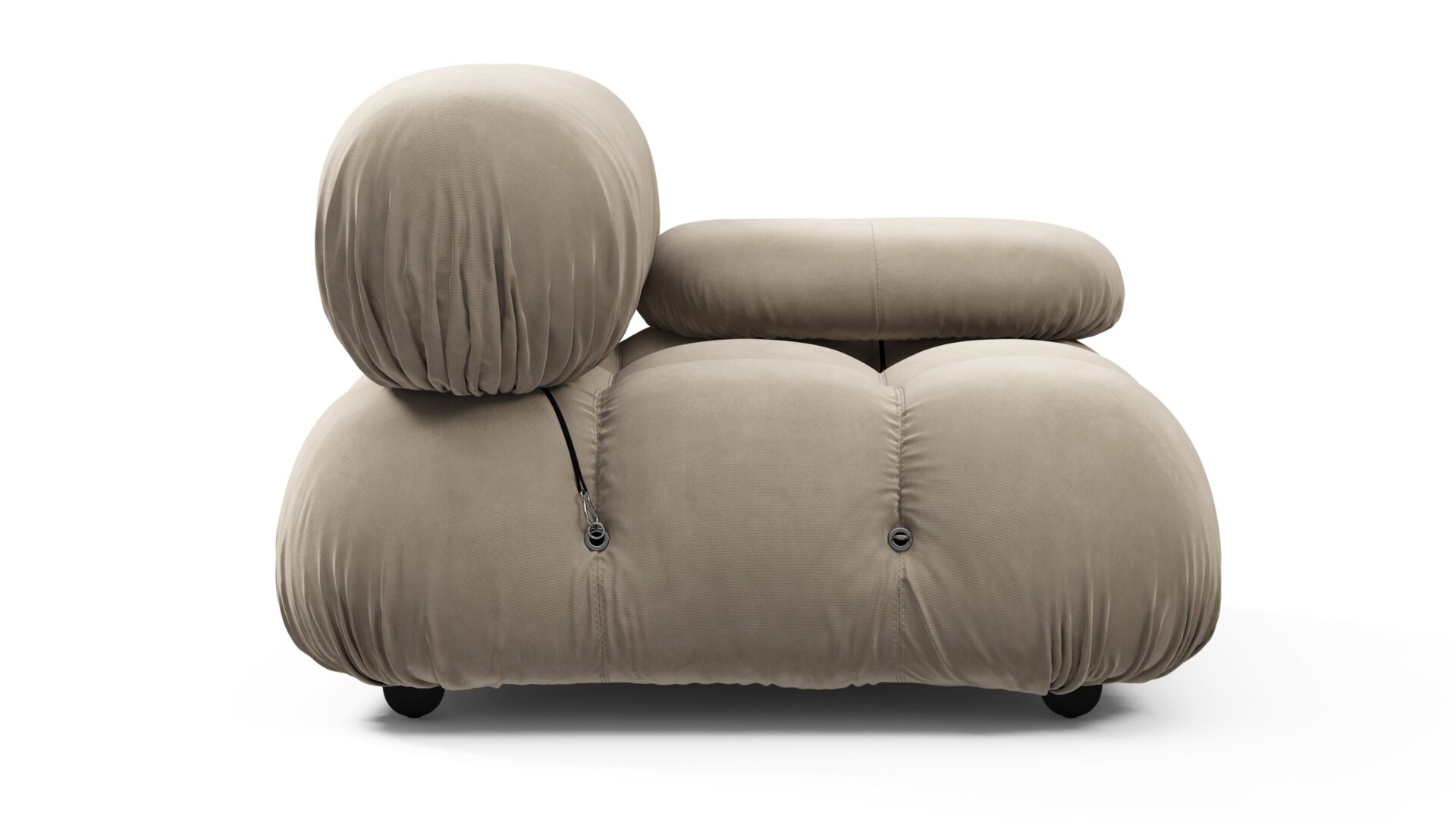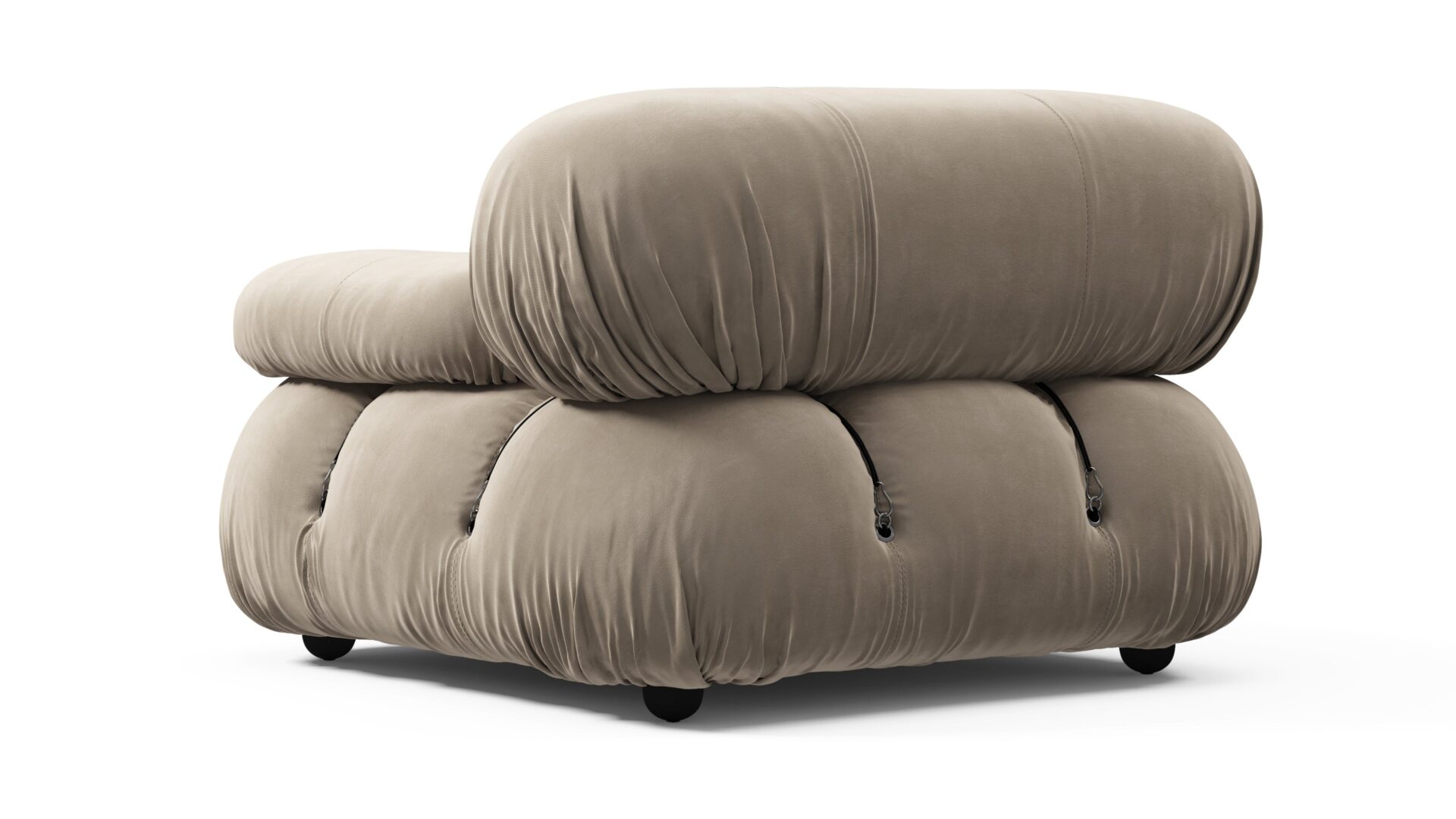 Step back into the iconic 1970s with the Bellini sectional sofa, exuding groovy vibes and free-spirited living. Its modular design offers freedom to personalize your space without a full makeover. Crafted with a sturdy wooden frame and plush cold-pressed foam wrapped in Greige Velvet, the low-profile Bellini invites luxurious relaxation. Customize your layout effortlessly, embody style and comfort unique to your preferences.