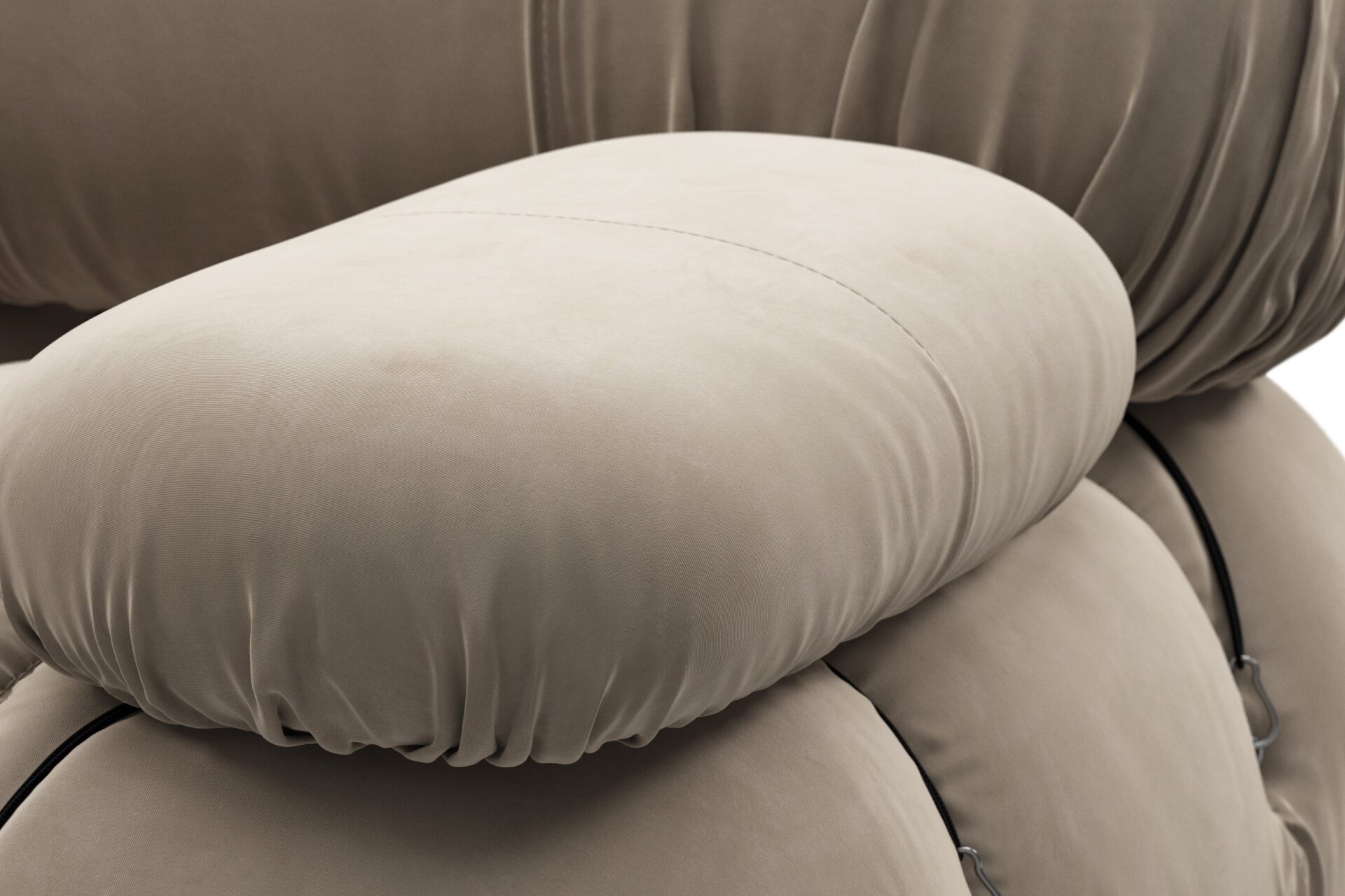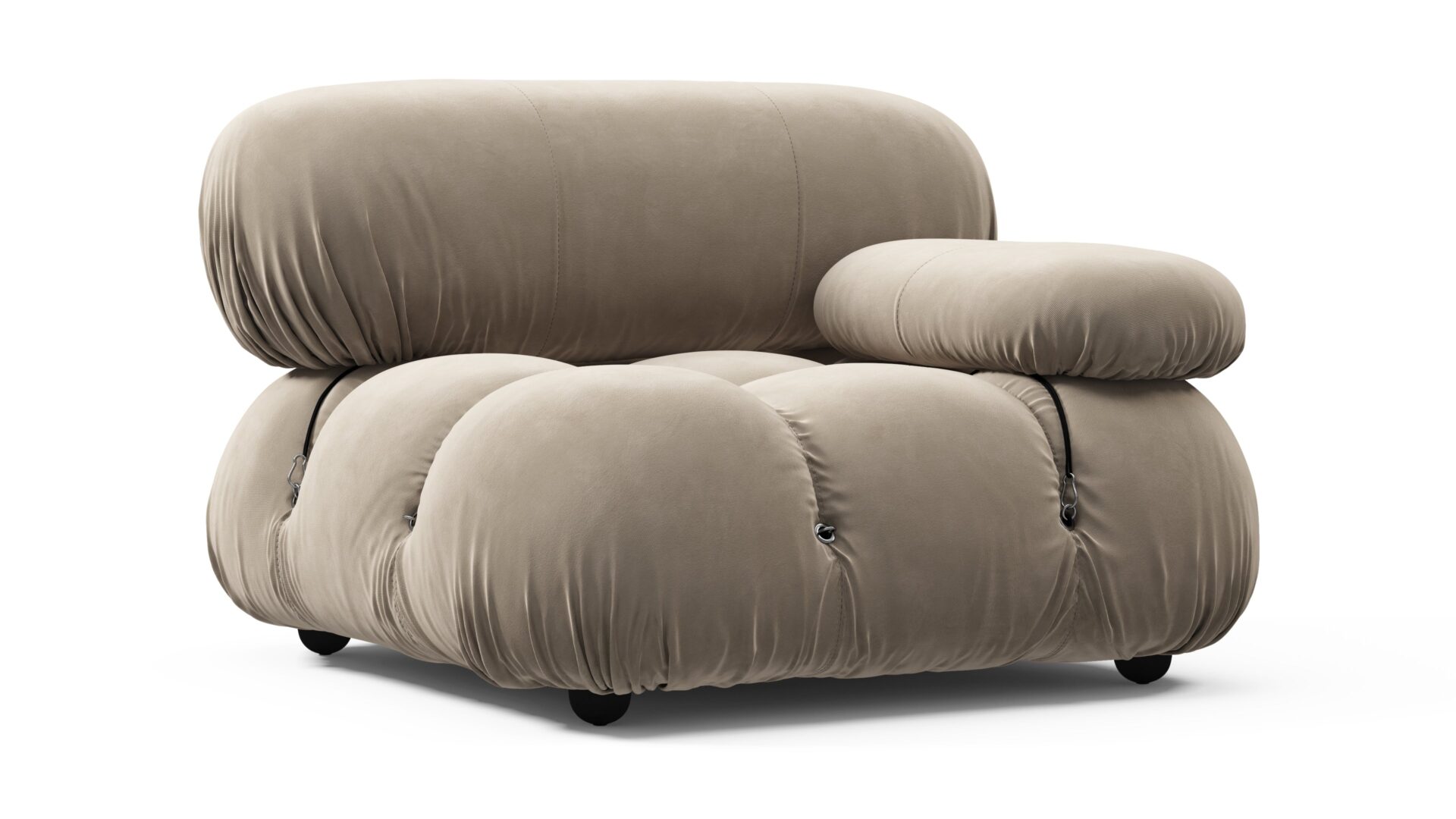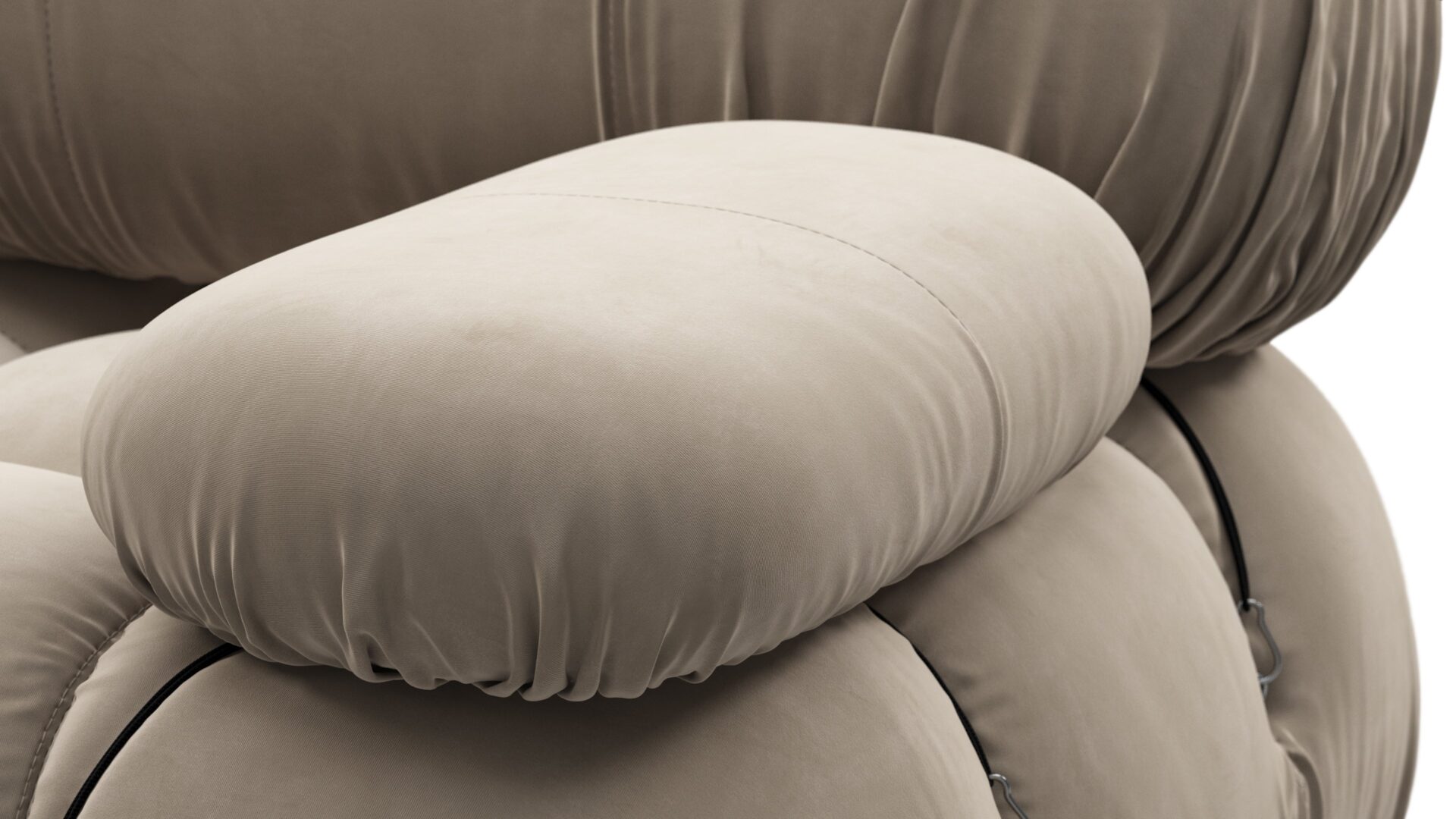 Step back into the iconic 1970s with the Bellini sectional sofa, exuding groovy vibes and free-spirited living. Its modular design offers freedom to personalize your space without a full makeover. Crafted with a sturdy wooden frame and plush cold-pressed foam wrapped in Greige Velvet, the low-profile Bellini invites luxurious relaxation. Customize your layout effortlessly, embody style and comfort unique to your preferences.