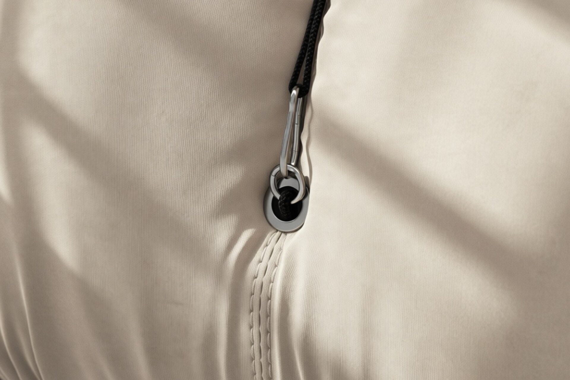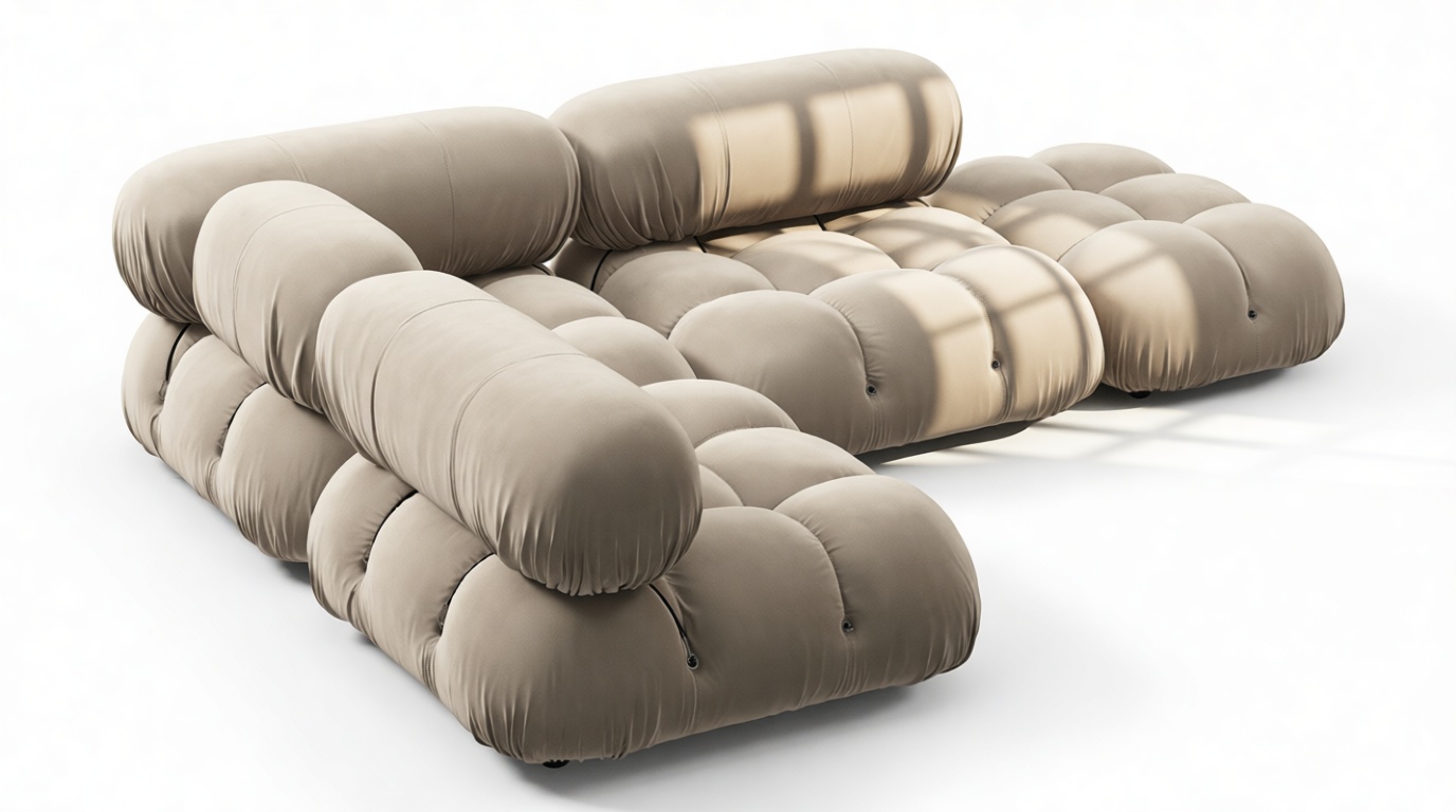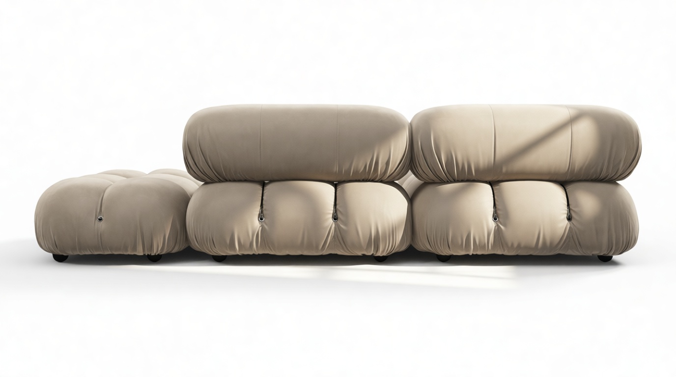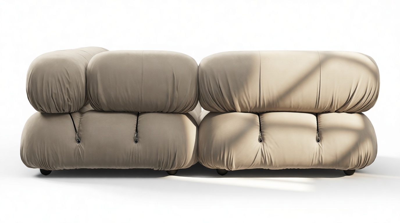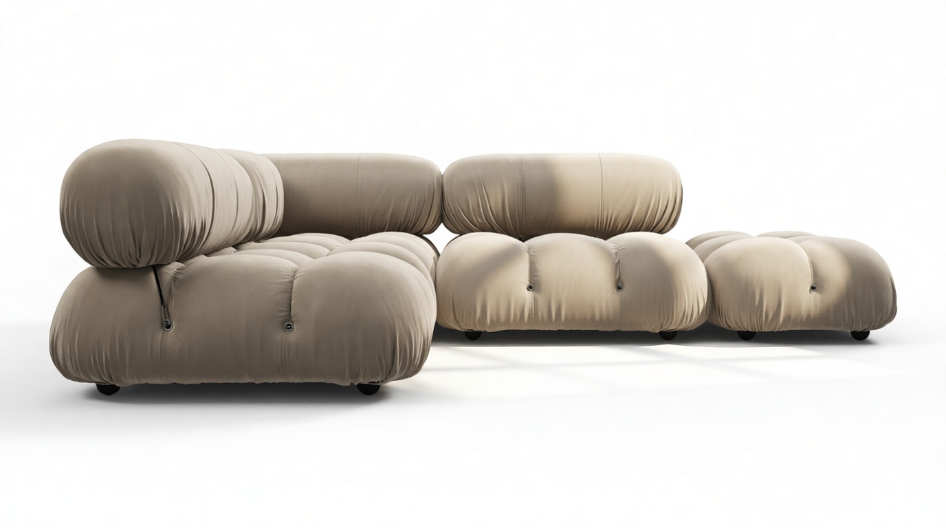 - Modular Instructions: Each section of the Mario Bellini Sofa is modular and is attached with string ties and carabiners. To assemble or rearrange your sofa, simply unclip the carabiners from one ring and attach to a corresponding ring on the module you wish to connect to.