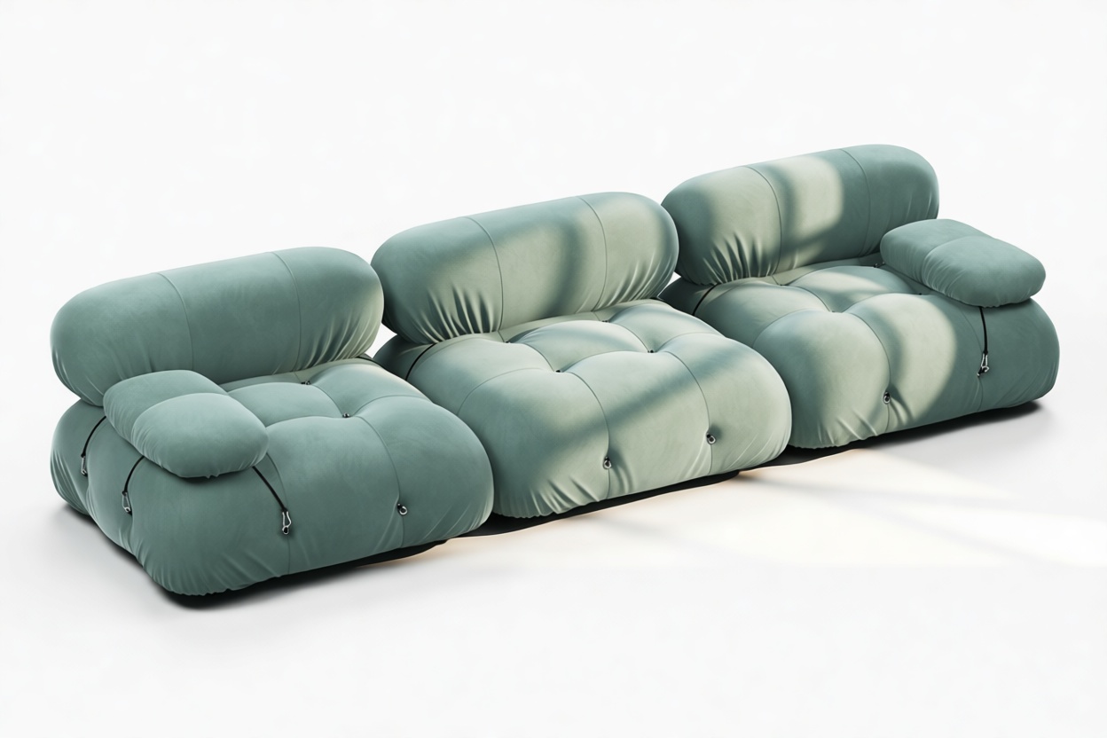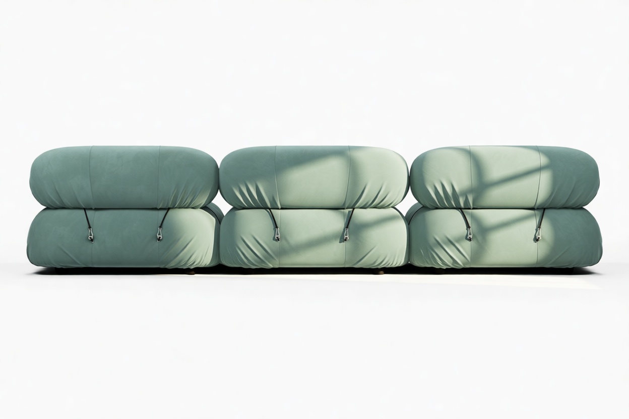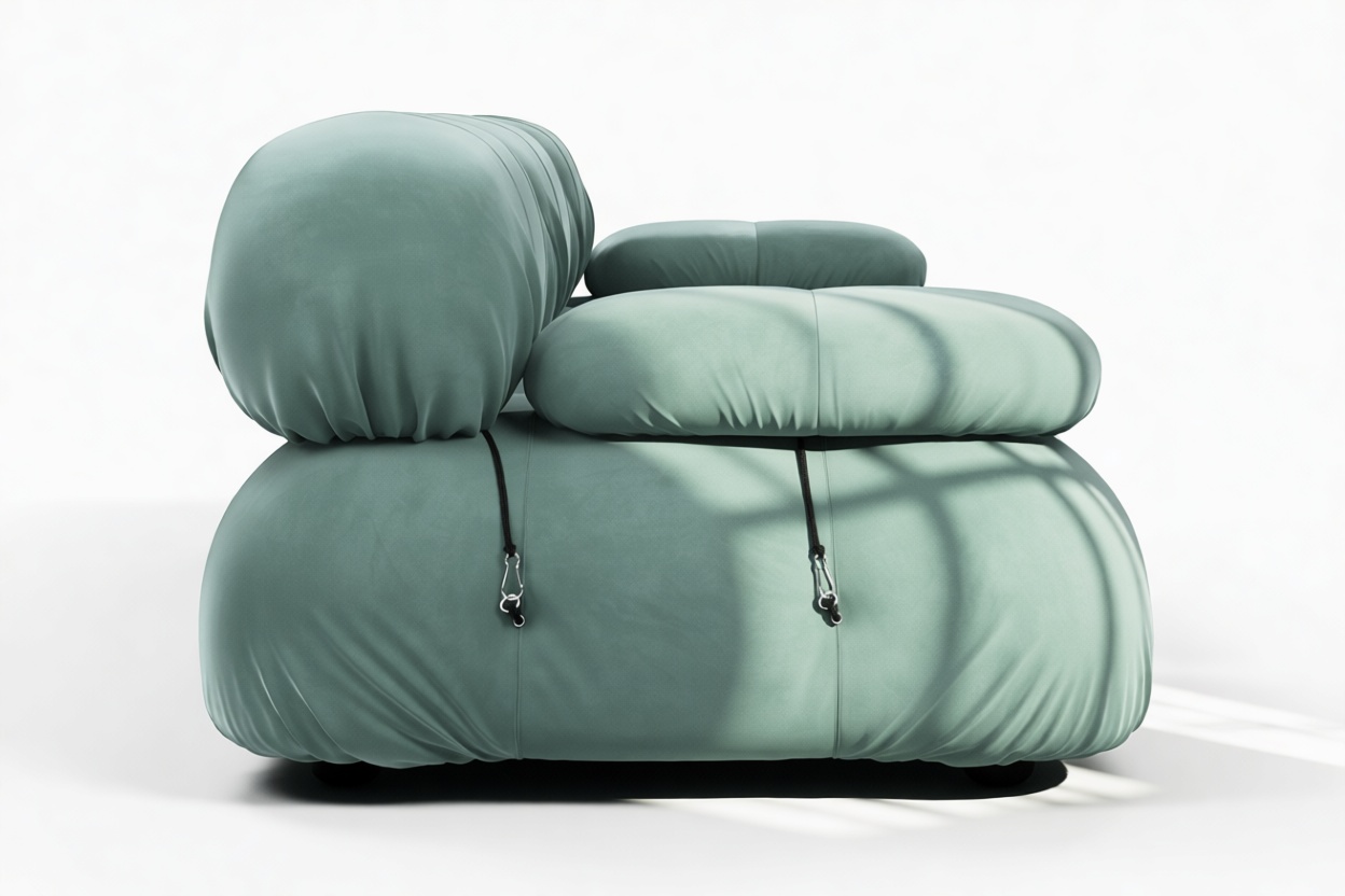 - Modular Instructions: Each section of the Mario Bellini Sofa is modular and is attached with string ties and carabiners. To assemble or rearrange your sofa, simply unclip the carabiners from one ring and attach to a corresponding ring on the module you wish to connect to.