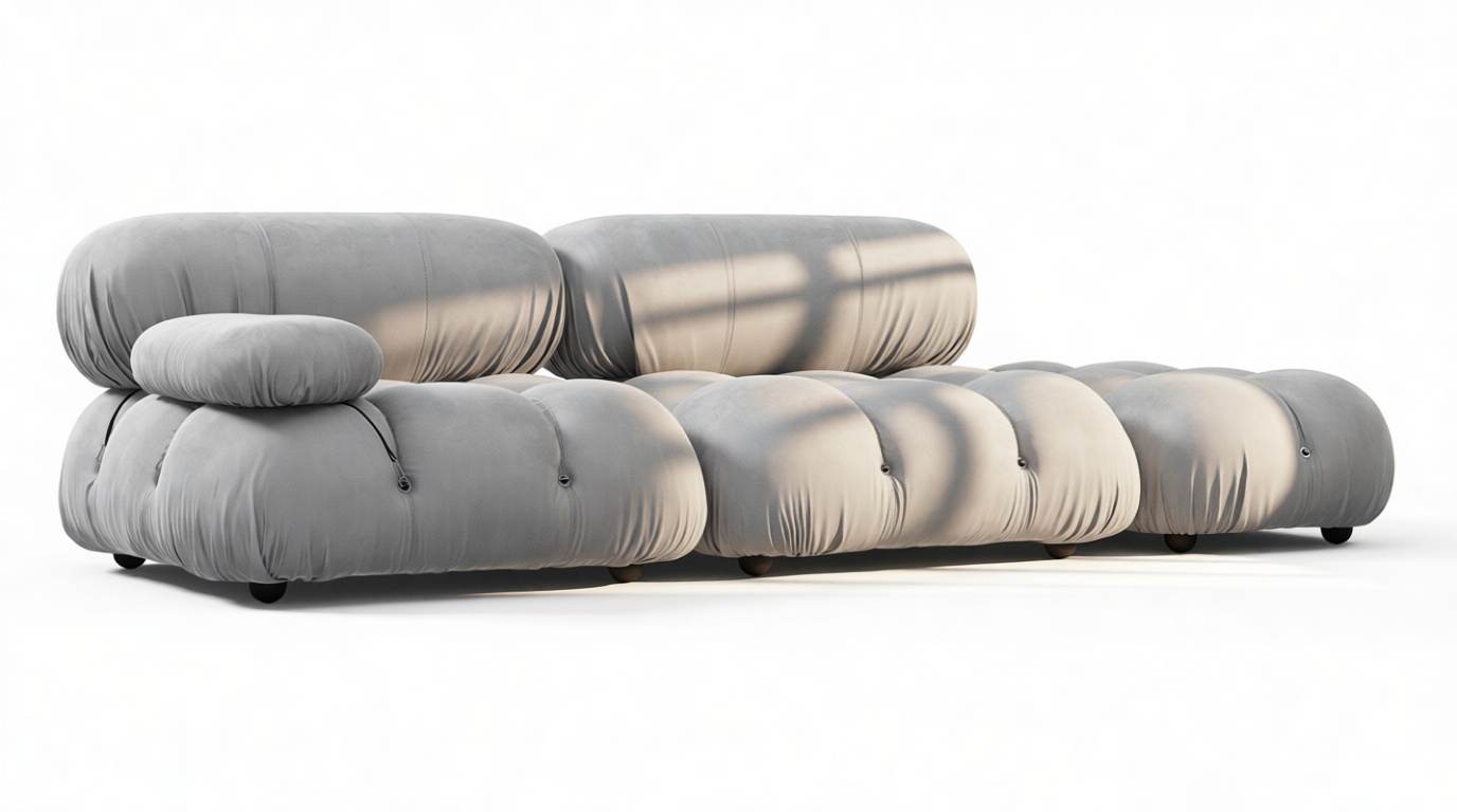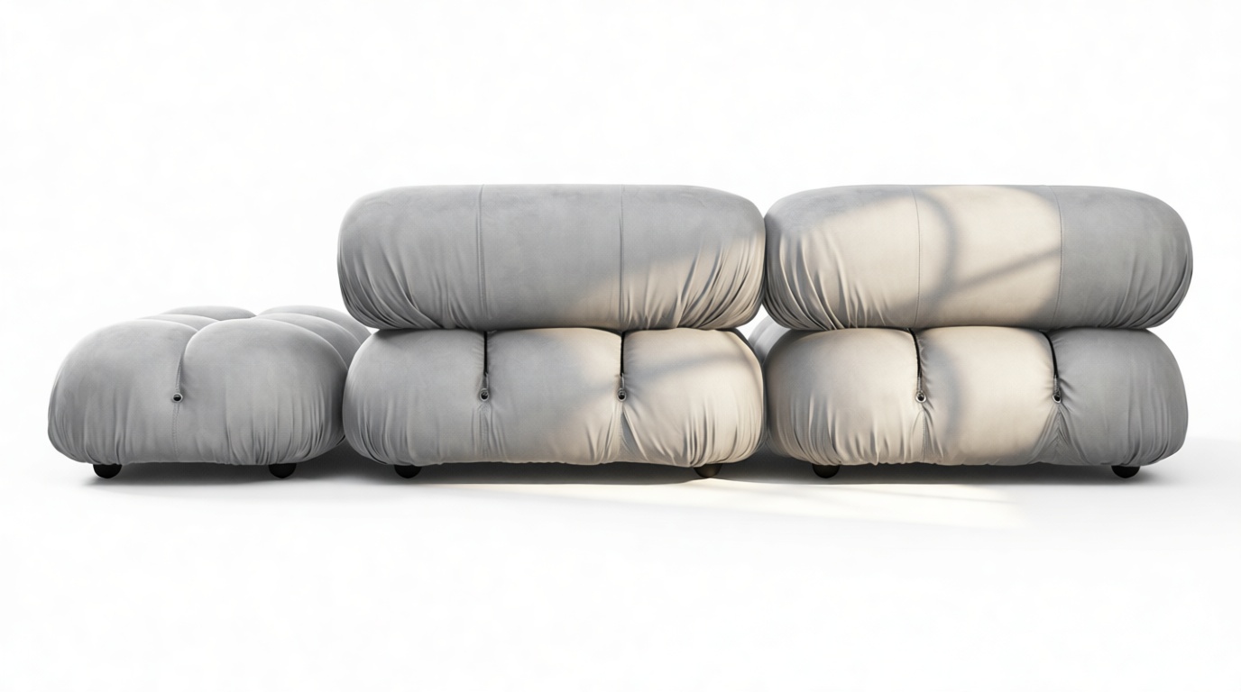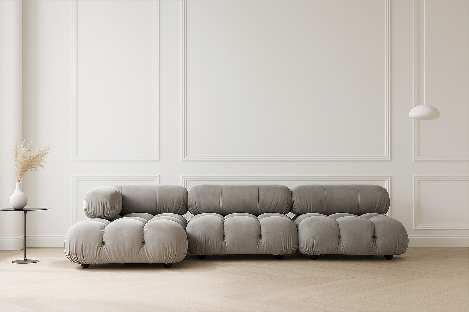 Step back into the 1970s with the Bellini sectional sofa, a tribute to groovy vibes and carefree living. Defying convention, this modular design allows easy customization in light gray velvet to suit your layout and mood. Crafted with a sturdy frame and plush foam, its low-profile silhouette exudes relaxed luxury. Unwind in style with the inviting cushions, embracing comfort and style effortlessly. Elevate your space with the versatile Bellini, creating a personalized sofa that perfectly fits your area. The meticulously made cushions provide lavish and cozy seating, delivering unparalleled style and comfort. Experience the generous proportions and inviting curves of the Bellini, encouraging relaxation. Its limitless configurations cater to different setups, blending relaxation and social interaction seamlessly. Known for its versatility, the iconic Bellini effortlessly adapts to any room or decor, offering liberation in a light gray velvet material for a cozy, intimate feel.
