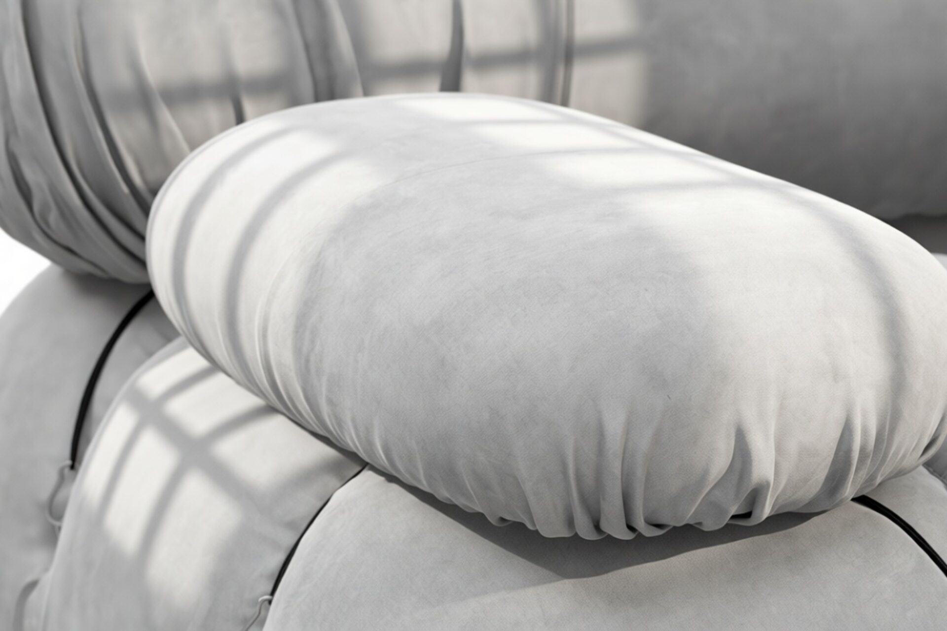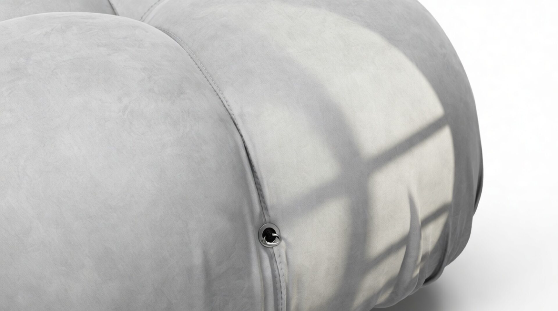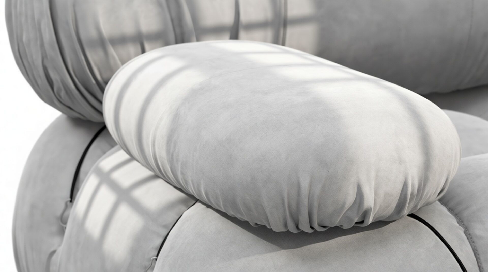 - Modular Instructions: Each section of the Mario Bellini Sofa is modular and is attached with string ties and carabiners. To assemble or rearrange your sofa, simply unclip the carabiners from one ring and attach to a corresponding ring on the module you wish to connect to.