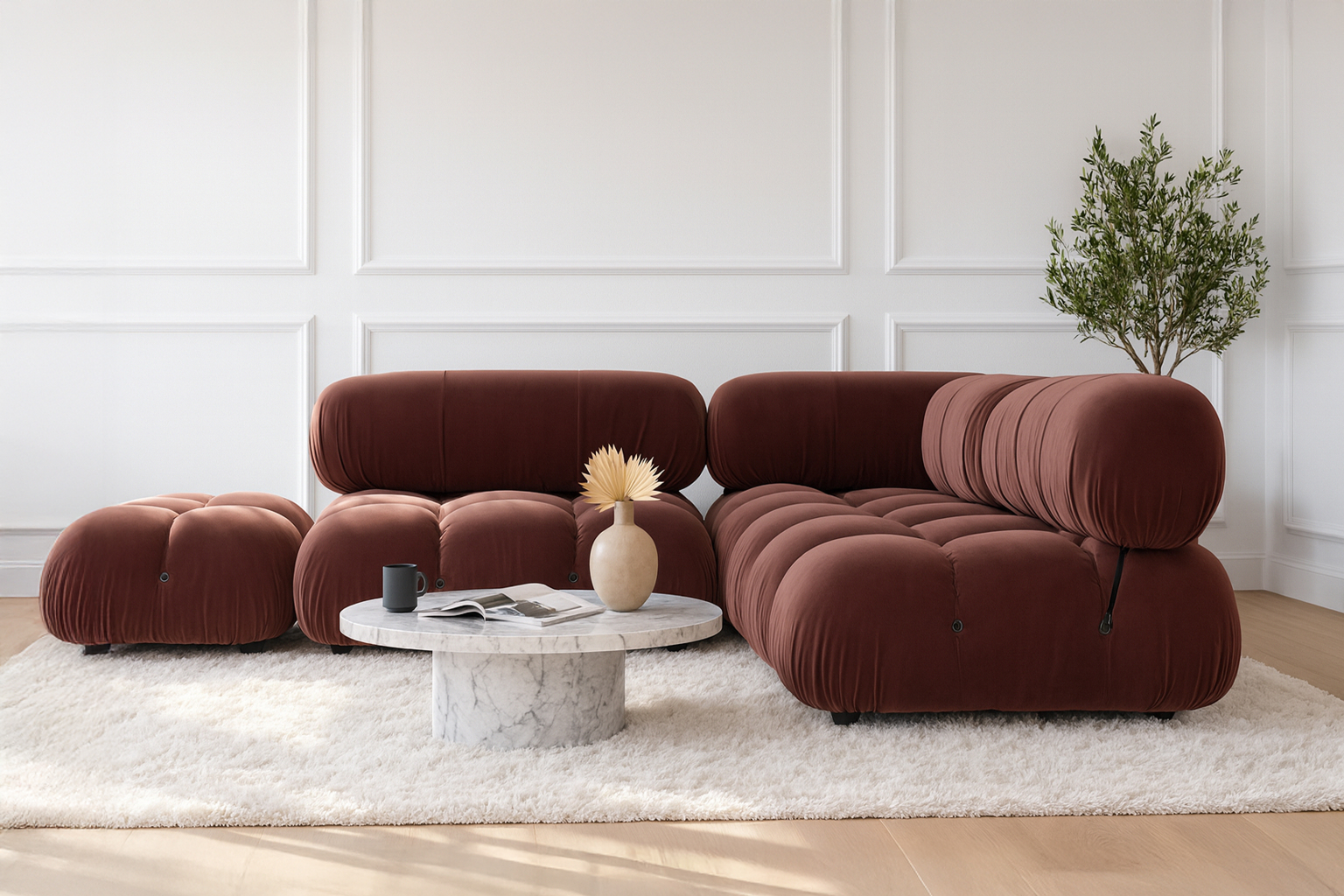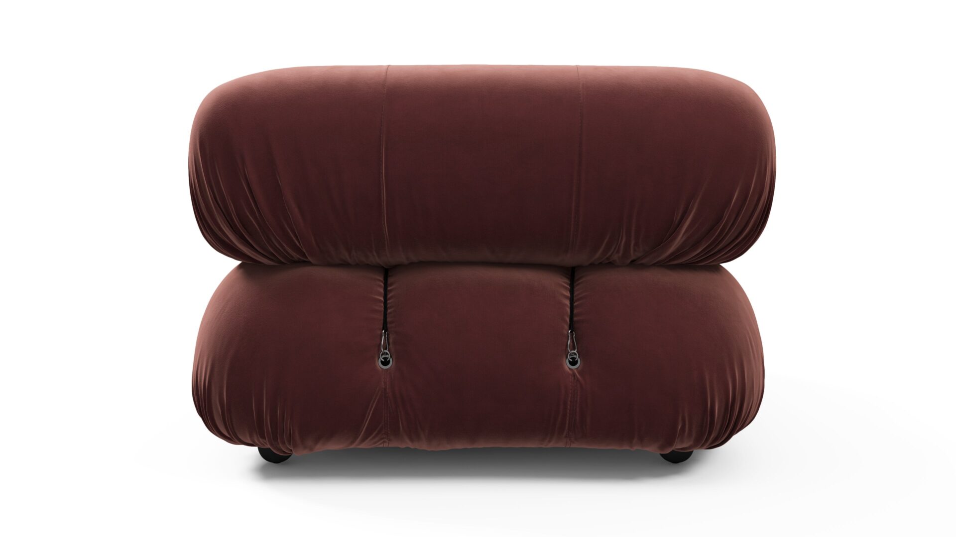 Step back in time to the groovy 1970s with the luxurious Bellini sectional sofa in Maroon Velvet. Embracing liberation and adaptability, this modular sofa offers a personalized touch to your living space. Crafted with a sturdy wooden frame and plush cold-pressed foam enveloped in soft velvet, the low-profile silhouette and inviting cushions invite you to relax in style and comfort. A favorite among furniture enthusiasts, the Bellini's tie rods and rings allow effortless rearrangement to match your evolving preferences, delivering endless configurations for a lavish and cozy seating experience.