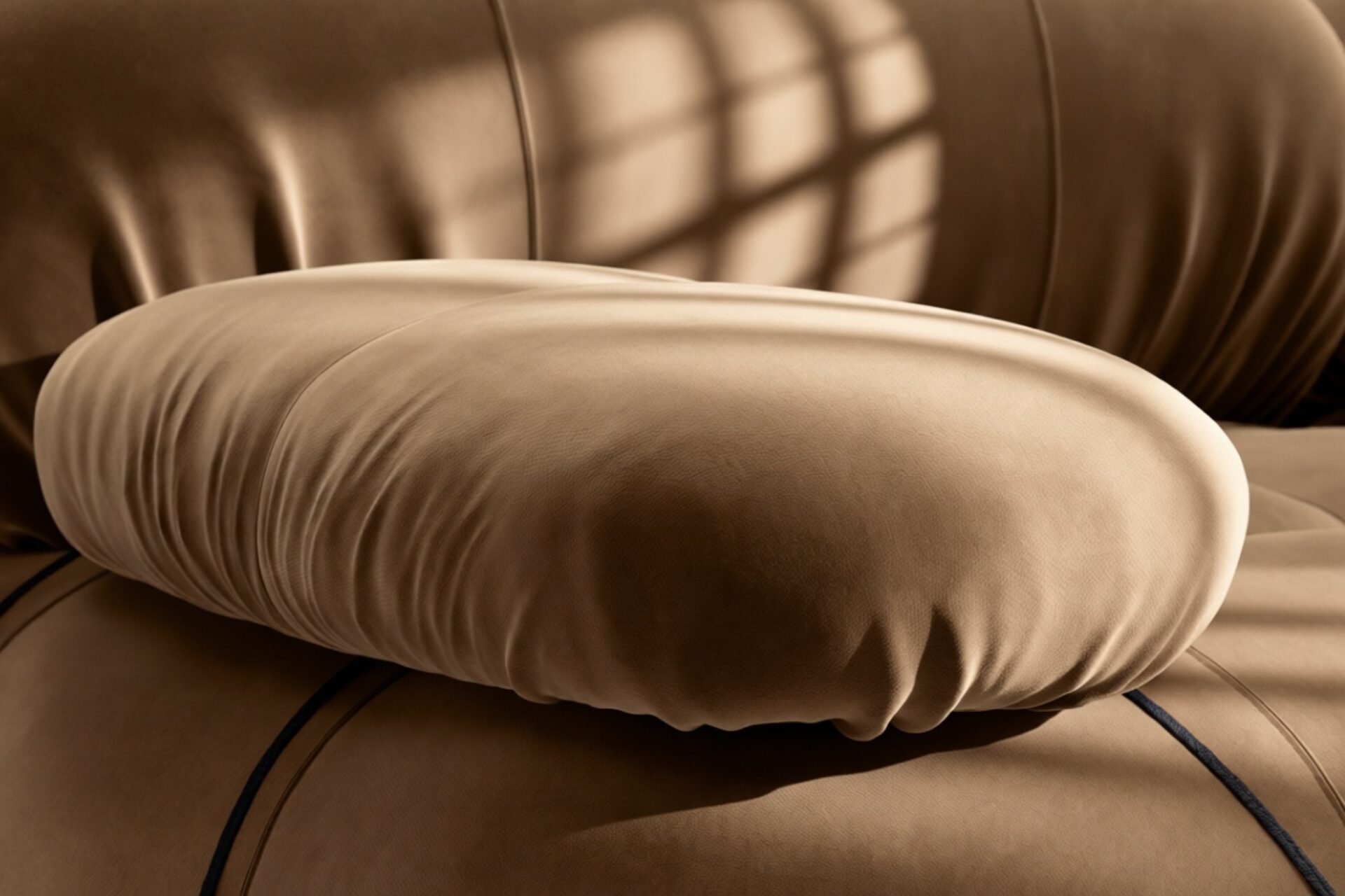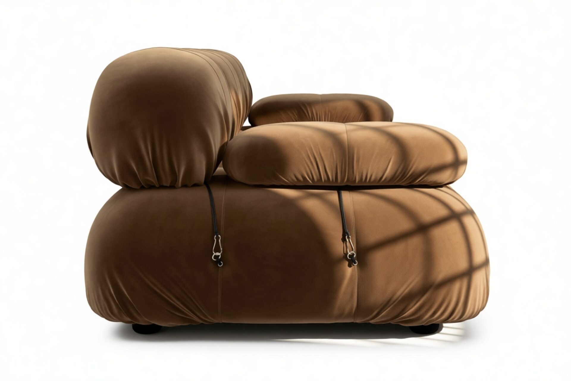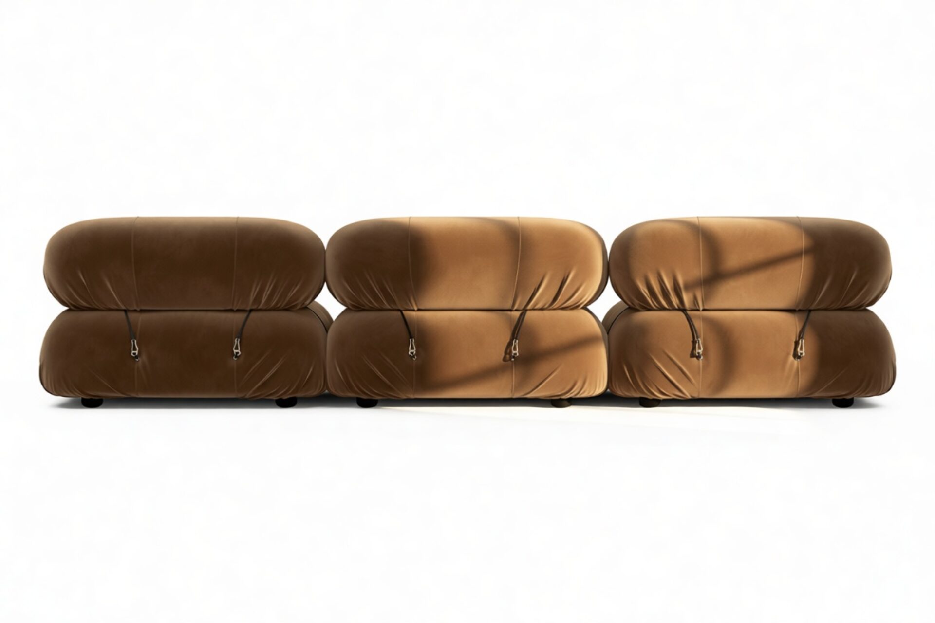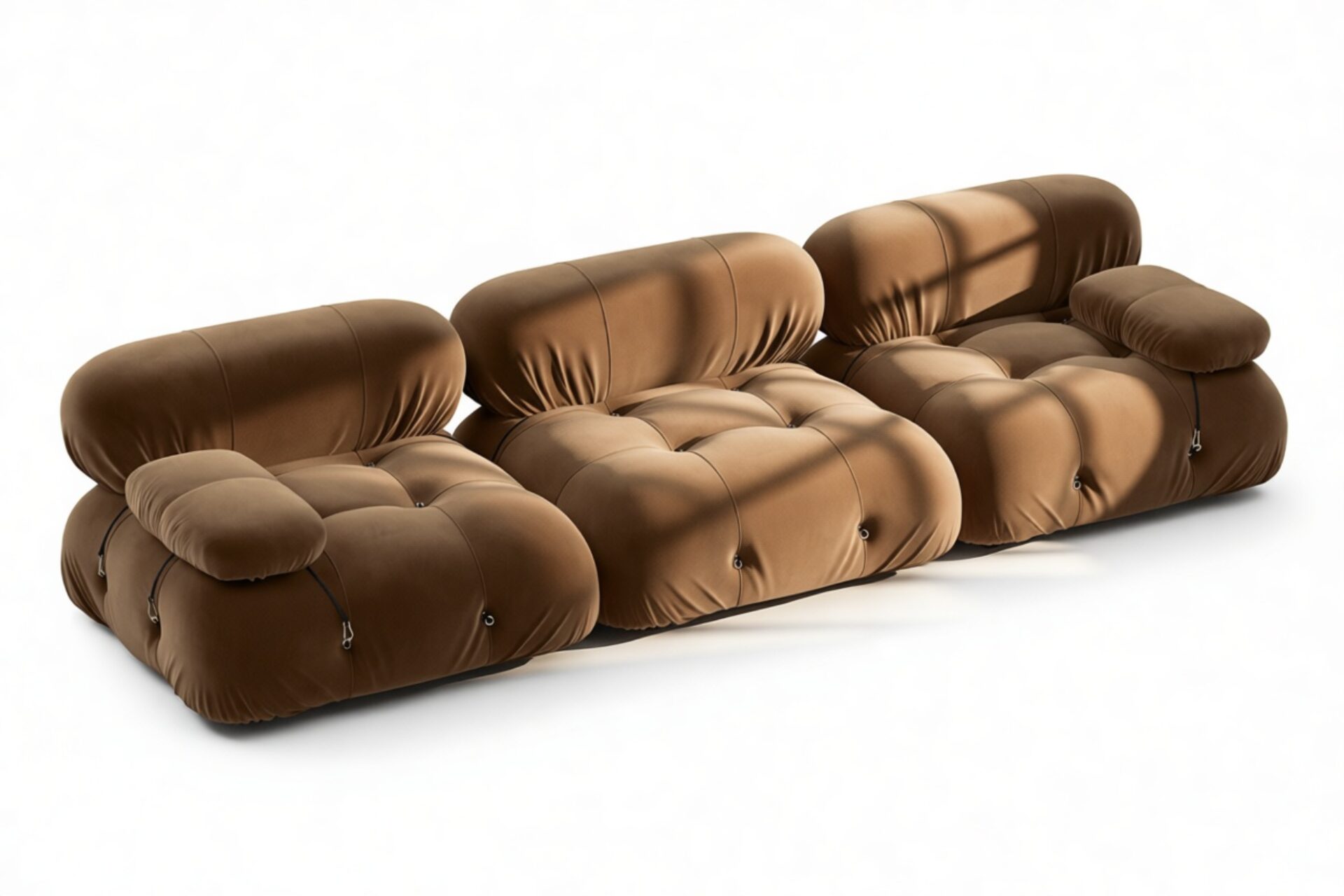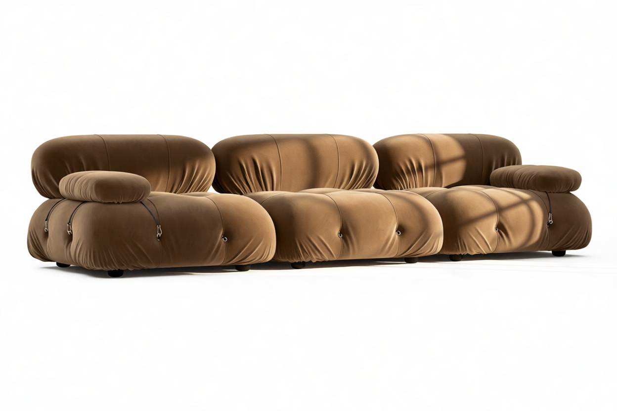 Step back into the 1970s with the Bellini sectional sofa, echoing groovy vibes and carefree living. Its modular design allows effortless customization to suit your room layout, style, and mood. Crafted with a sturdy wooden frame and plush cold-pressed foam wrapped in soft mocha velvet, the Bellini exudes relaxed luxury. With tie rods and rings for easy rearrangement, this sofa embodies liberation and adaptability.