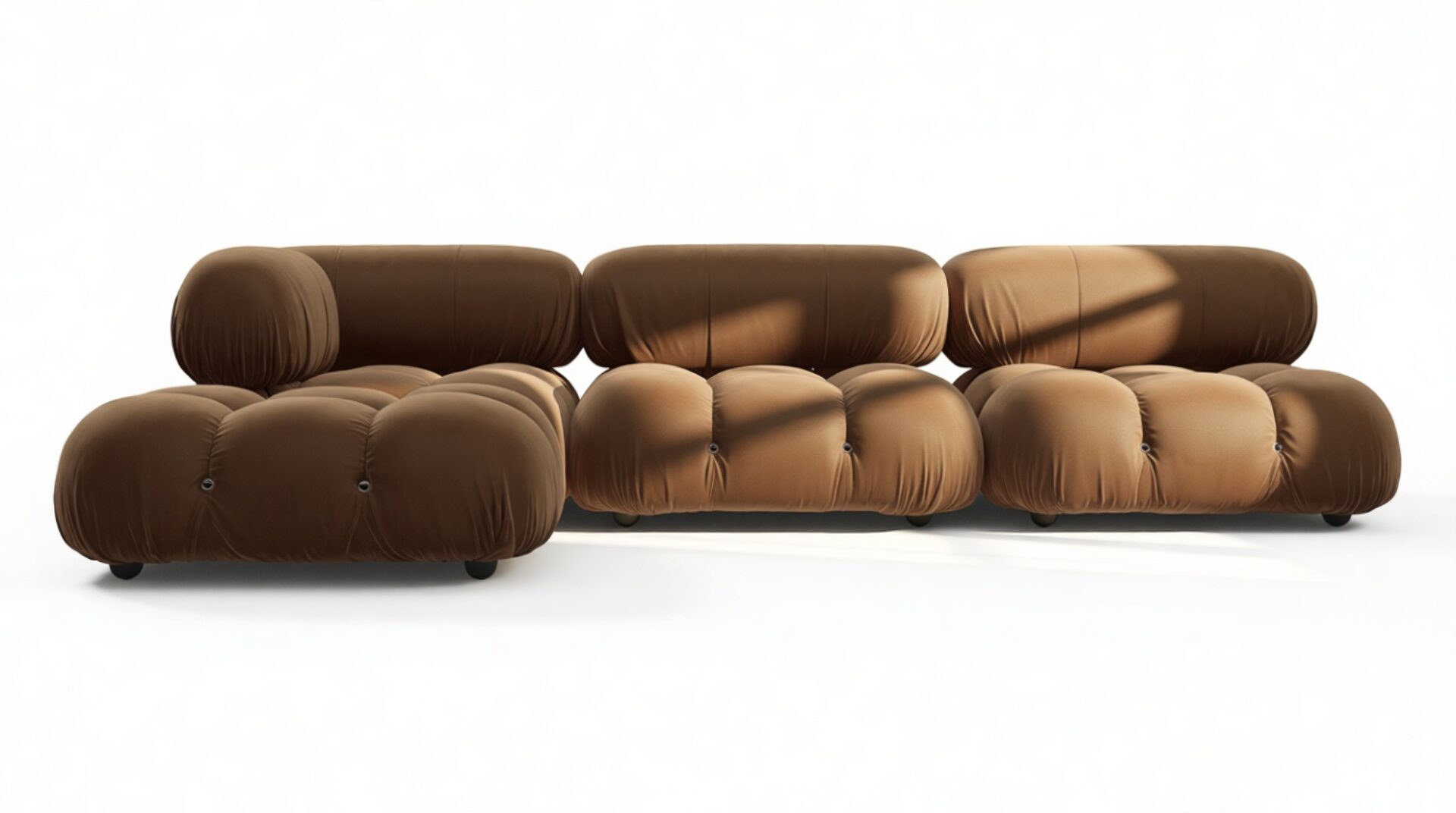 Transport yourself back to the 1970s with the Bellini sectional sofa, a stylish tribute to the era of groovy vibes and carefree living. Defying bulky conventions, the Bellini offers liberation with its modular design for effortless customization to your space, all wrapped in plush Mocha Velvet fabric. Embrace its adaptability and timeless appeal, creating a personalized sofa that seamlessly fits your style and space while enjoying luxurious relaxation in a low-profile silhouette.