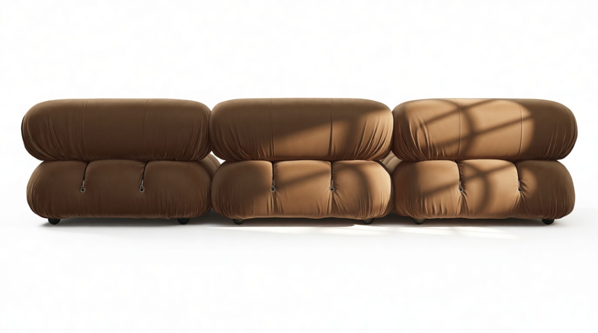 - Modular Instructions: Each section of the Mario Bellini Sofa is modular and is attached with string ties and carabiners. To assemble or rearrange your sofa, simply unclip the carabiners from one ring and attach to a corresponding ring on the module you wish to connect to.