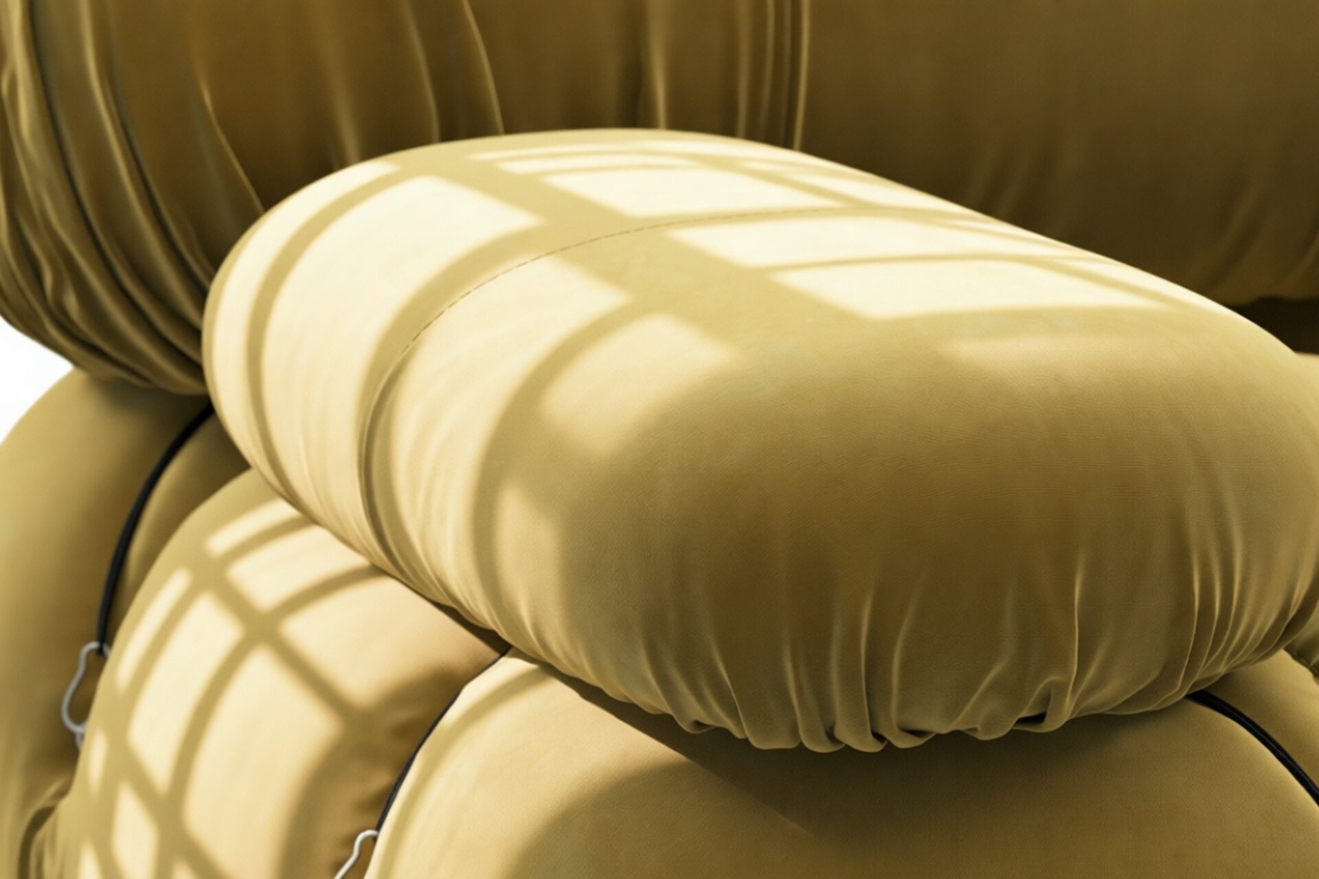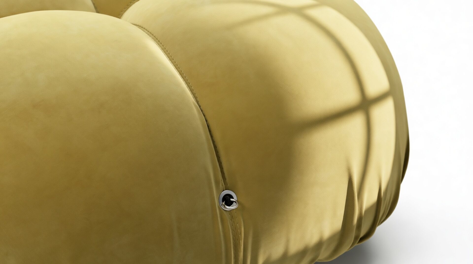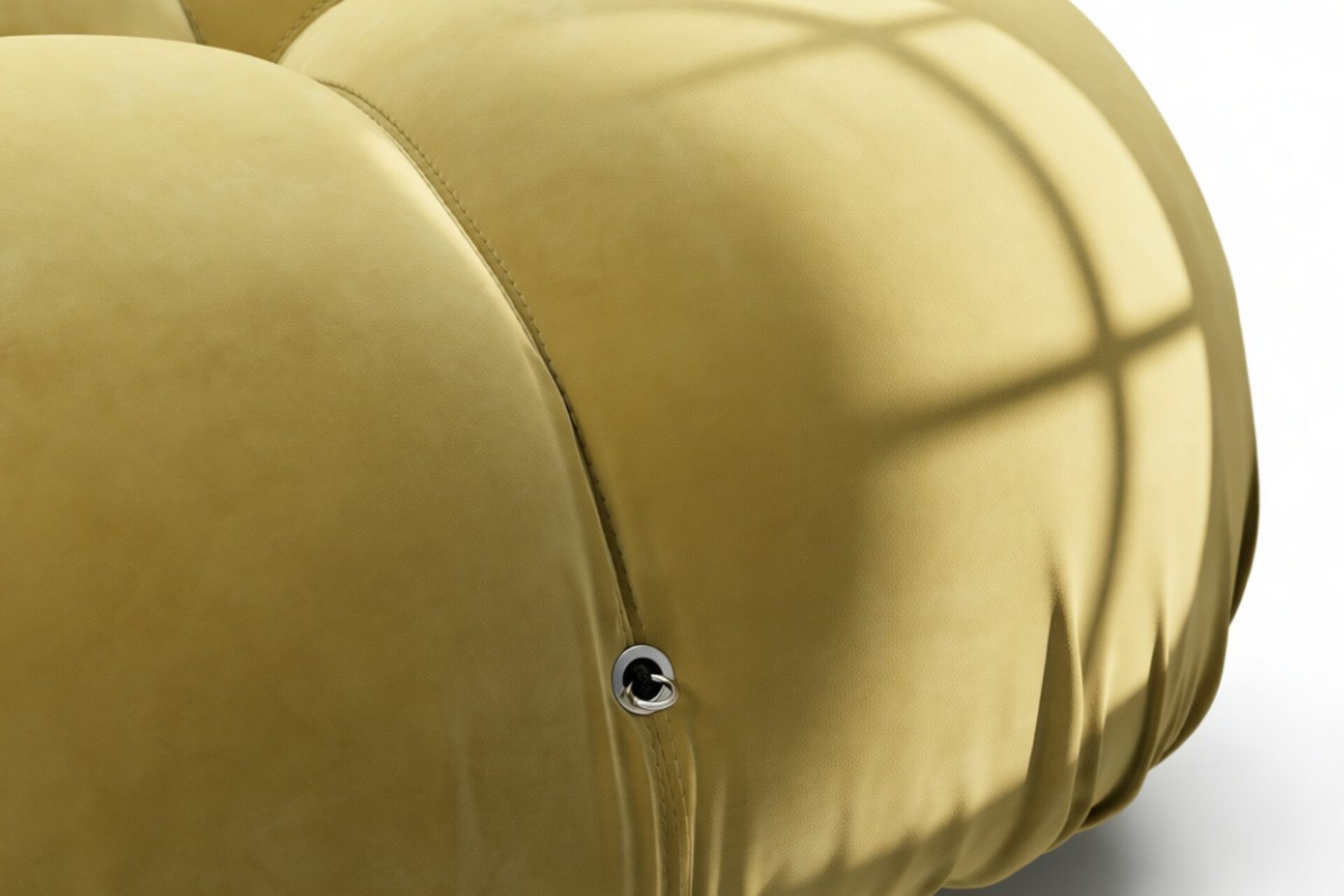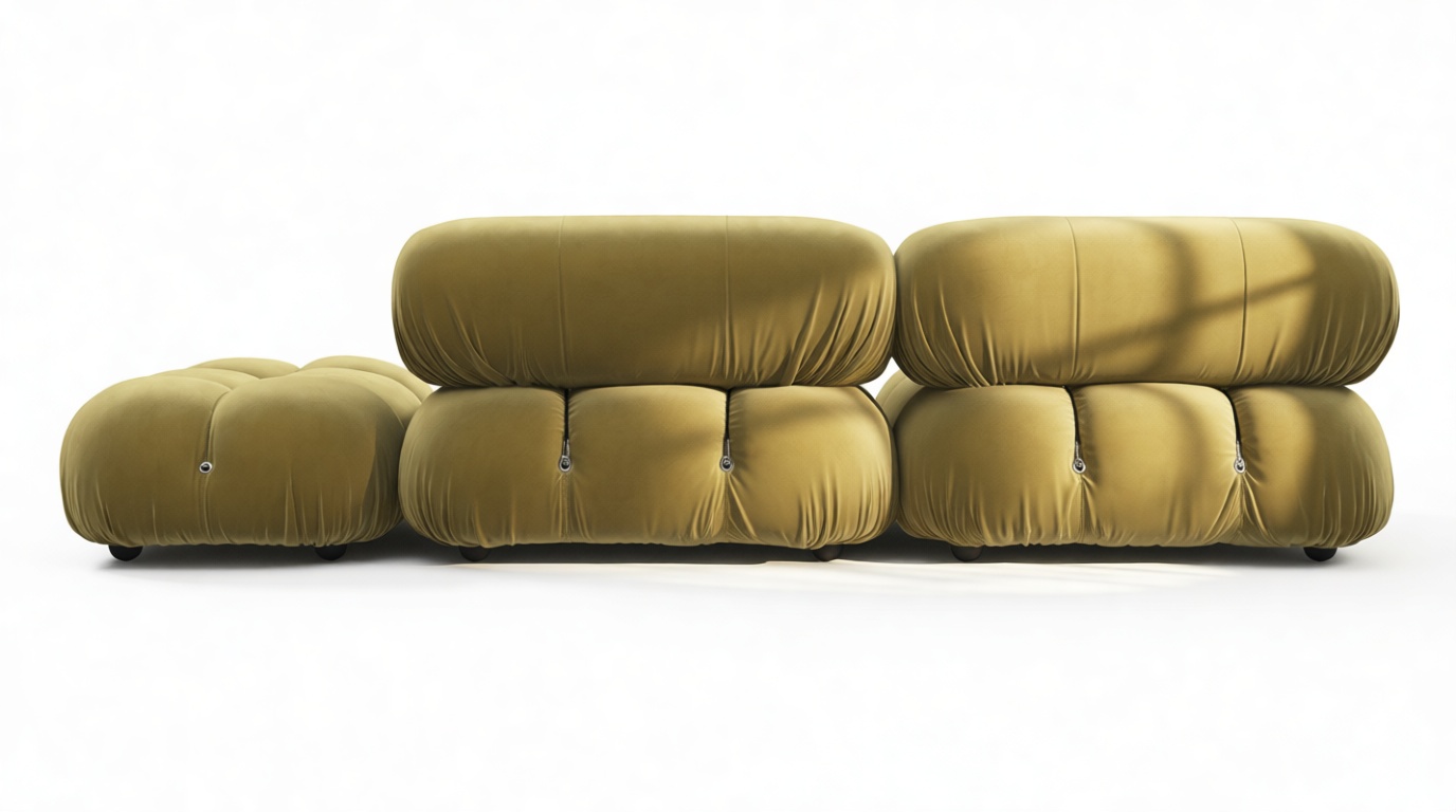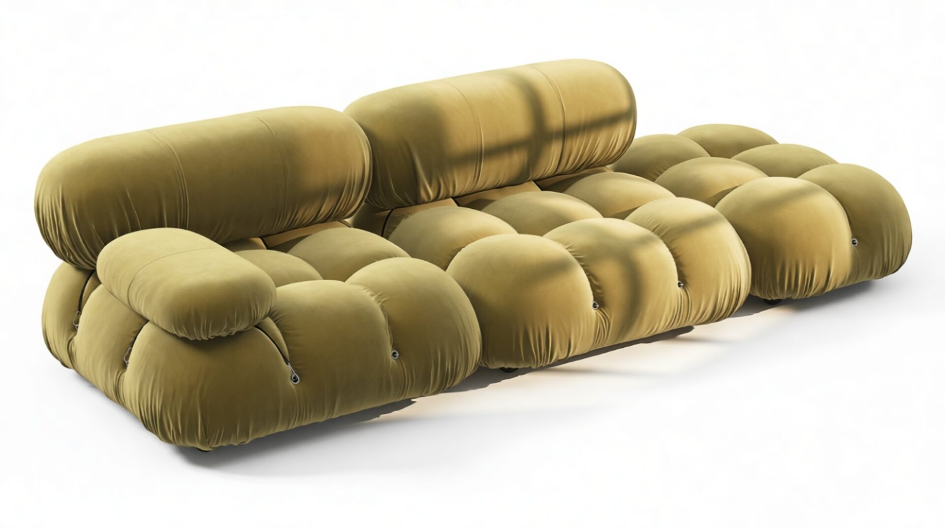 - Modular Instructions: Each section of the Mario Bellini Sofa is modular and is attached with string ties and carabiners. To assemble or rearrange your sofa, simply unclip the carabiners from one ring and attach to a corresponding ring on the module you wish to connect to.