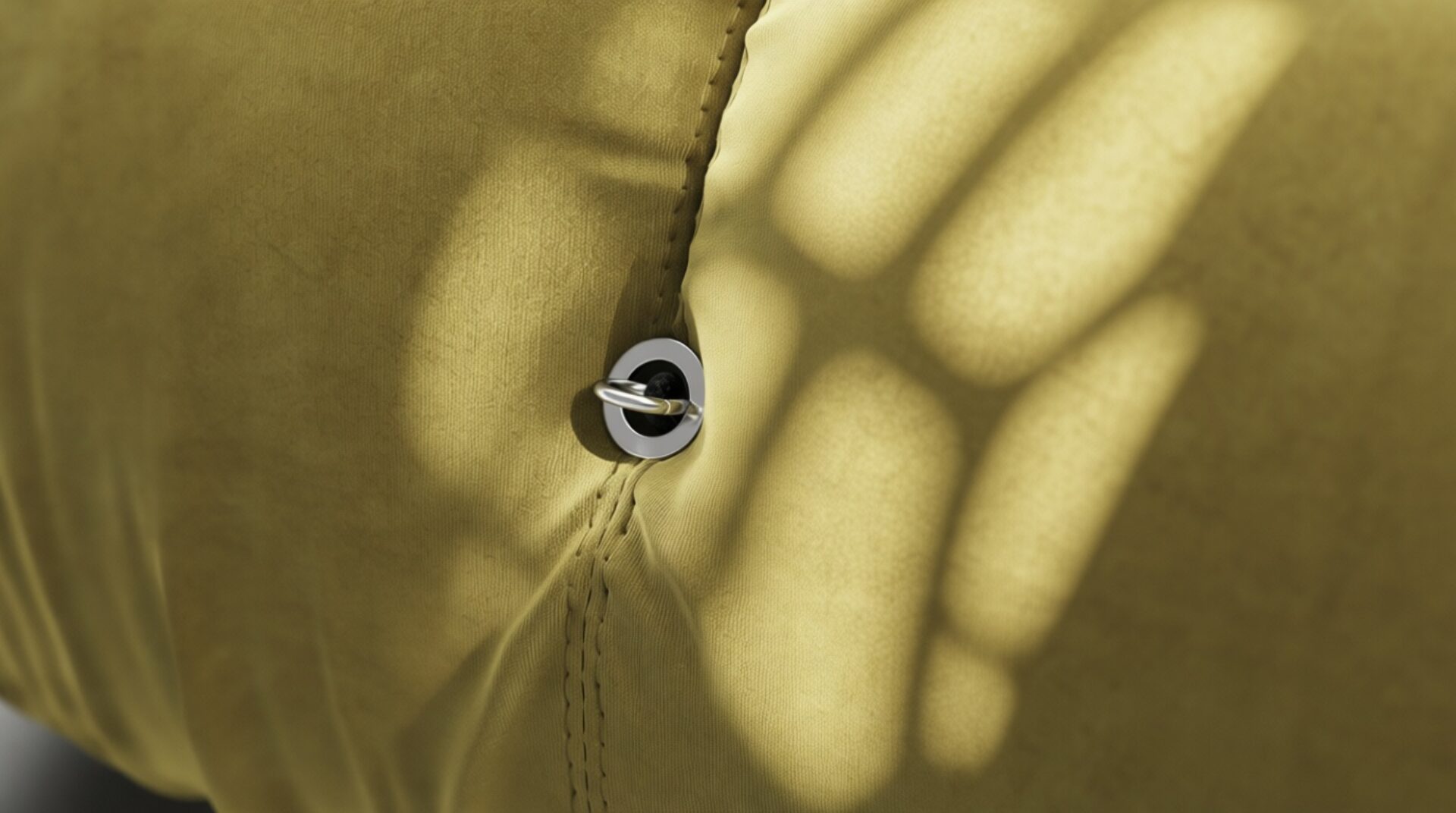 - Modular Instructions: Each section of the Mario Bellini Sofa is modular and is attached with string ties and carabiners. To assemble or rearrange your sofa, simply unclip the carabiners from one ring and attach to a corresponding ring on the module you wish to connect to.