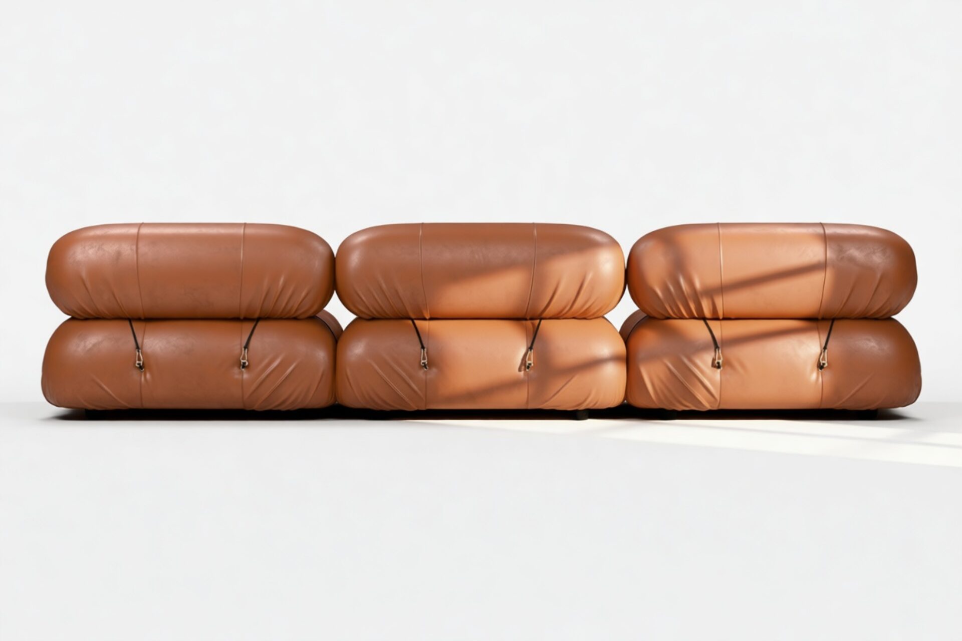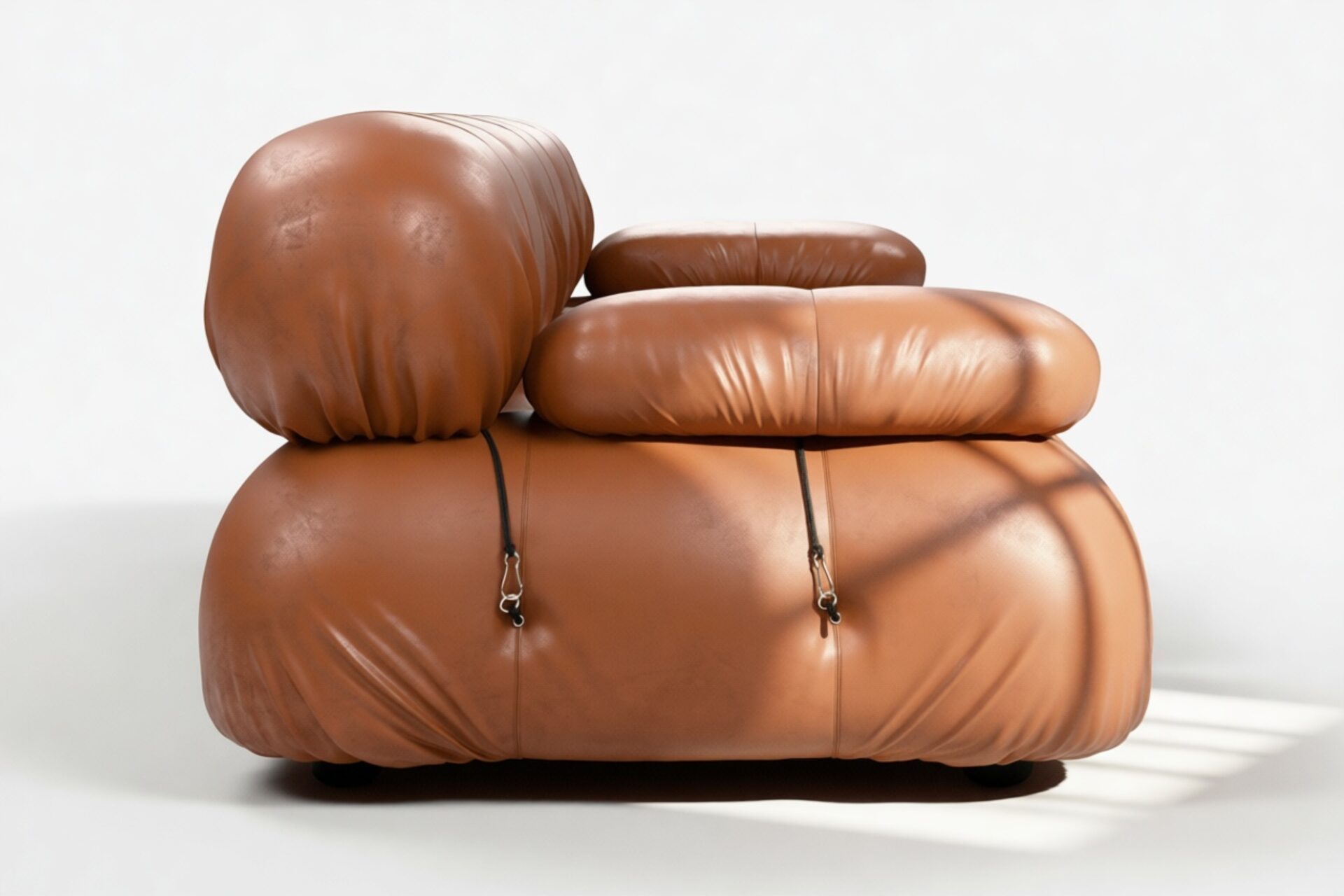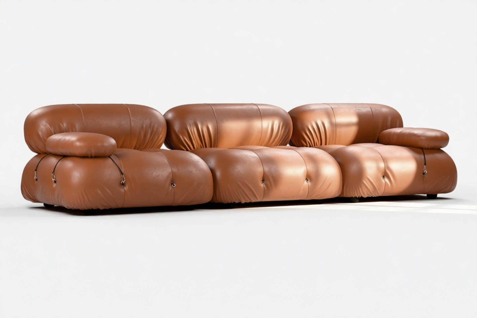 - Modular Instructions: Each section of the Mario Bellini Sofa is modular and is attached with string ties and carabiners. To assemble or rearrange your sofa, simply unclip the carabiners from one ring and attach to a corresponding ring on the module you wish to connect to.