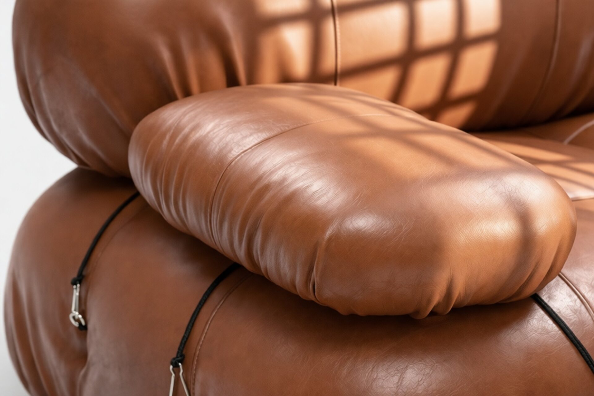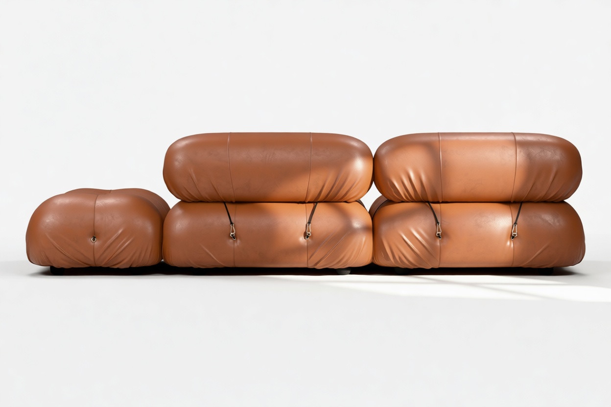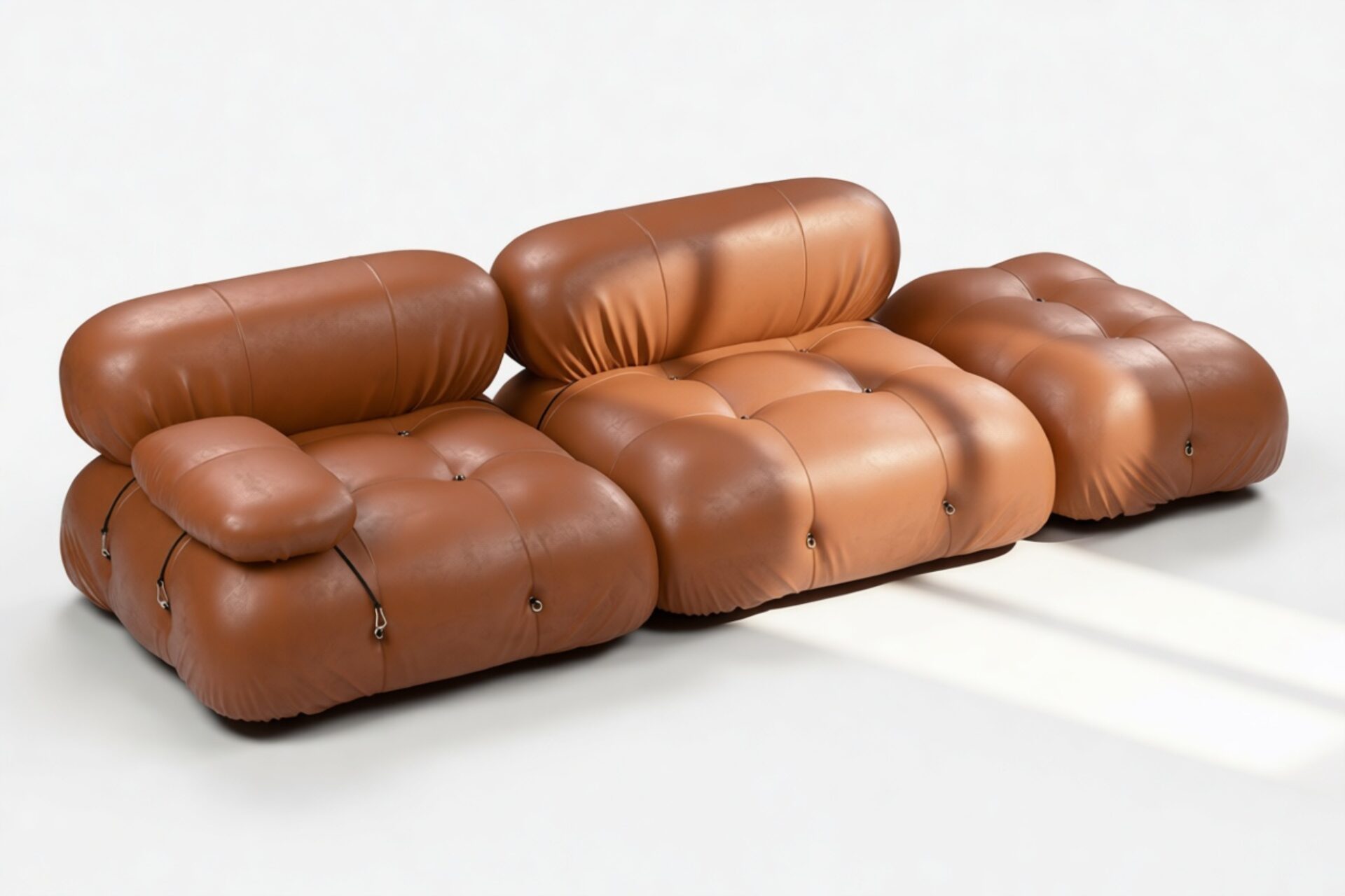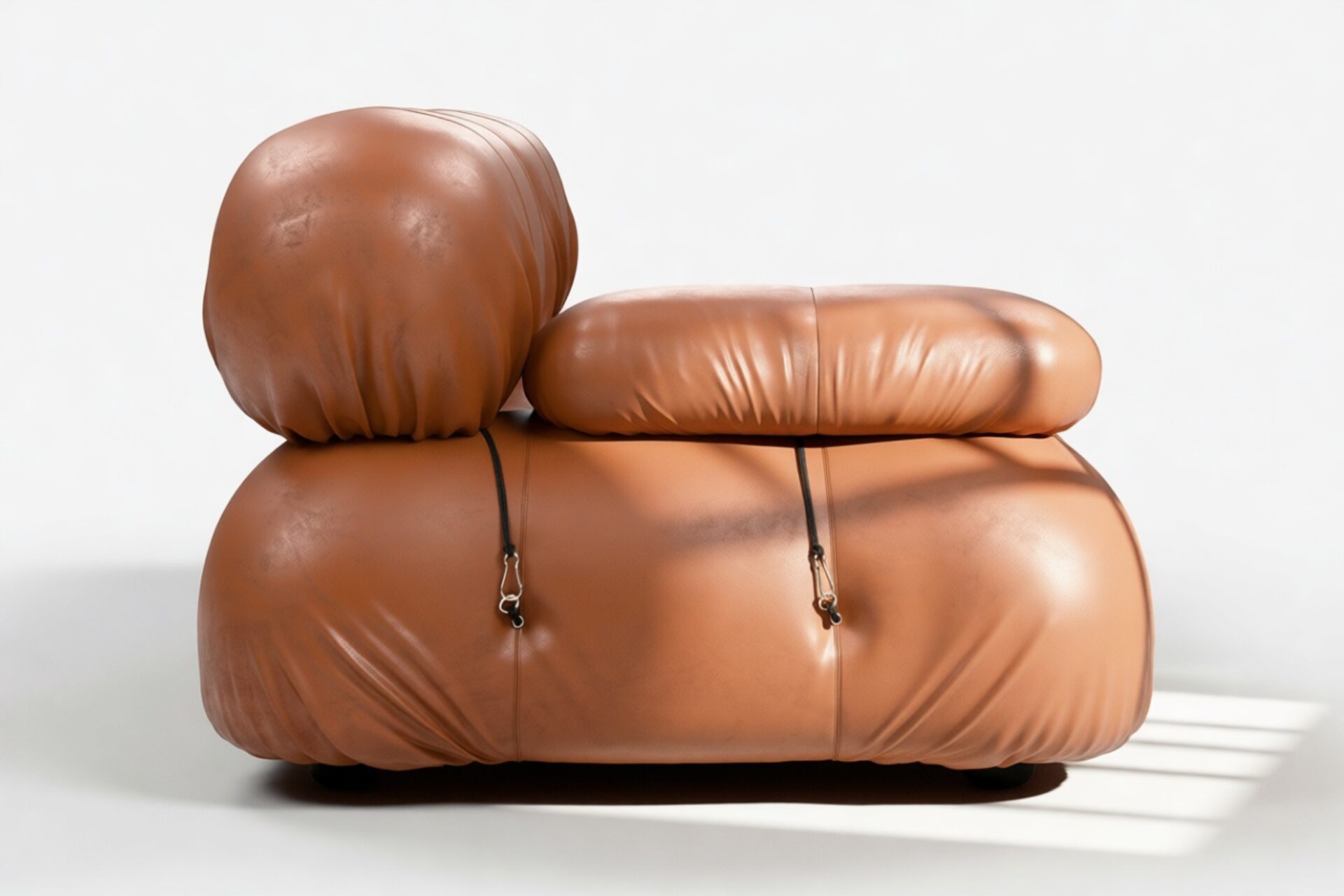 - Modular Instructions: Each section of the Mario Bellini Sofa is modular and is attached with string ties and carabiners. To assemble or rearrange your sofa, simply unclip the carabiners from one ring and attach to a corresponding ring on the module you wish to connect to.