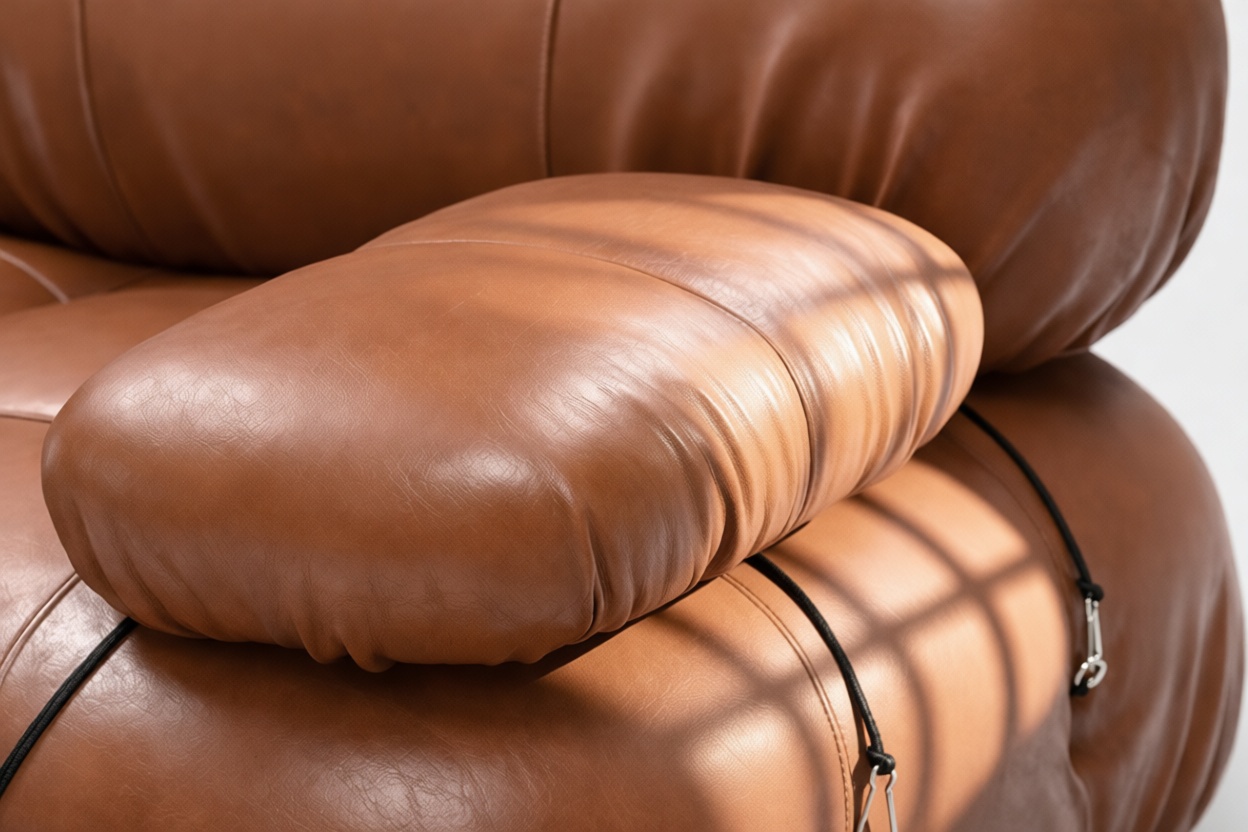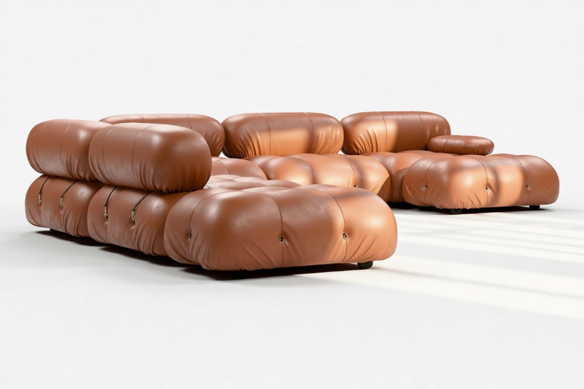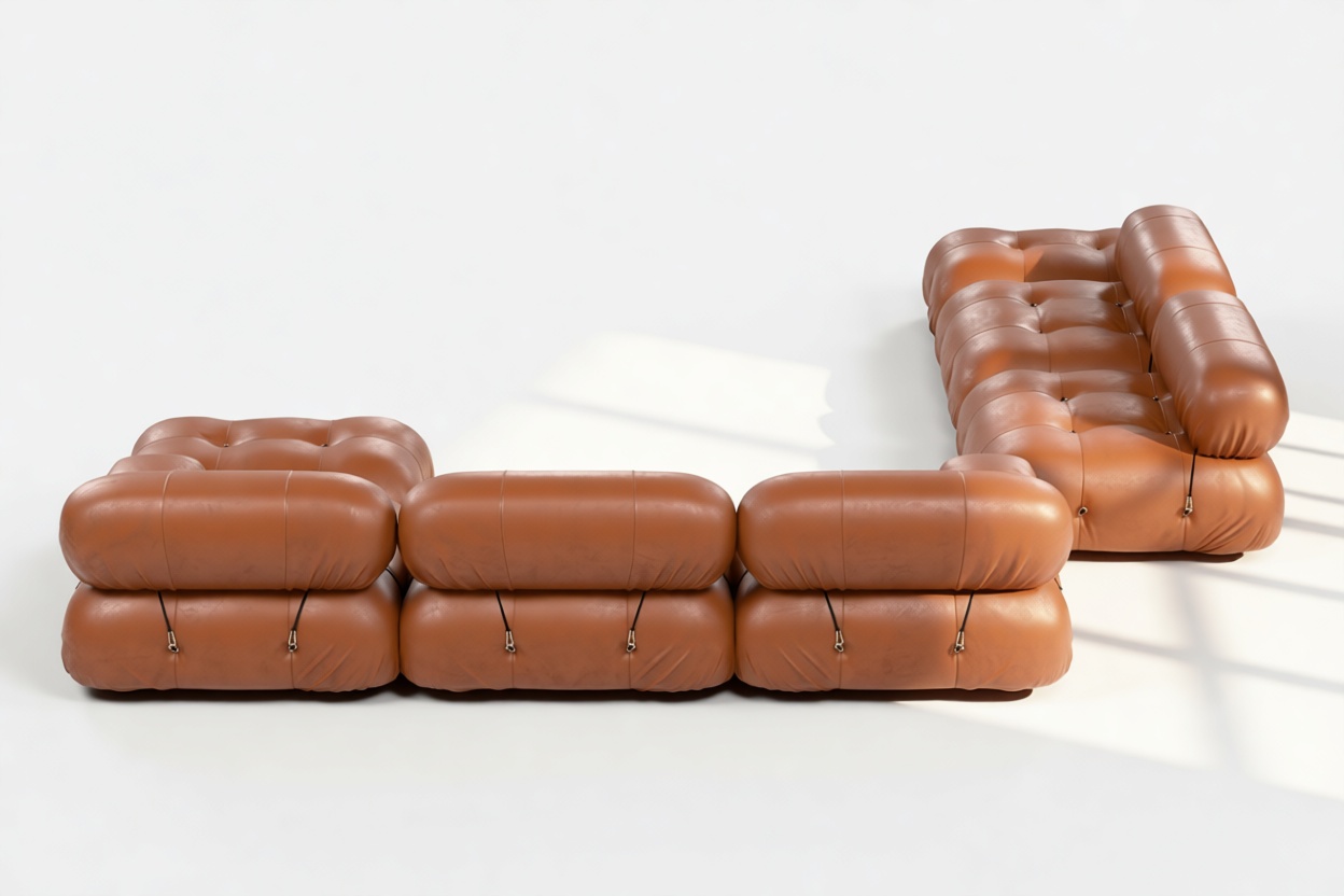 - Modular Instructions: Each section of the Mario Bellini Sofa is modular and is attached with string ties and carabiners. To assemble or rearrange your sofa, simply unclip the carabiners from one ring and attach to a corresponding ring on the module you wish to connect to.
