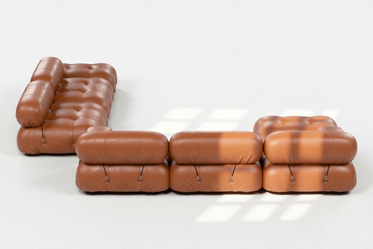 - Modular Instructions: Each section of the Mario Bellini Sofa is modular and is attached with string ties and carabiners. To assemble or rearrange your sofa, simply unclip the carabiners from one ring and attach to a corresponding ring on the module you wish to connect to.