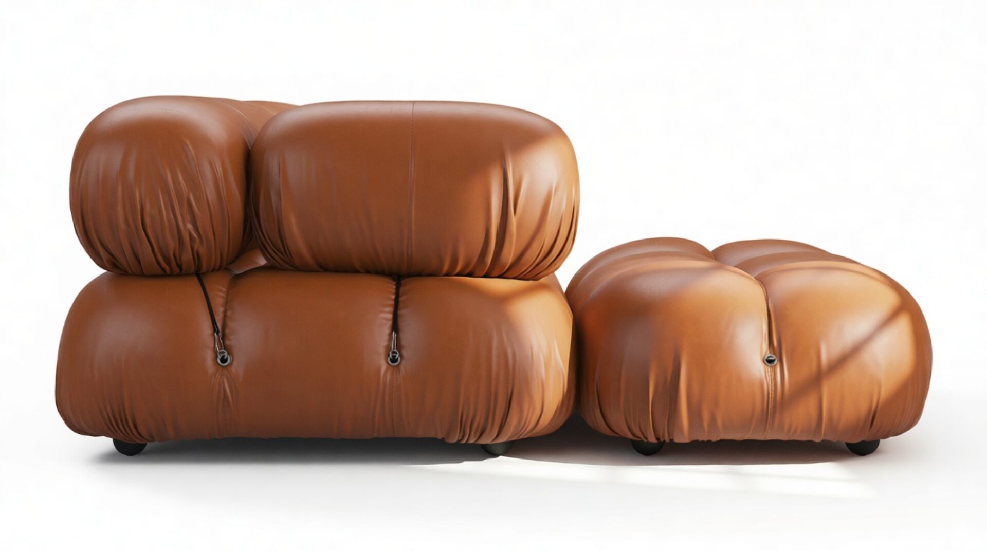 - Modular Instructions: Each section of the Mario Bellini Sofa is modular and is attached with string ties and carabiners. To assemble or rearrange your sofa, simply unclip the carabiners from one ring and attach to a corresponding ring on the module you wish to connect to.