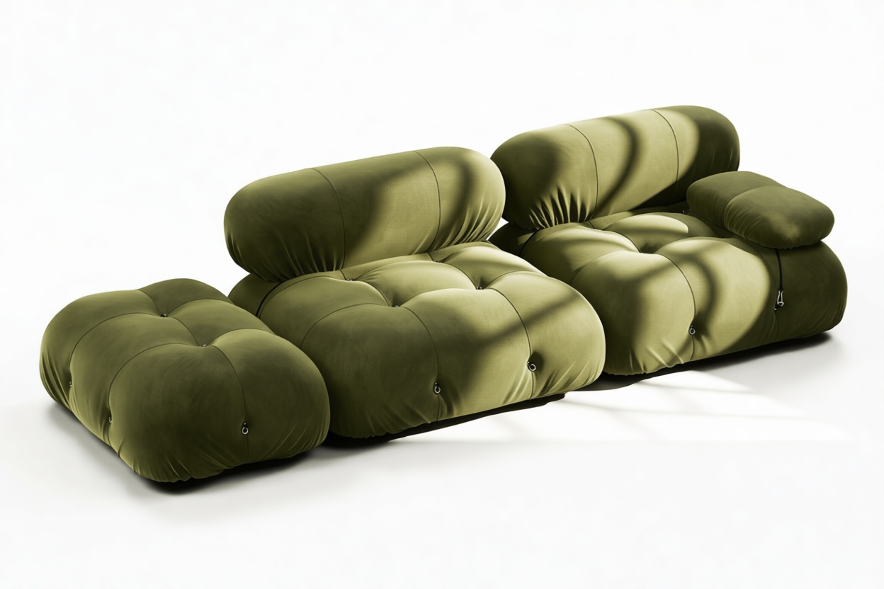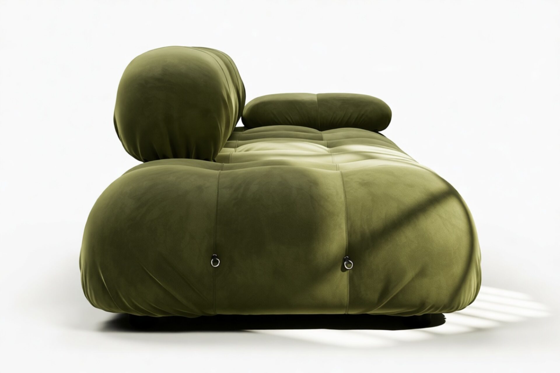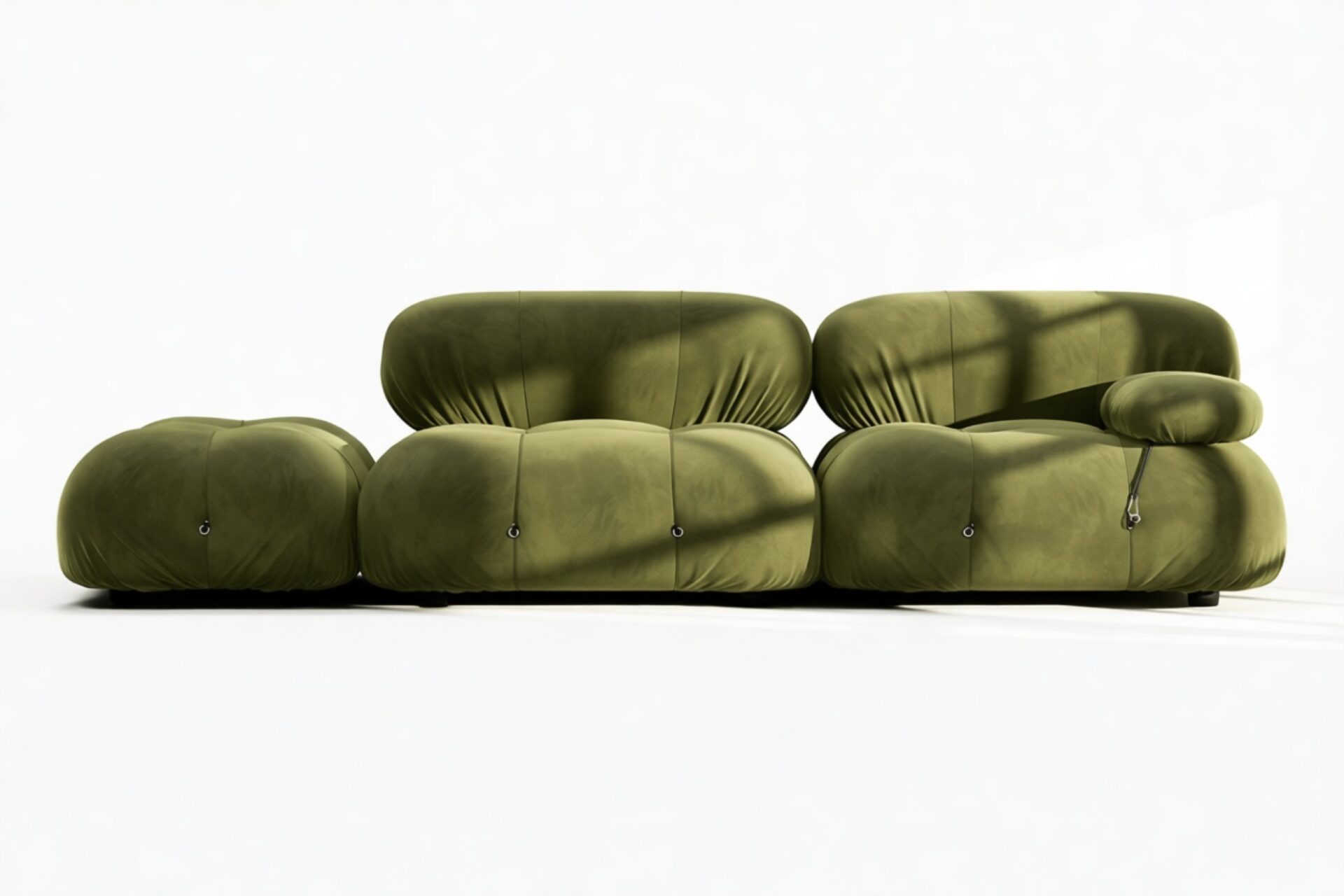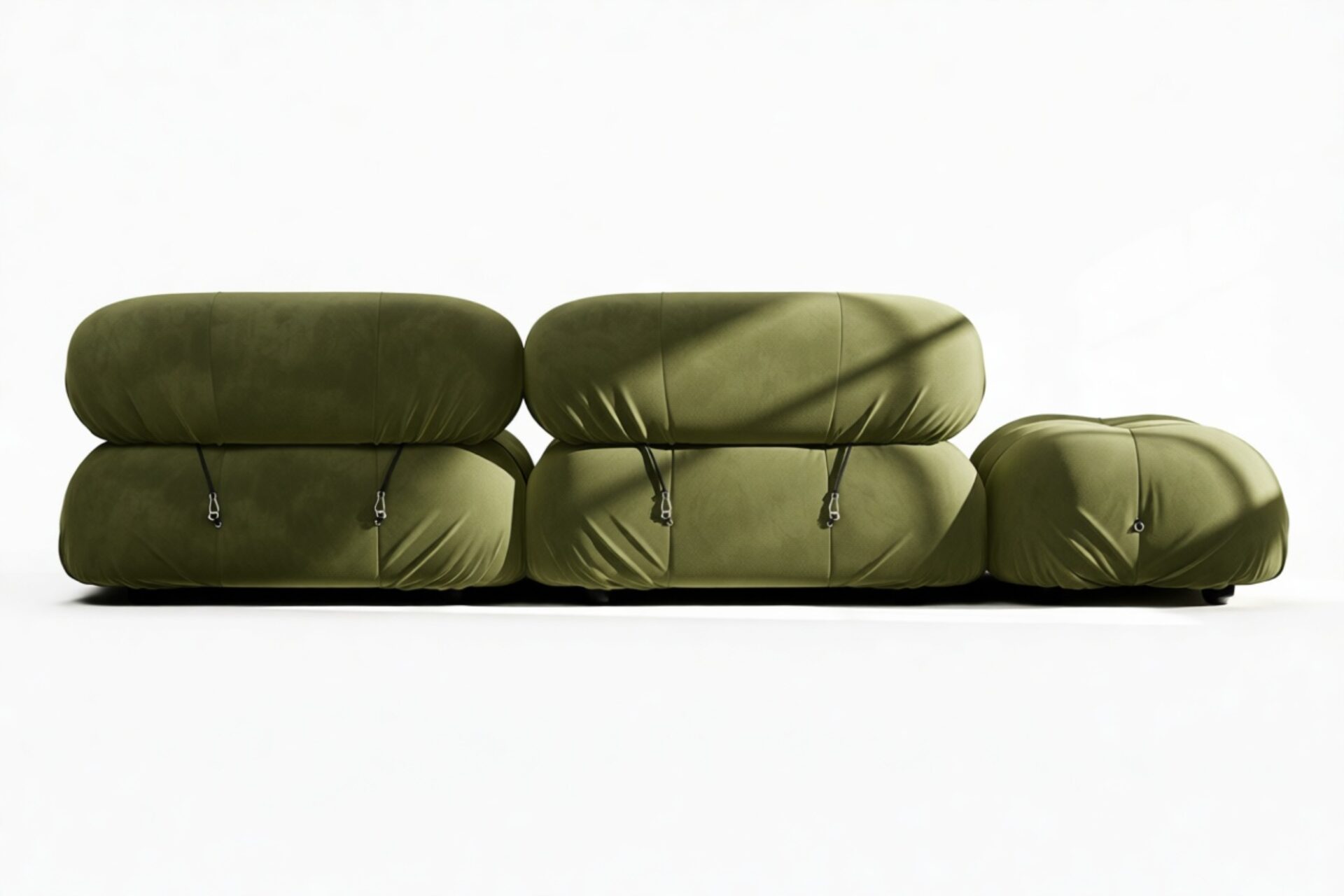 - Modular Instructions: Each section of the Mario Bellini Sofa is modular and is attached with string ties and carabiners. To assemble or rearrange your sofa, simply unclip the carabiners from one ring and attach to a corresponding ring on the module you wish to connect to.